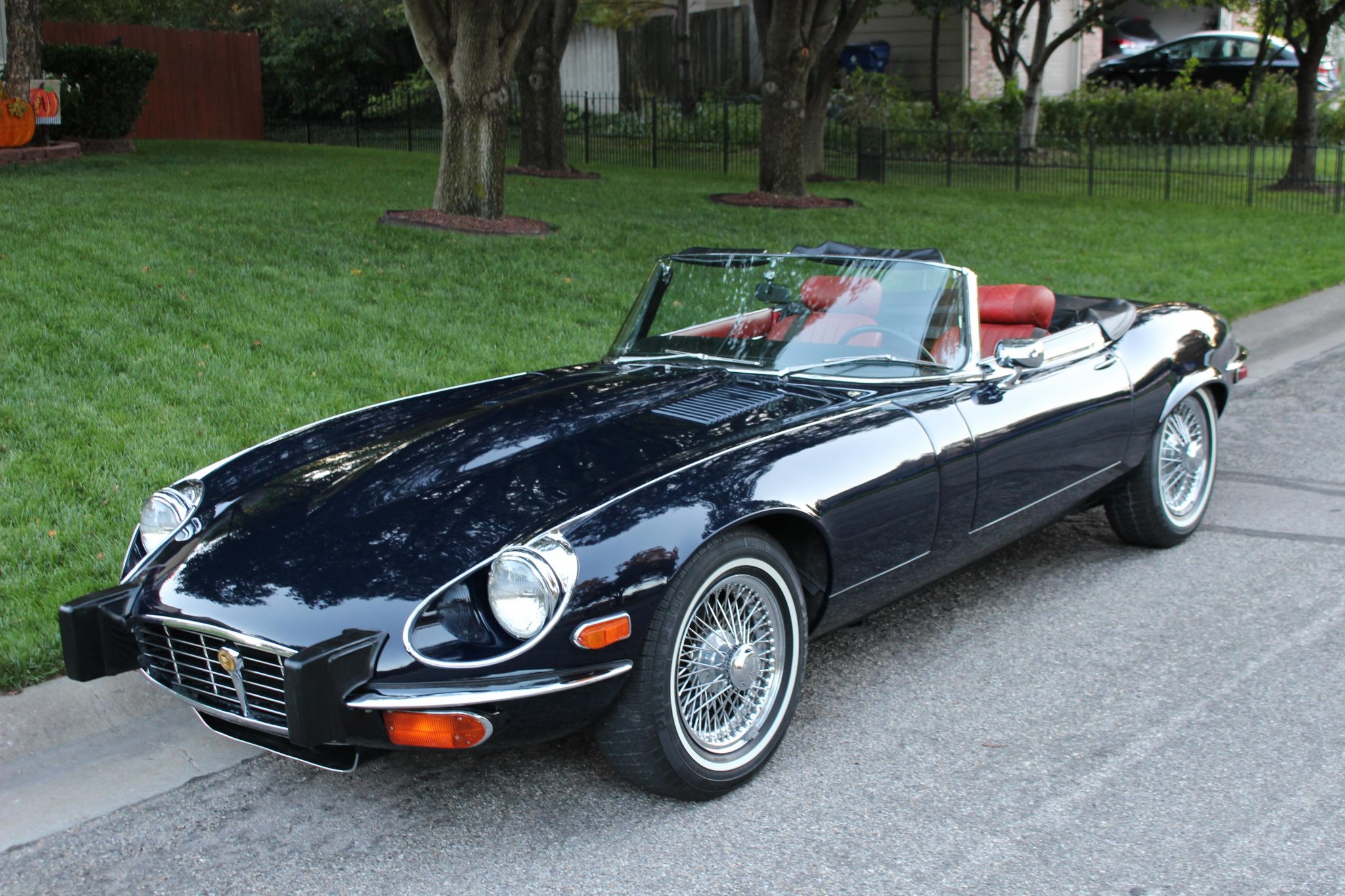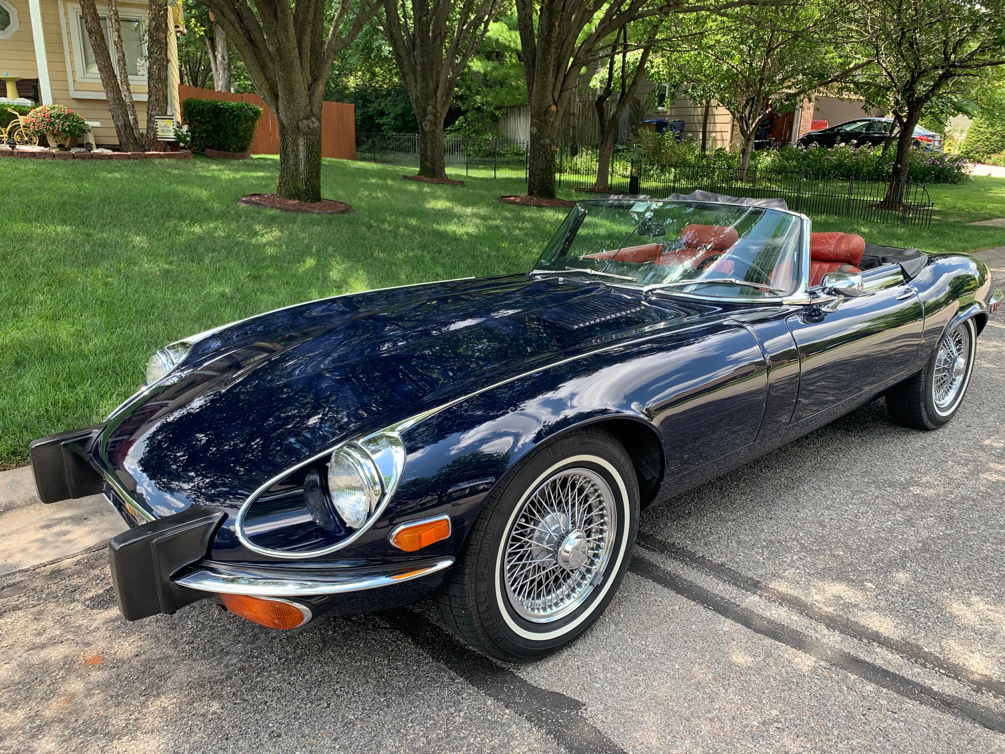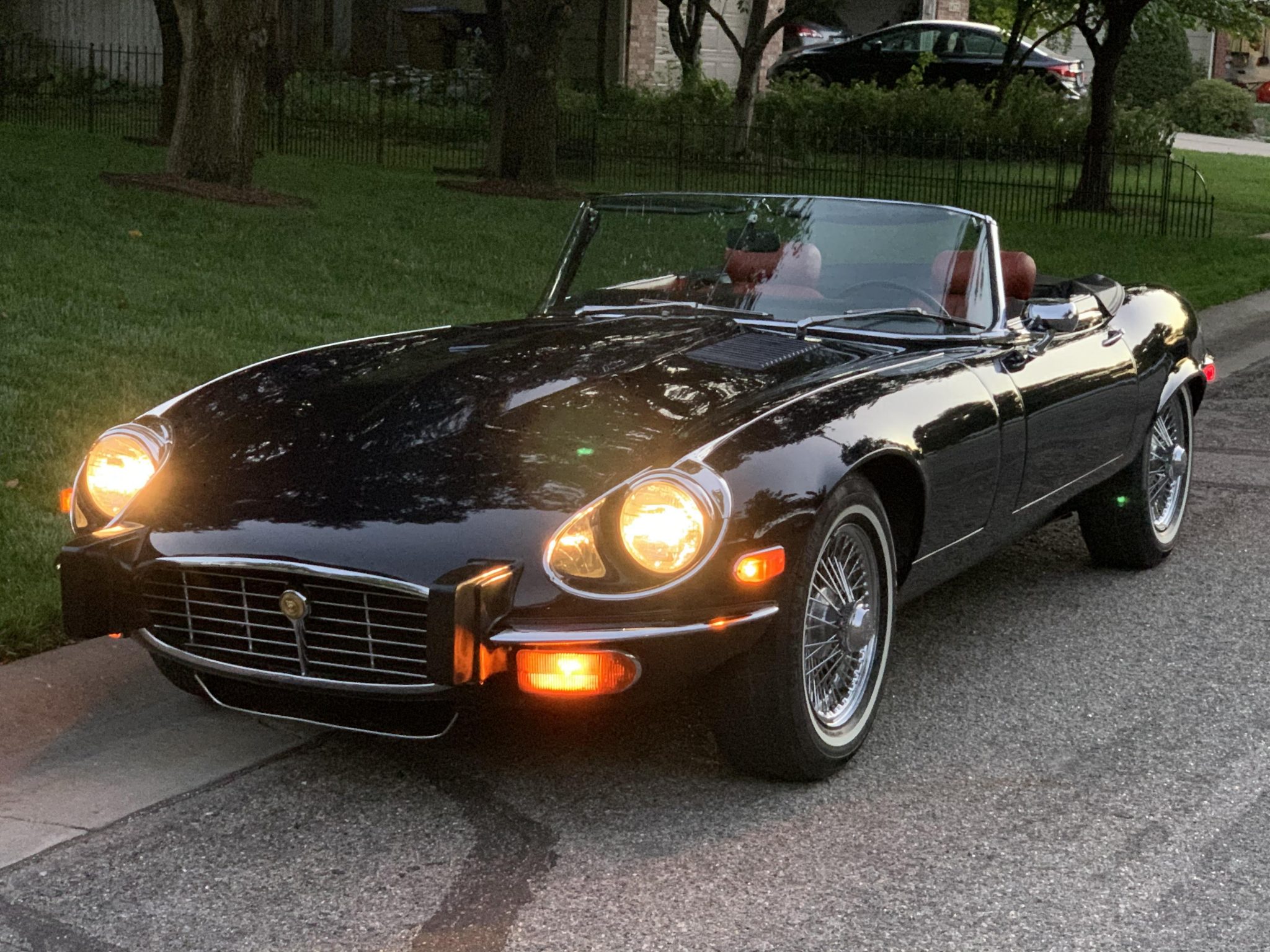 Factory 15″ wire wheels wear Pirelli P300 whitewall tires. Four-wheel disc brakes came standard, along with independent front and rear suspension. A full-size spare resides in the trunk along with the factory jack, and the black boot cover is shown fitted above. The seller notes that the parking brake is inoperable.