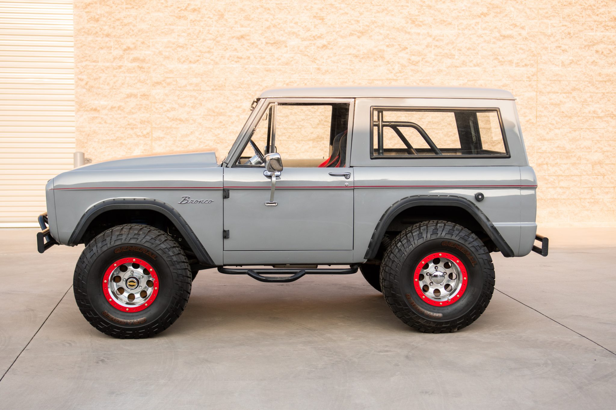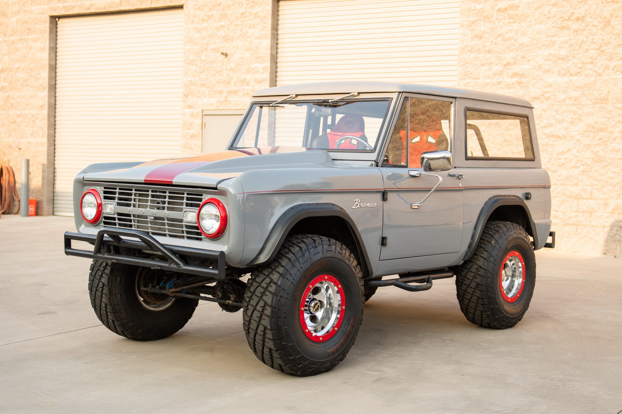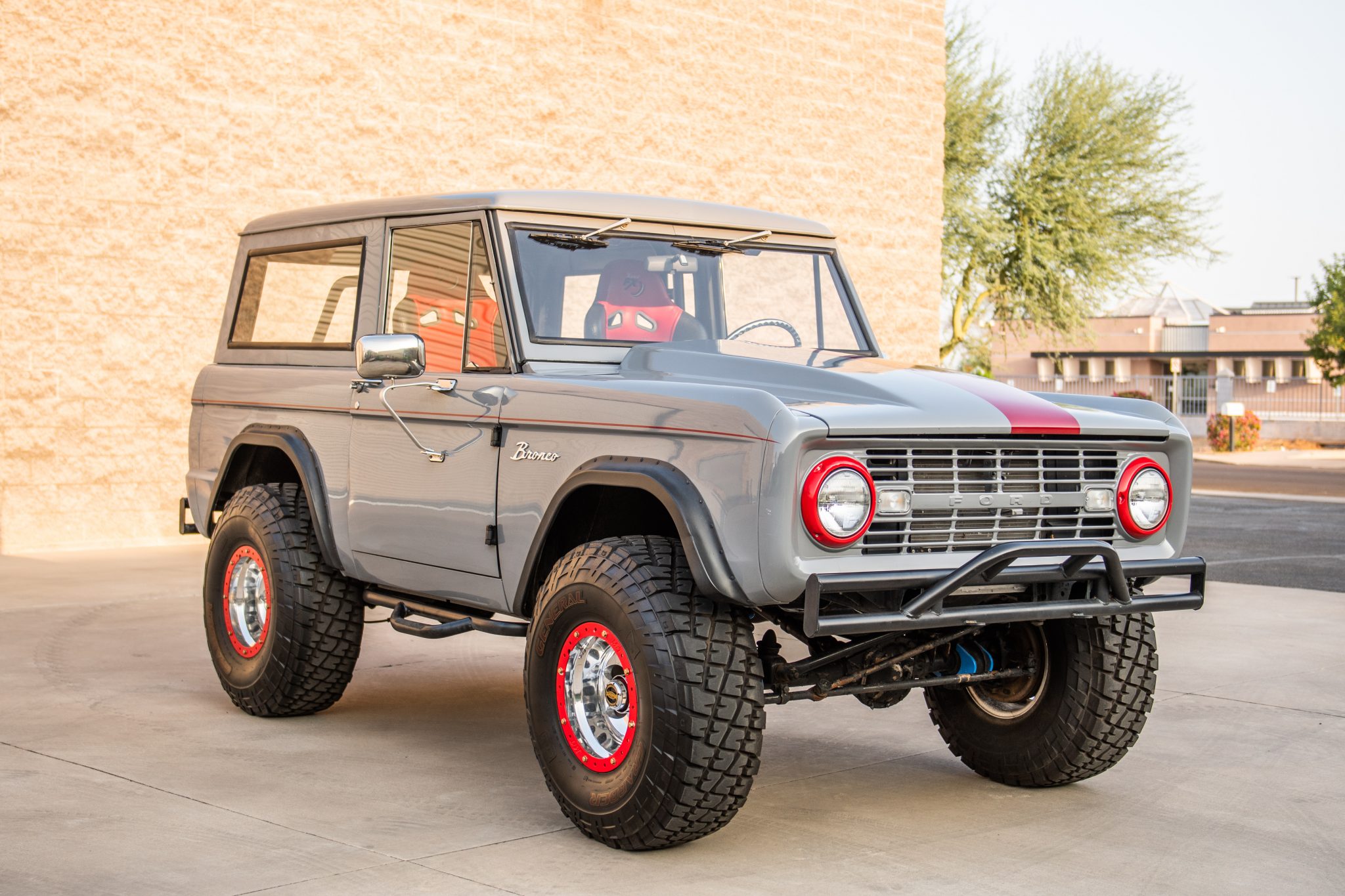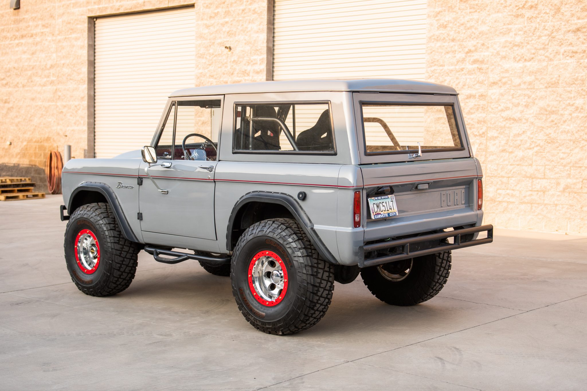 The truck rides on a James Duff suspension lift and 15″ Mickey Thompson Baja-style wheels with bead-lock rims wearing 35″x12.5″ General Grabber tires. Manually-locking Warn hubs are fitted up front, and the seller adjusted the steering box.