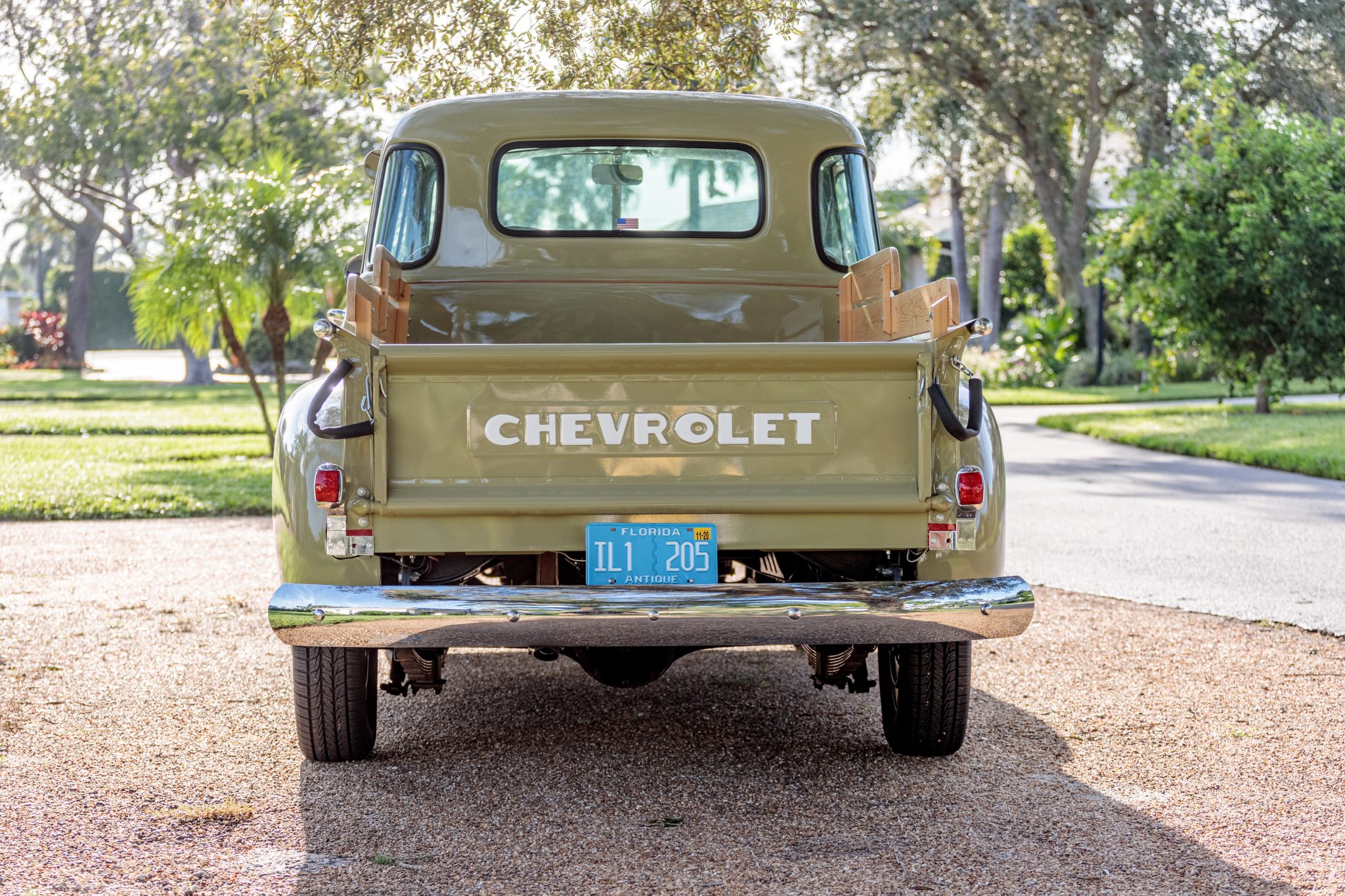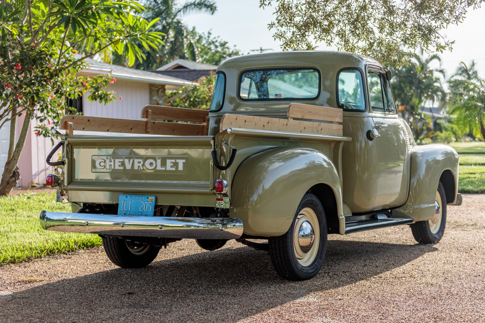 Off-white 16″ steel wheels with red pinstriping and Chevrolet hubcaps are wrapped in 205/70 General Altimax RT43 tires. The seller states that the brake master cylinder has been replaced, and notes that the truck does not have a parking brake cable installed.