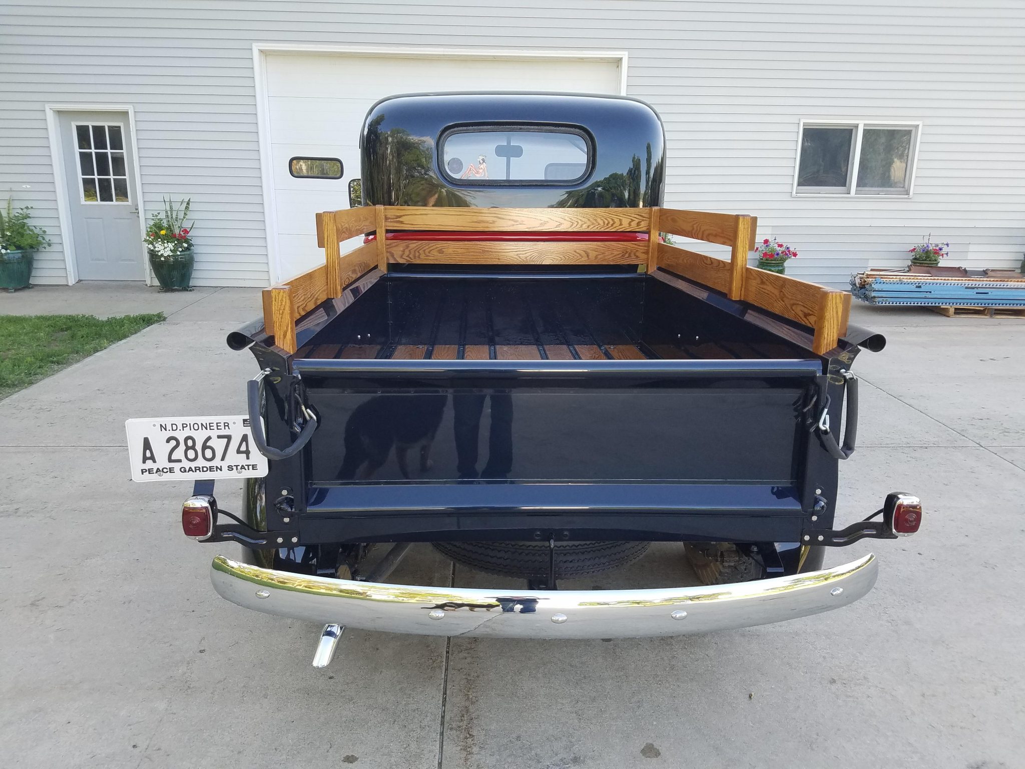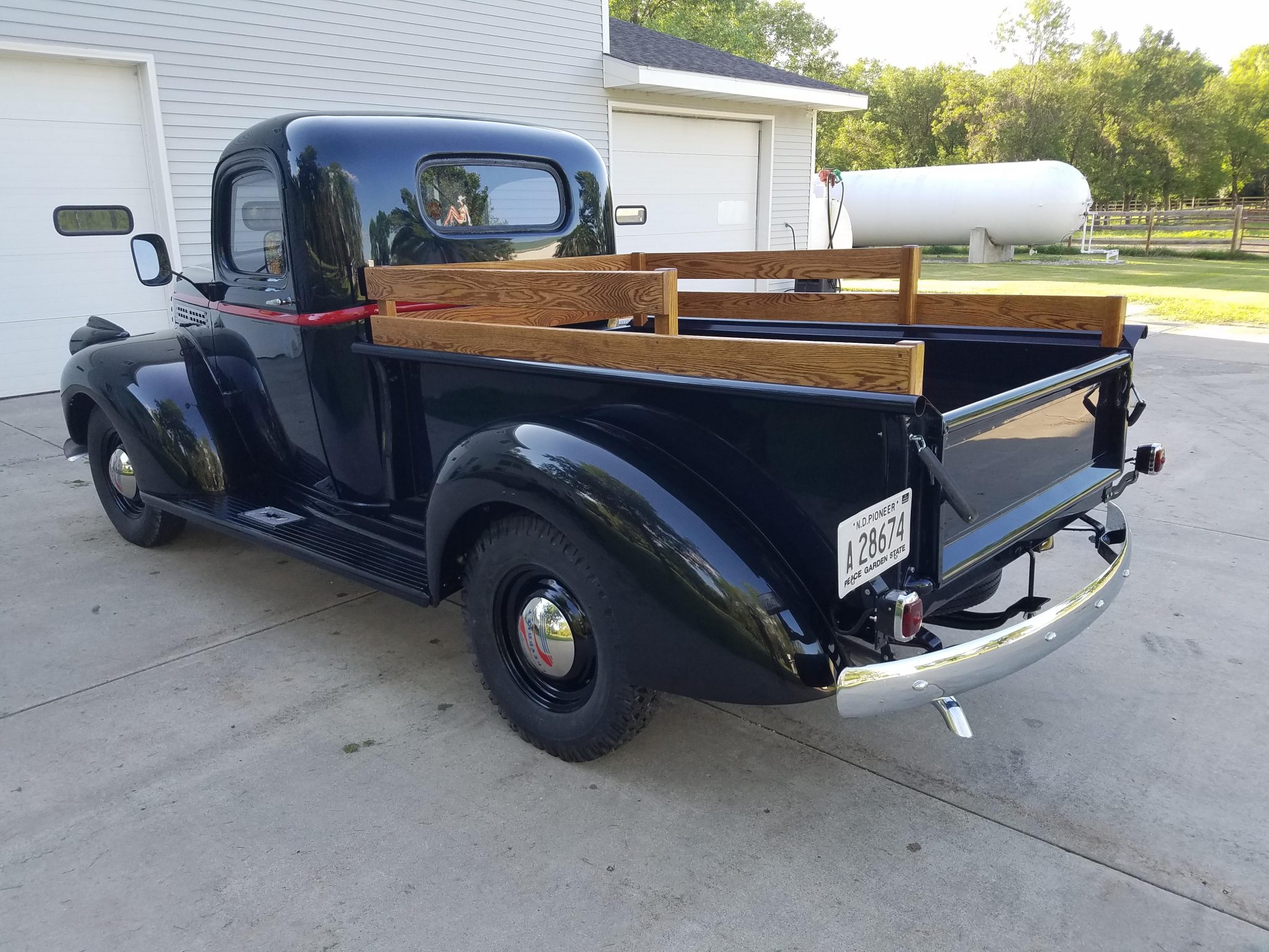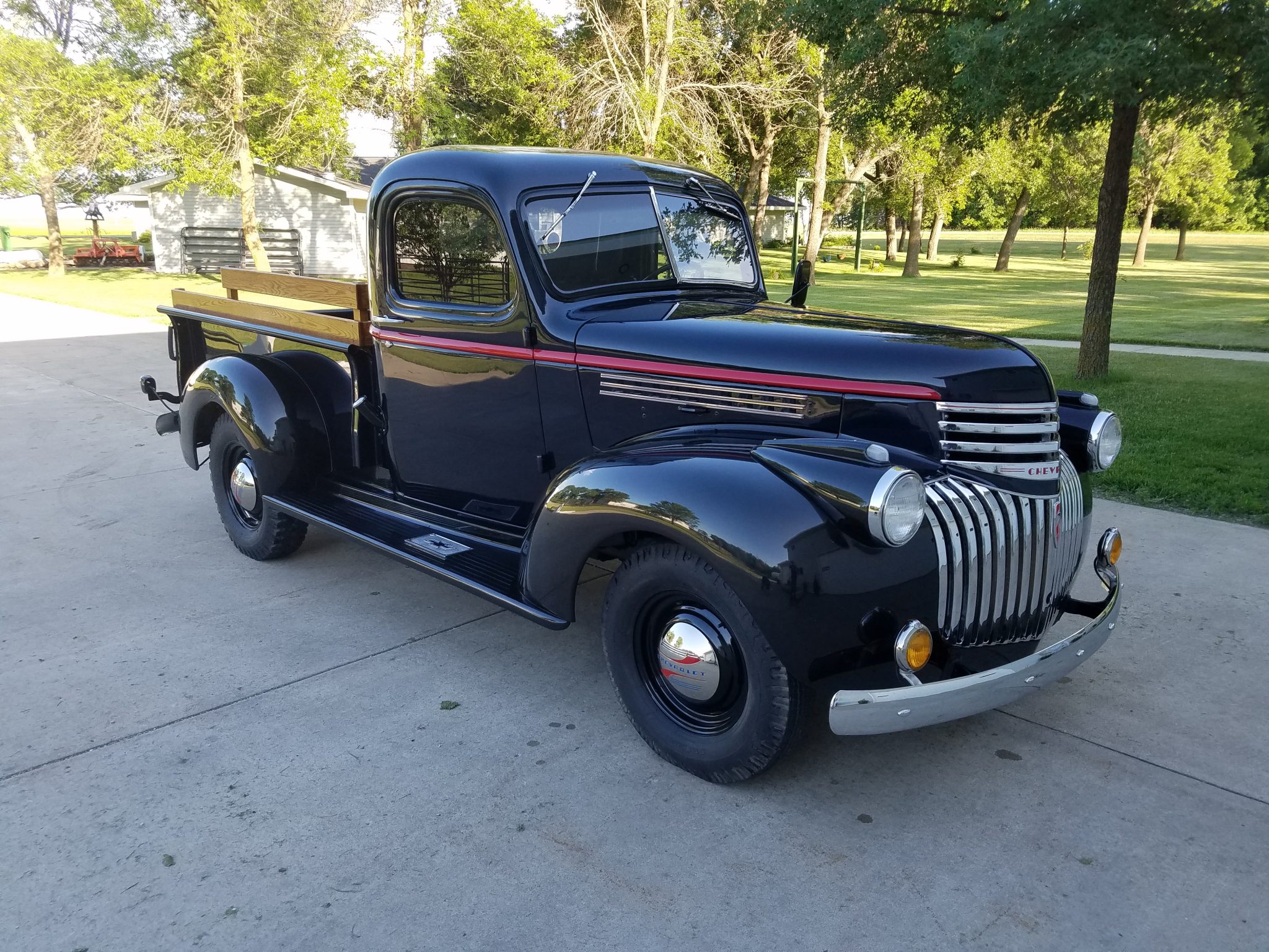 Details include a single rearview mirror, running boards with Chevrolet step plats, dual taillights, and turn signals. The bed features stained plank flooring separated by strips painted to match the body as well as matching stake sides. The truck rides on a 115″ wheelbase, and body-colored steel wheels wear chrome hubcaps and older bias-ply tires.