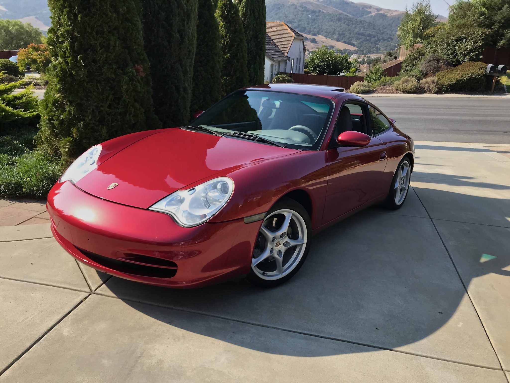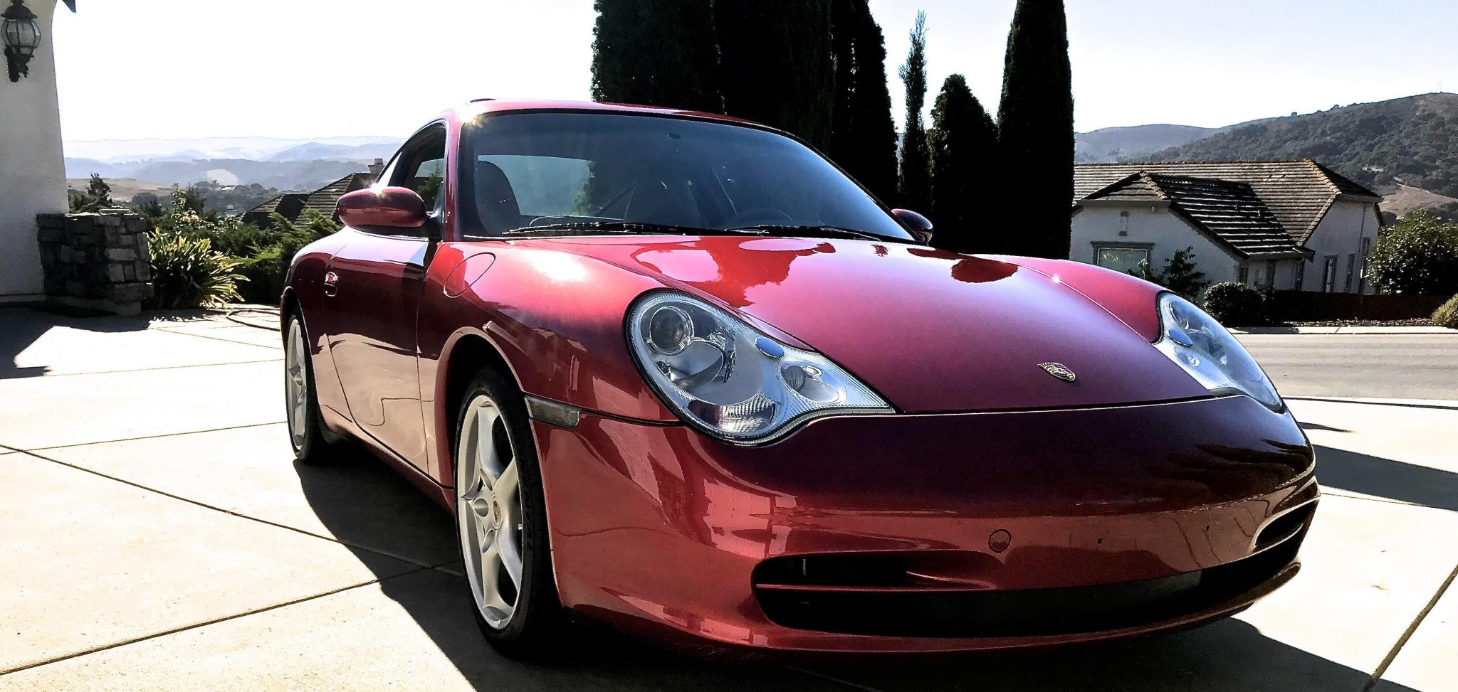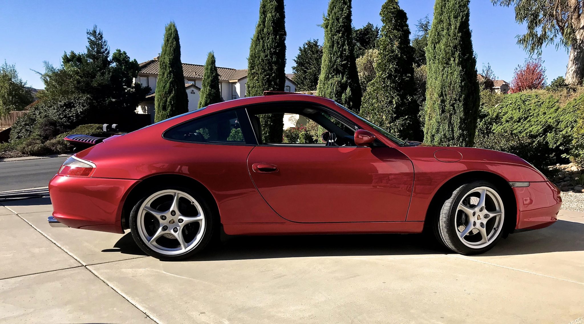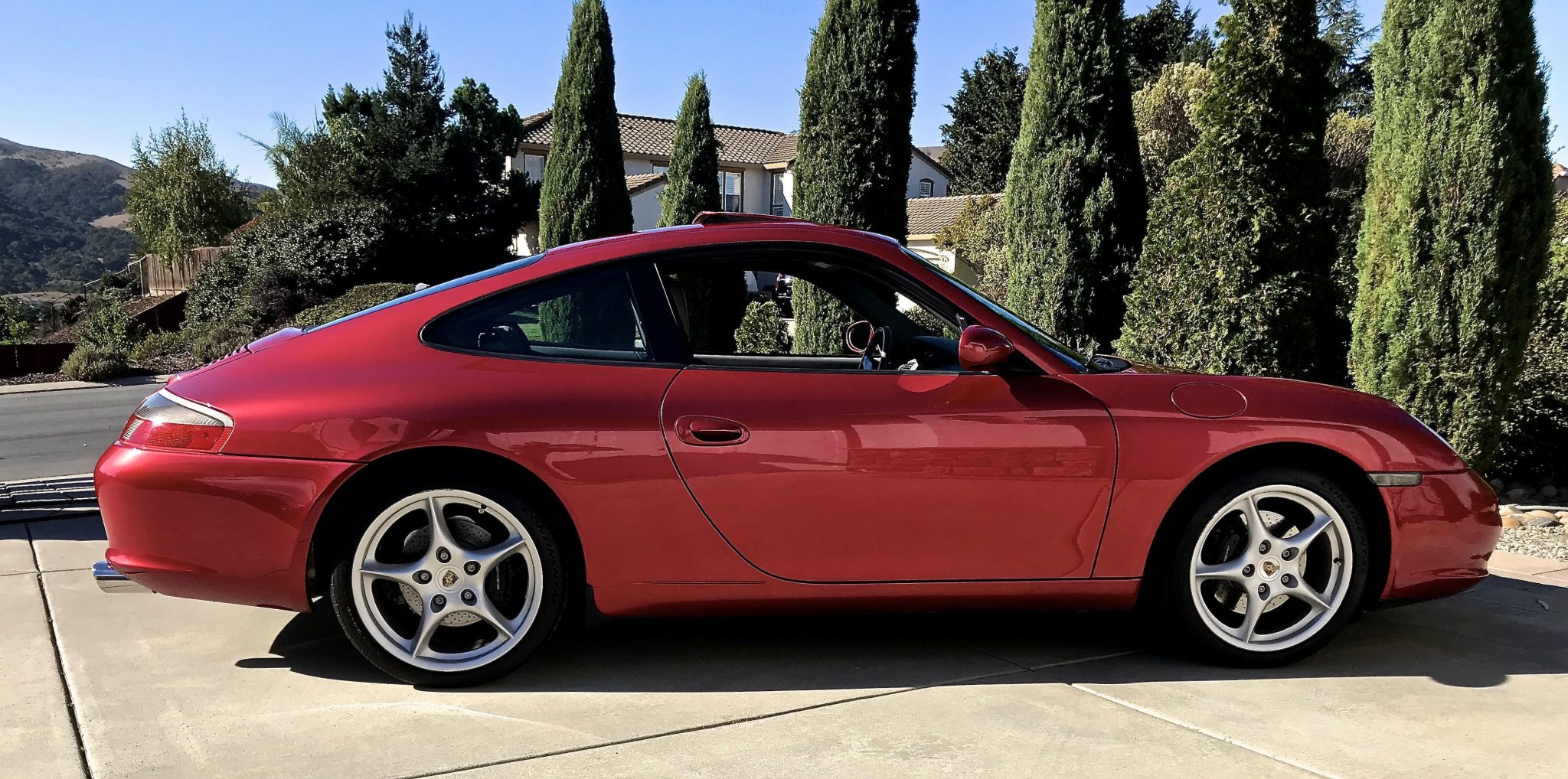 Optional 18″ Carrera five-spoke wheels have colored Porsche-crest center caps and wear Continental tires. Cross-drilled brake rotors are fitted at all four corners, and the car is equipped with Porsche Stability Management. Curb marks are noted on the wheel lips.