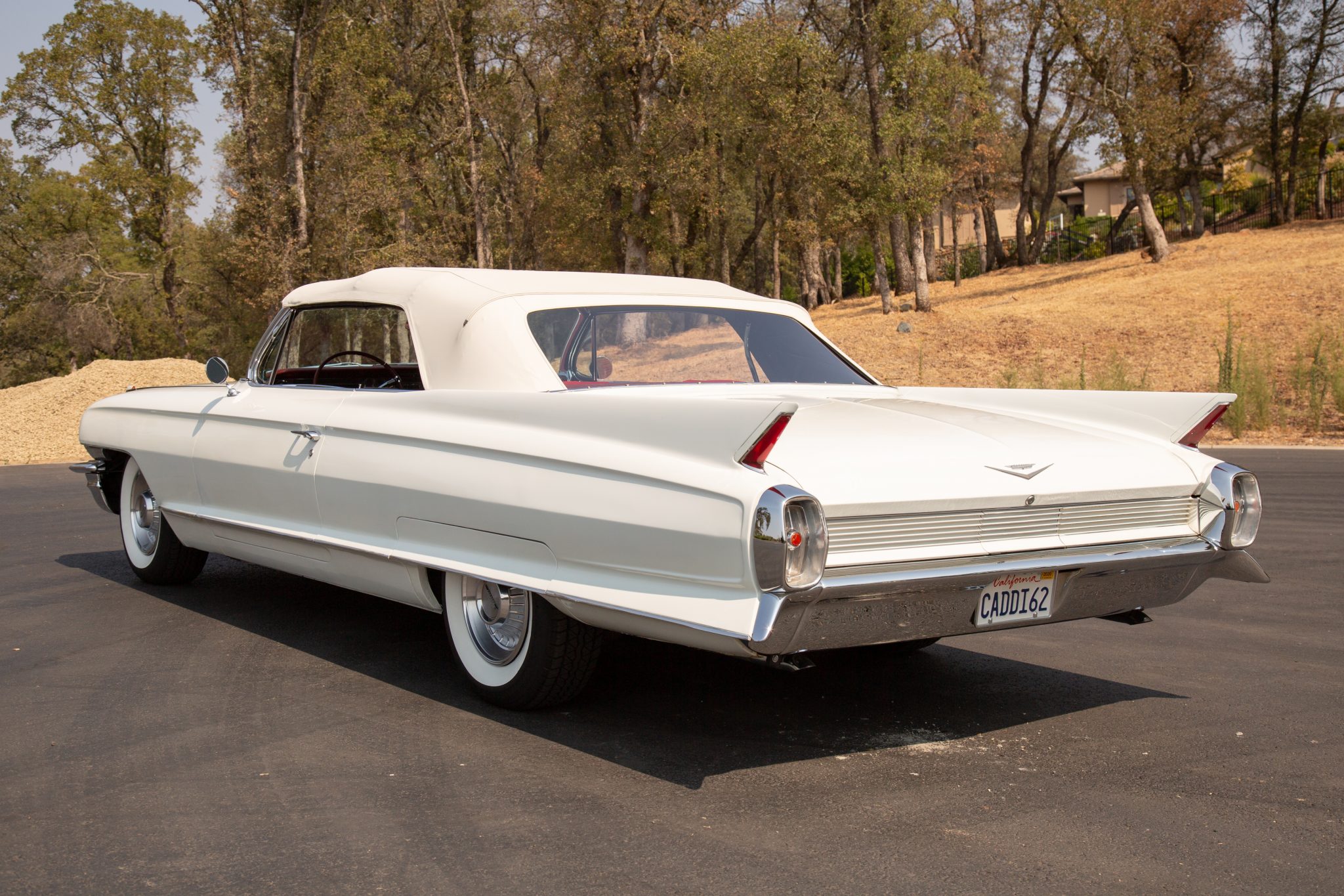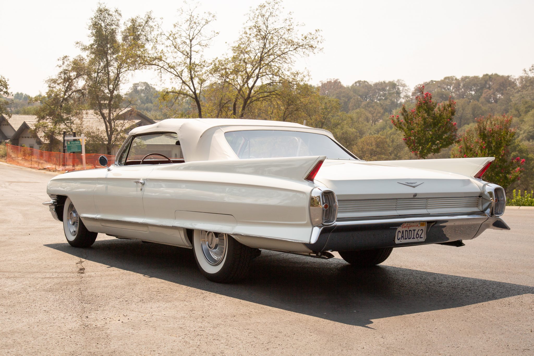 Steel wheels with Cadillac covers are wrapped in BFGoodrich Silvertown whitewall tires. The seller reports that the brake drums and shoes were replaced in Summer 2020.