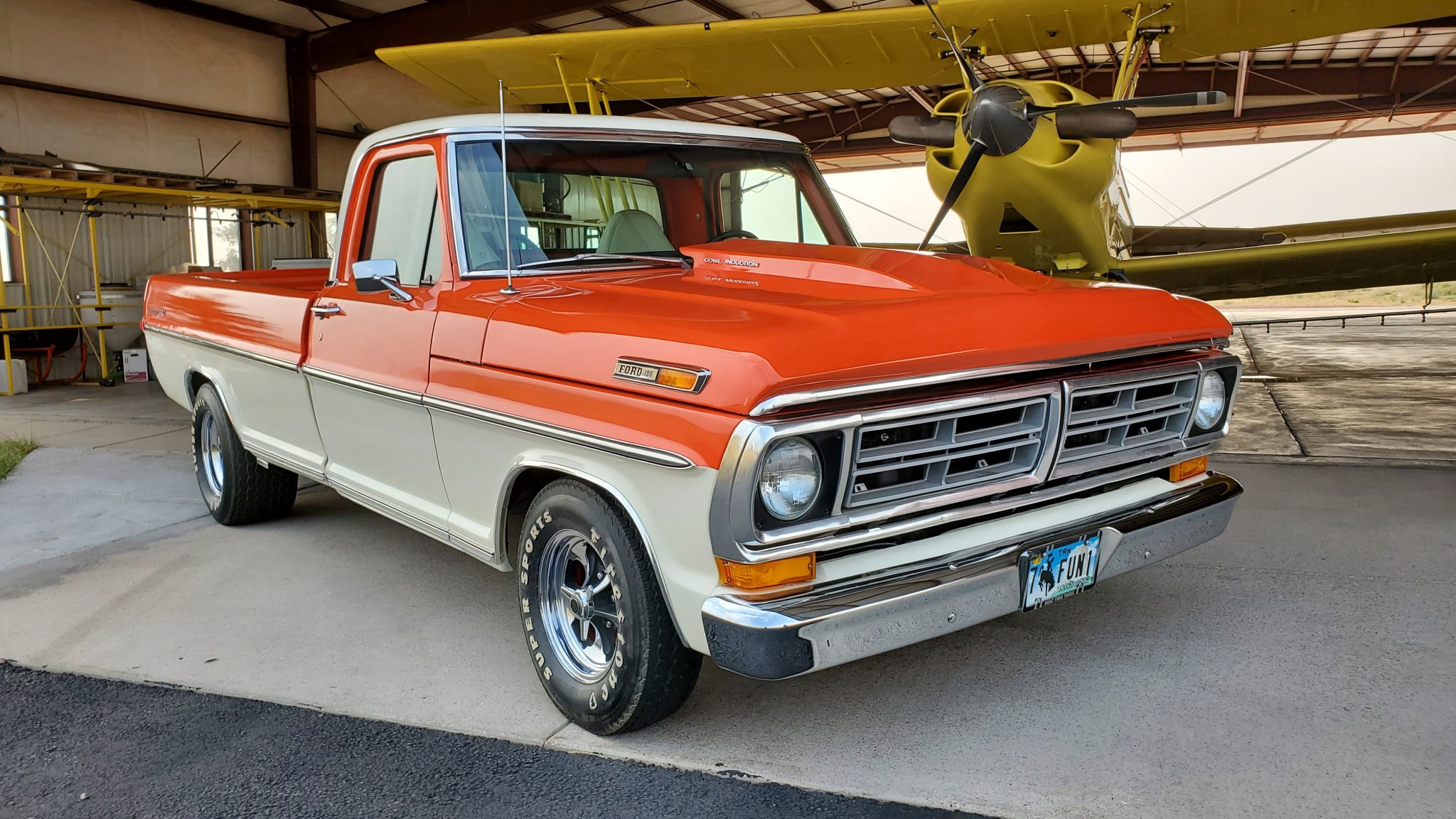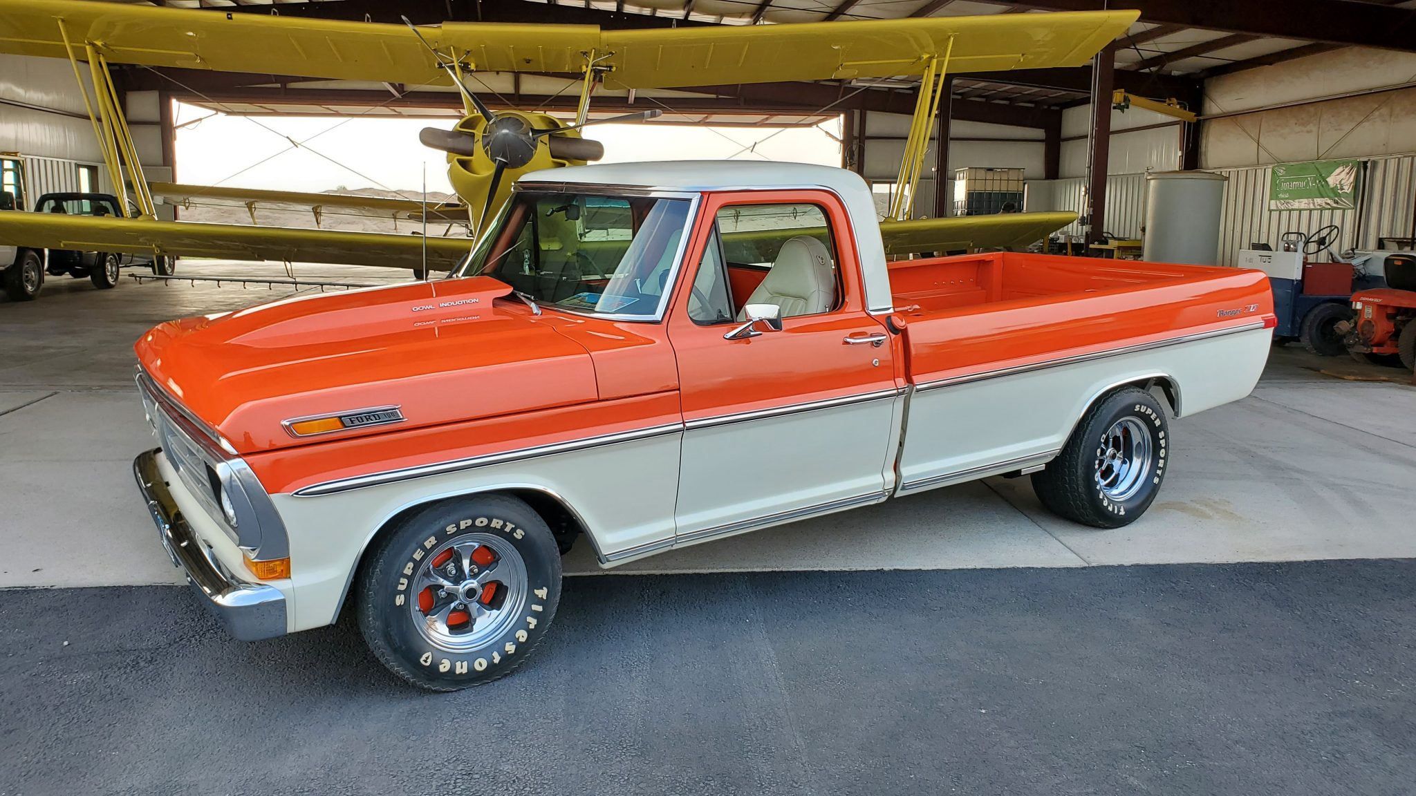 Aftermarket 14″ and 15″ aluminum wheels wear simulated knock-off center caps and are mounted with Firestone Super Sports bias-ply tires in sizes F70-14 in front and N50-15 at the rear. Braking is handled by dual-circuit four-wheel drums, and the ride height has been lowered with the use of 4″ drop axles and a 4″ rear lowering kit.