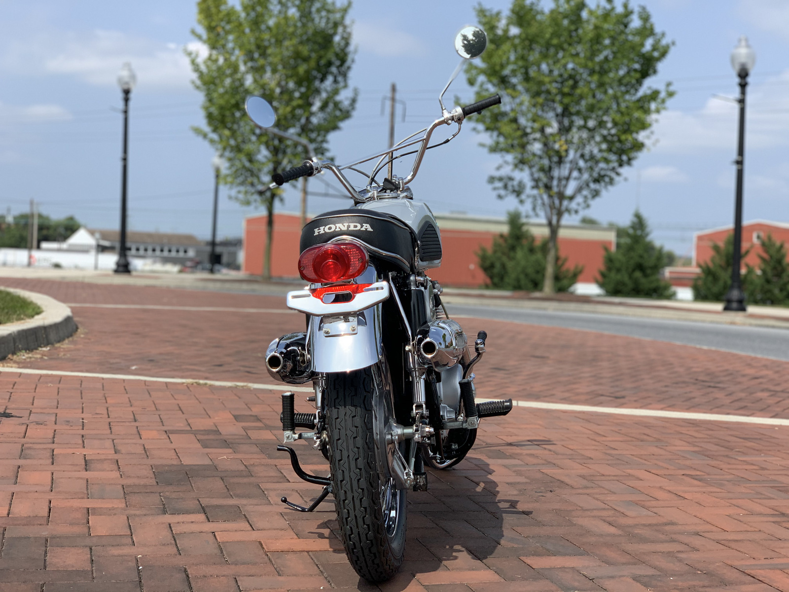 Chrome wire-spoke 18″ wheels wear Dunlop tires. Suspension is from a conventional fork with full-length tube covers and a rear swingarm featuring dual covered shocks. Braking is from integrated drums at both ends, with the front featuring a twin leading-shoe design.