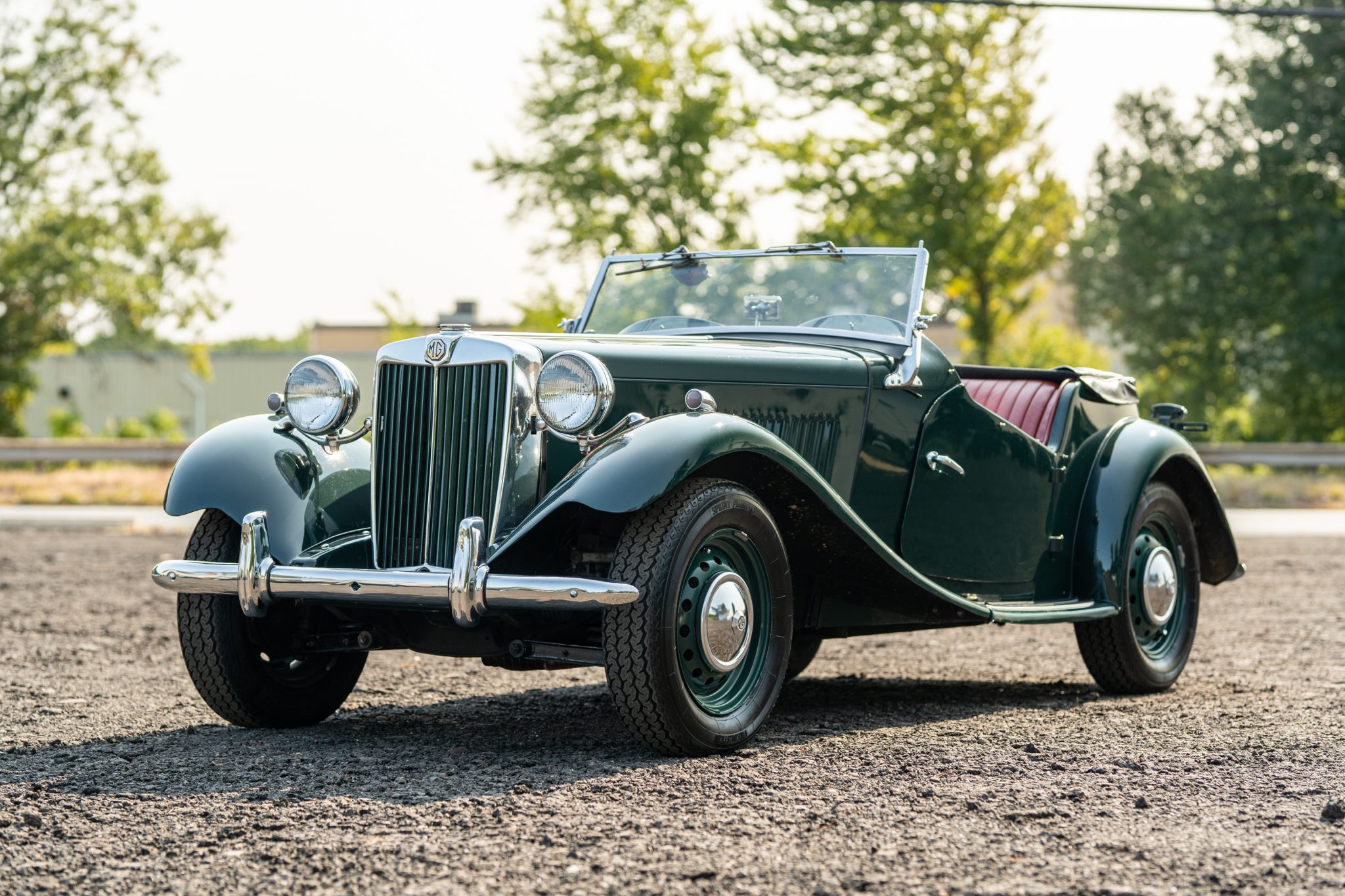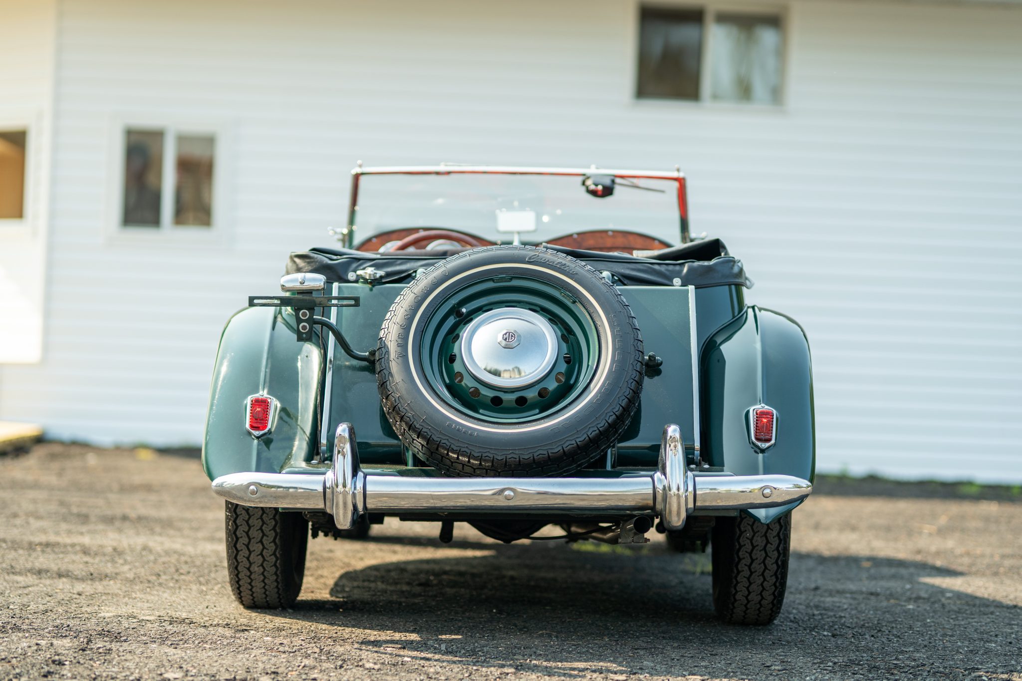 Color-matched 15″ steel wheels with chrome MG hubcaps are wrapped in 165-series Vredestein Sprint Classic tires said to have been replaced during current ownership, including the rear-mounted 165-series Firestone Cavallino spare. The wheel cylinders were serviced in December 2018.