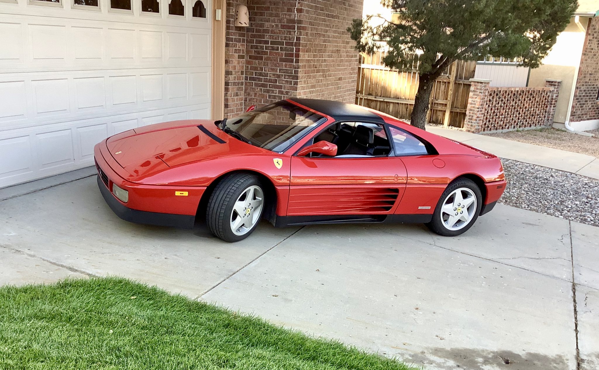 Factory 17″ five-spoke alloy wheels are mounted with Continental ExtremeContact DW Tuned tires. Braking is handled by Ferrari-branded calipers.