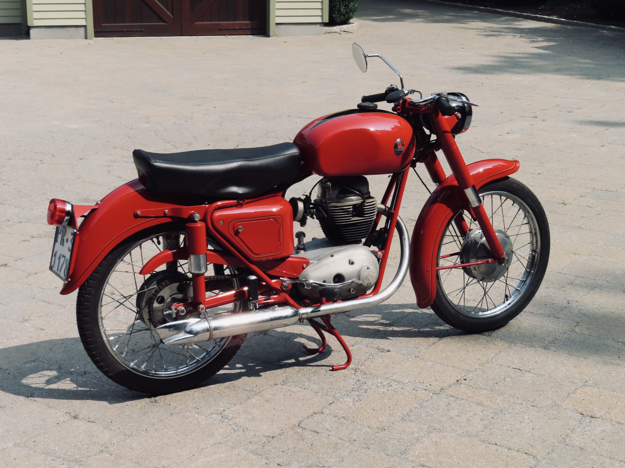 Chrome wire-spoke 19″ wheels feature integrated drum brakes and wear older Pirelli tires. Suspension is from a conventional fork and a swingarm mounted to dual enclosed shocks.