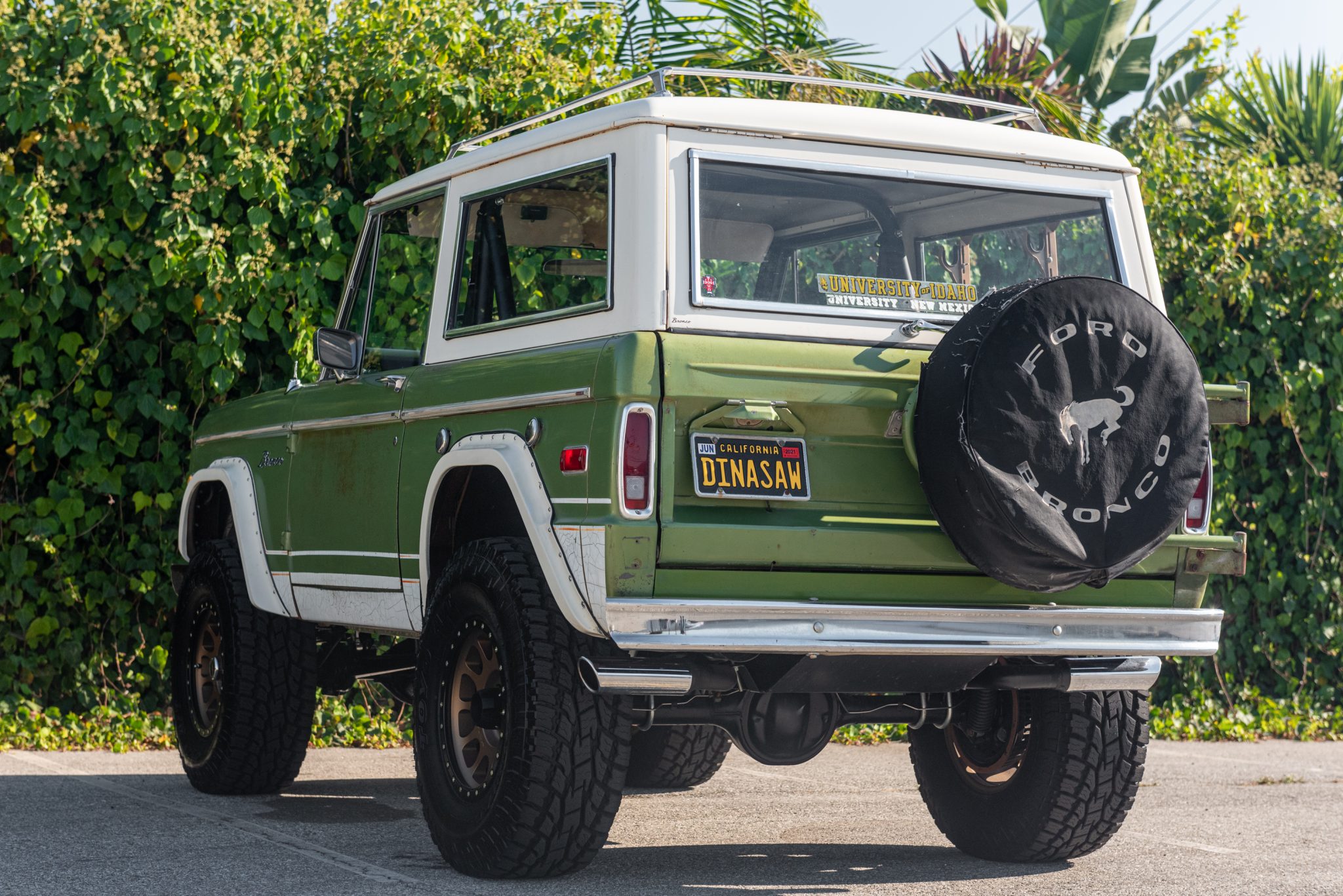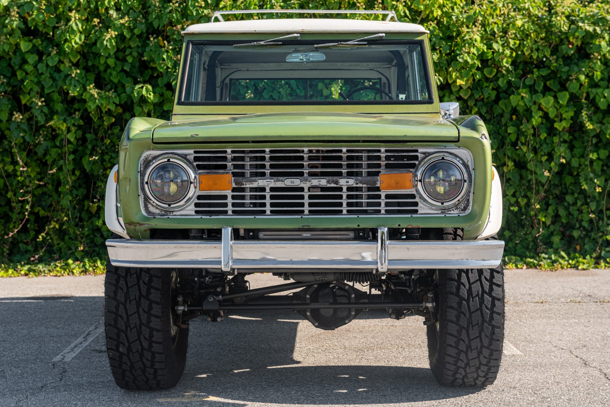 17″ Method Race NV305 wheels are finished in Bronze and are wrapped in 35×12.5″ Toyo Open Country A/T II tires. Suspension modifications include a 2.5″ lift with variable rate coil springs, Bilstein 7120 reservoir-style front shocks, and Bilstein 5100 rear shocks. Braking is handled by a Tom’s Bronco Parts 8″ booster and master cylinder along with front drilled and slotted discs, 11″ rear drums, and stainless brake lines. Power-assisted steering is via a Borgeson quick-ratio steering box, an adjustable track bar, and custom steering linkage with heim ends.