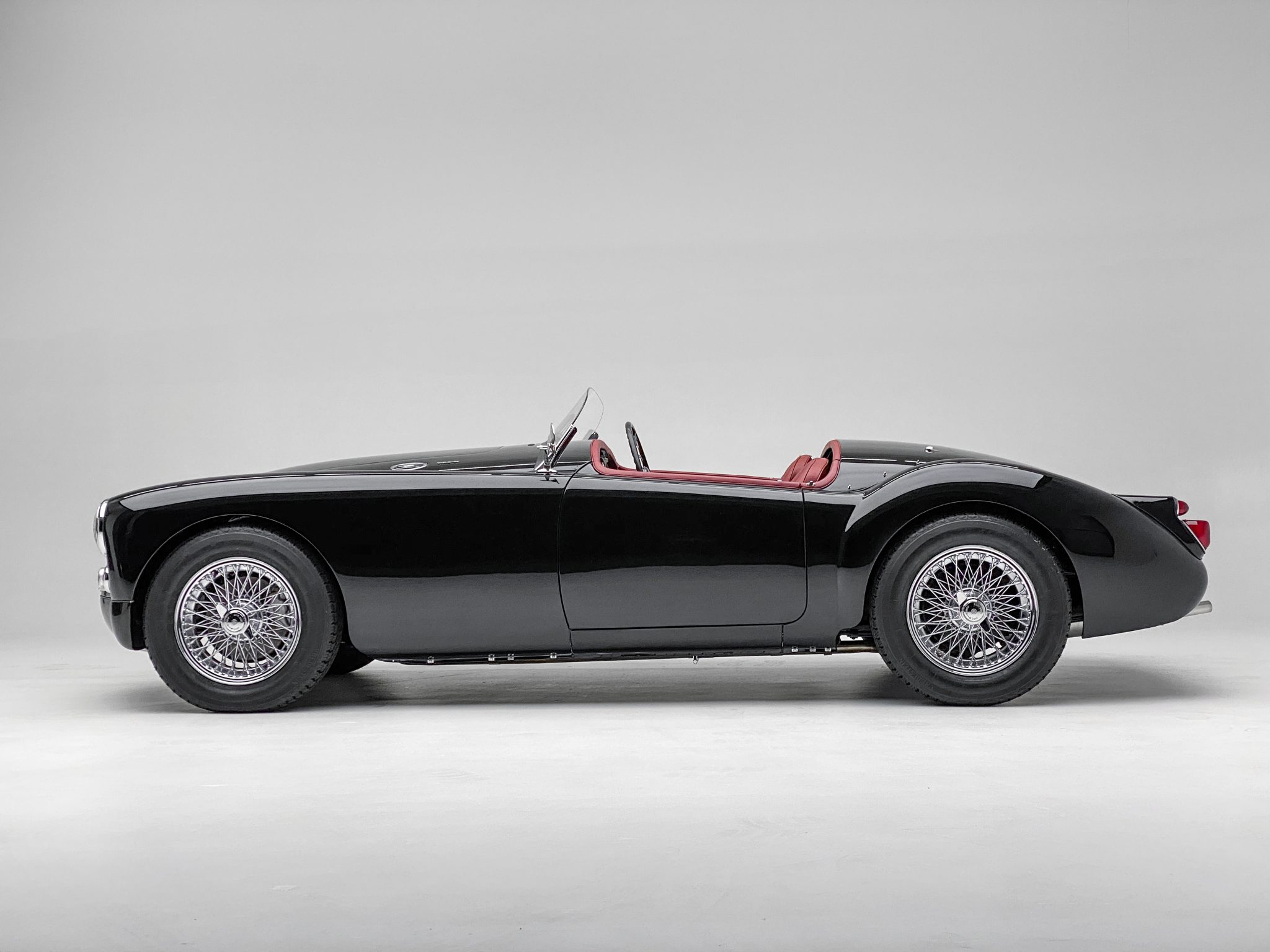 Chrome-finished 15″ wire wheels are secured with two-eared knock-offs and wear Vredestein Sprint Classic tires. During the restoration the frame was disassembled, painted black, and fitted with new suspension bushings, hubs, bearings, and shocks. The brake system was also overhauled and is equipped with discs up front and drums out back.