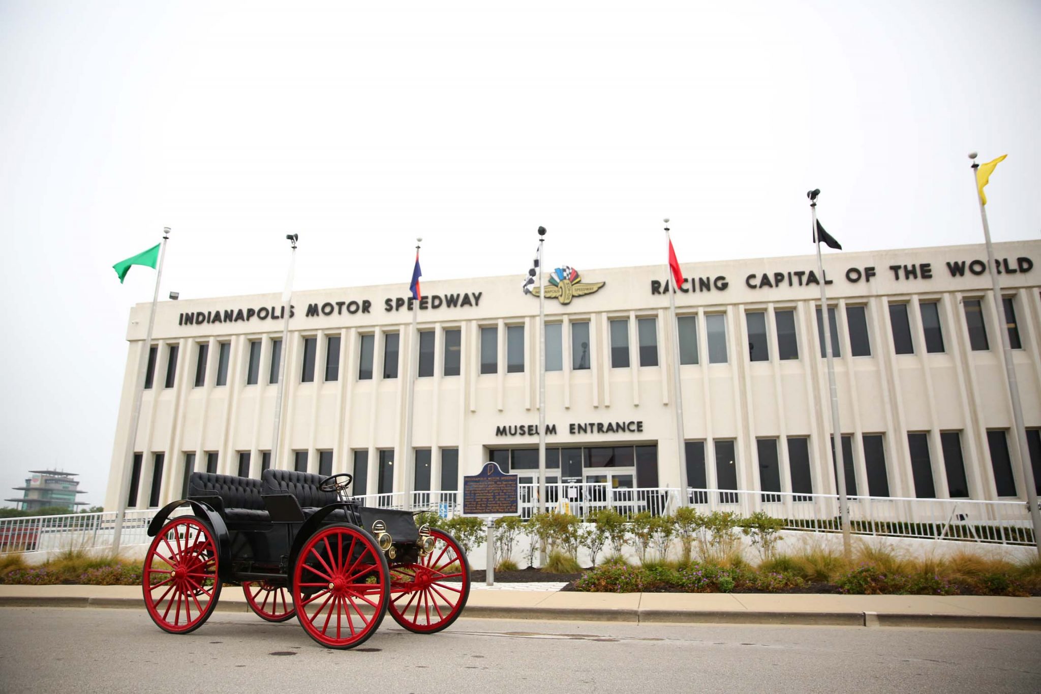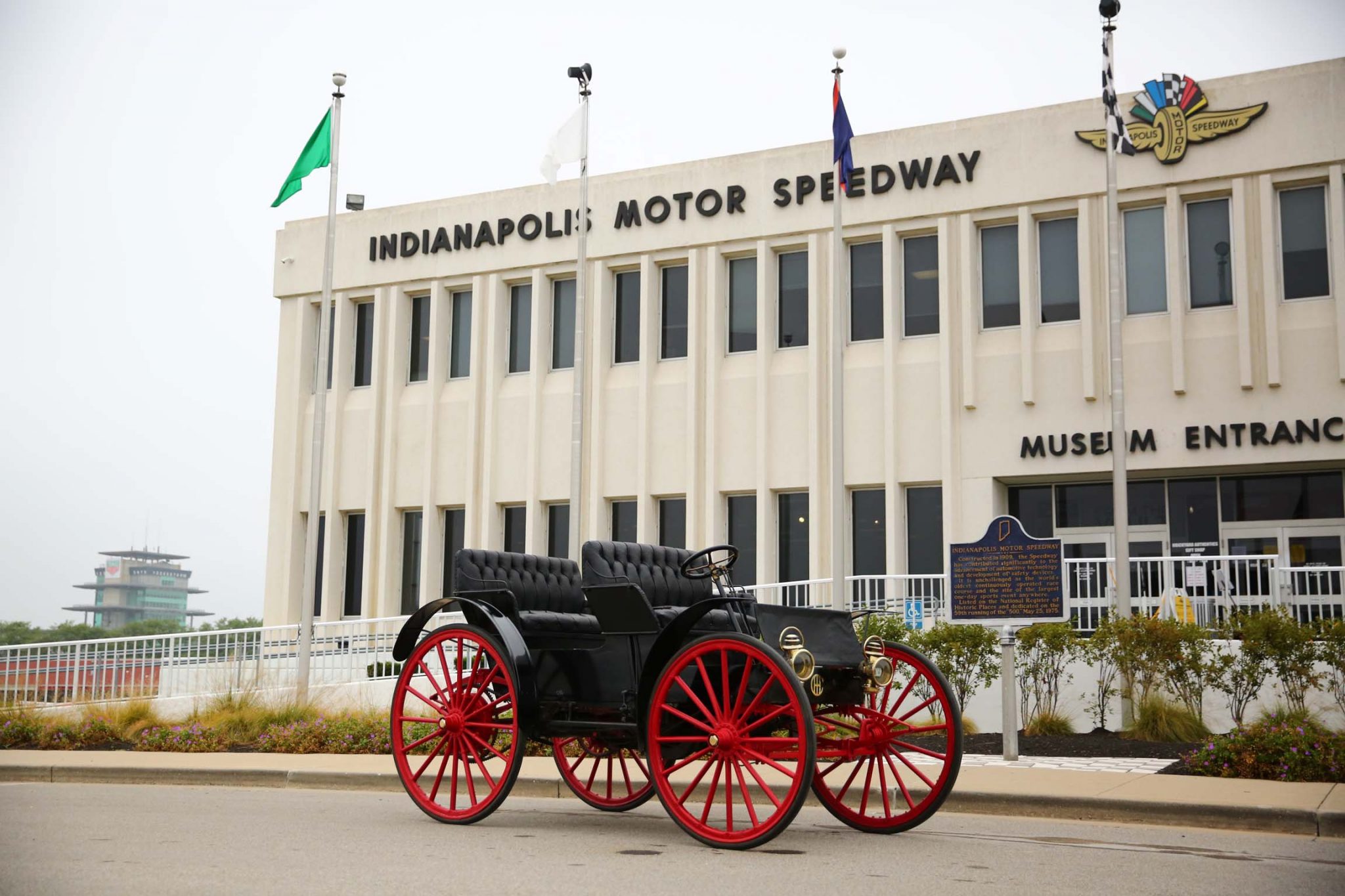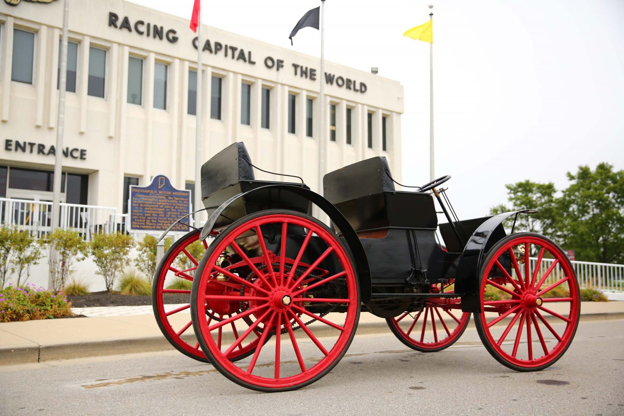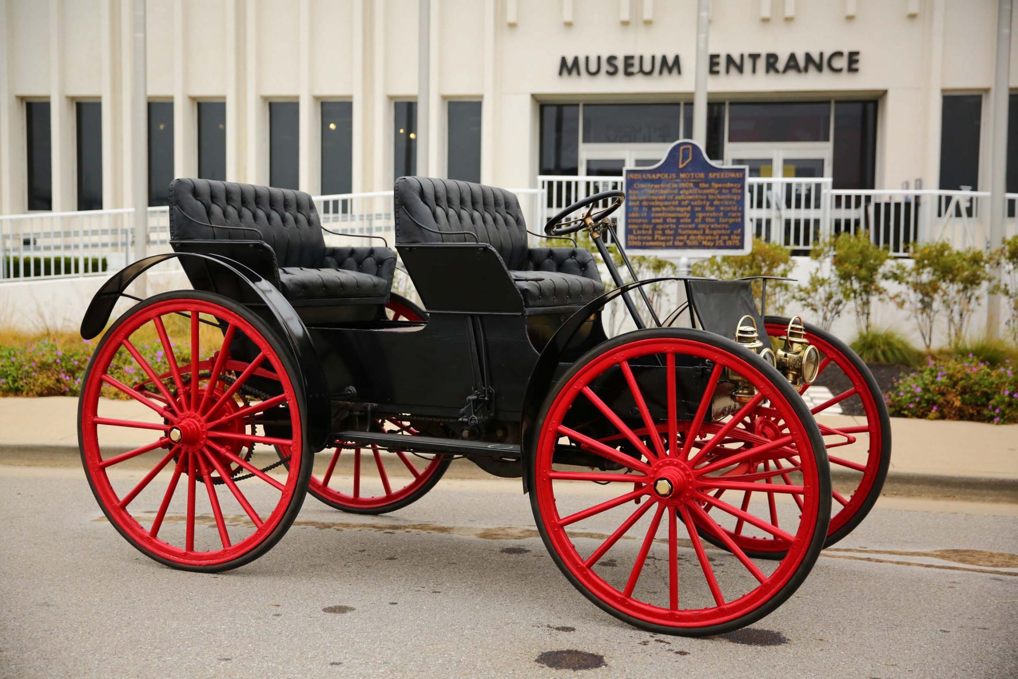 Red 16-spoke wood wheels are mounted with older solid rubber tires. The car is equipped with fully-elliptical leaf springs all around as well as dual mechanical rear brakes, the latter of which were adjusted in preparation for the sale.