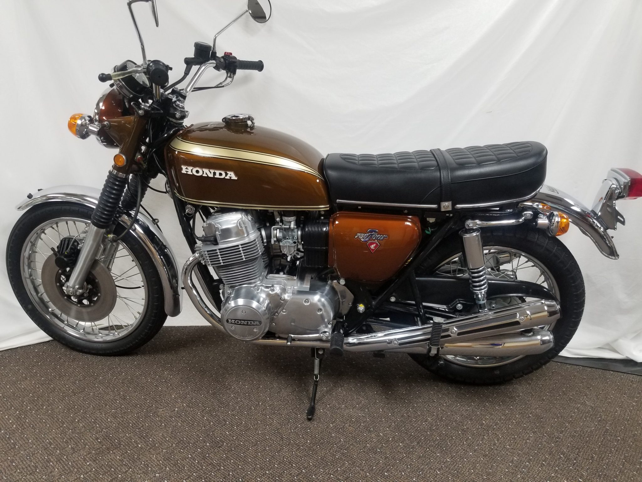 The fuel tank, side covers, headlight bucket, and headlight ears are finished in metallic brown, with the former featuring gold and black stripe decals. Equipment consists of a two-up seat with a passenger grab strap, both center and side stands, and fork-mounted reflectors as well as chrome fenders, turn signal housings, and seat trim. The selling dealer notes a missing front fender stay, a scratch on the left fuel tank decal, rust inside the tank, and paint peeling from the top triple clamp.