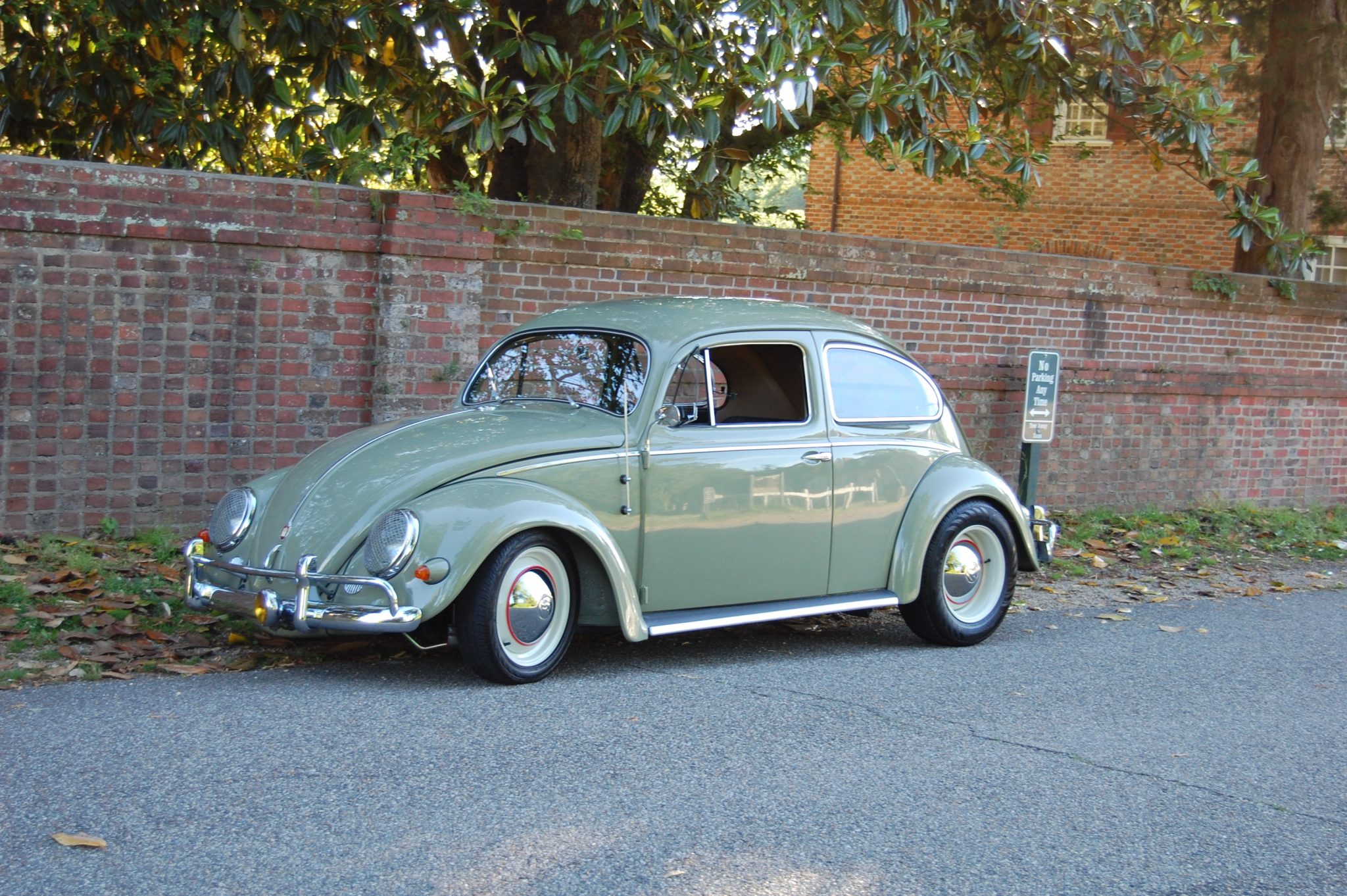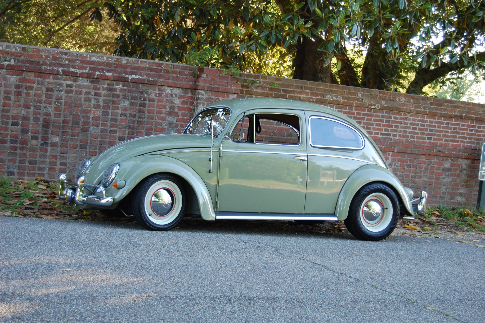 Staggered-width 15″ steel wheels wear polished hubcaps and are mounted with Continental tires. The front suspension has been modified with a narrowed and adjustable front beam paired with drop spindles and an added sway bar, while the rear suspension has been re-indexed. A dual master brake cylinder and stainless steel lines have been installed, and each corner is equipped with factory drum brakes.