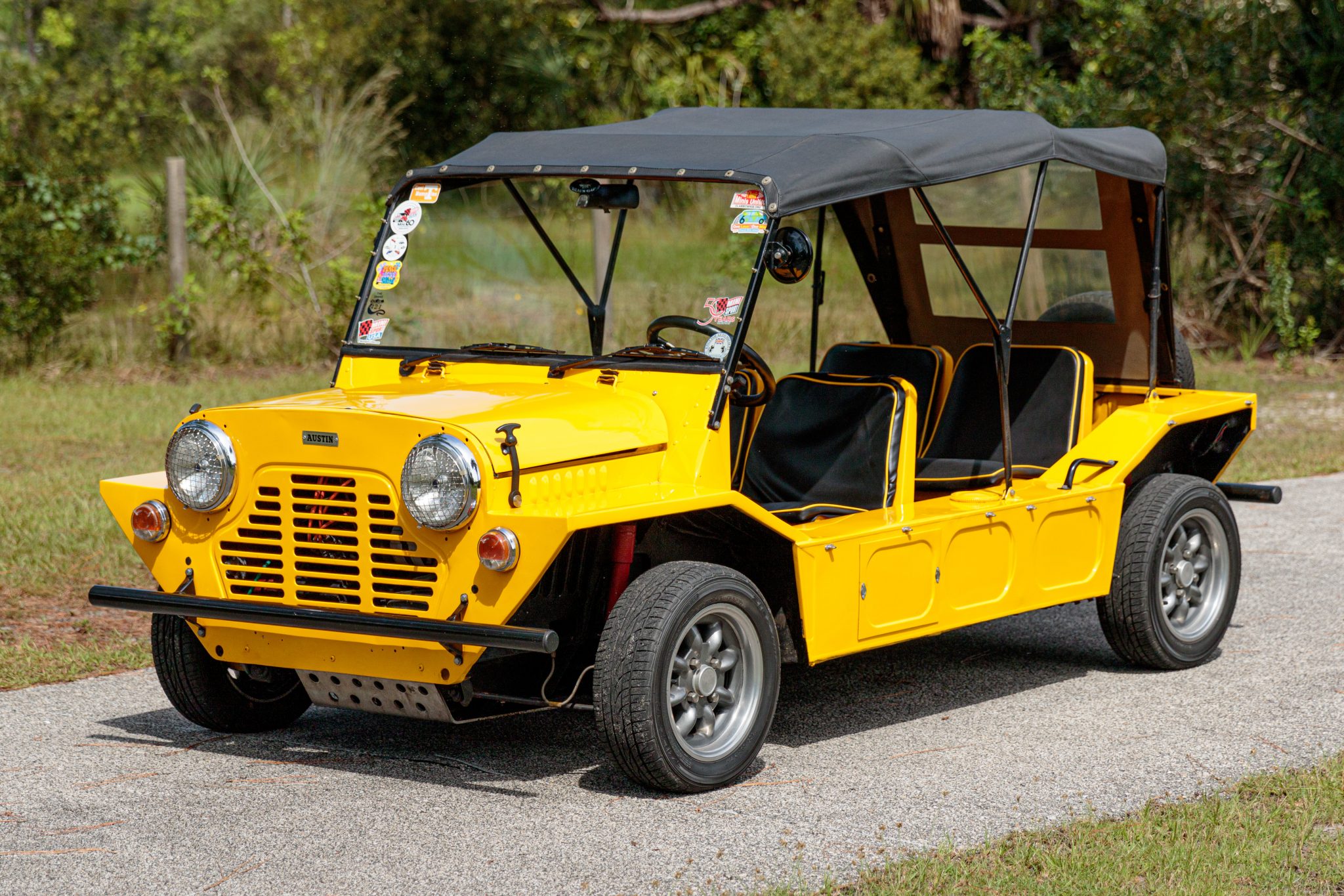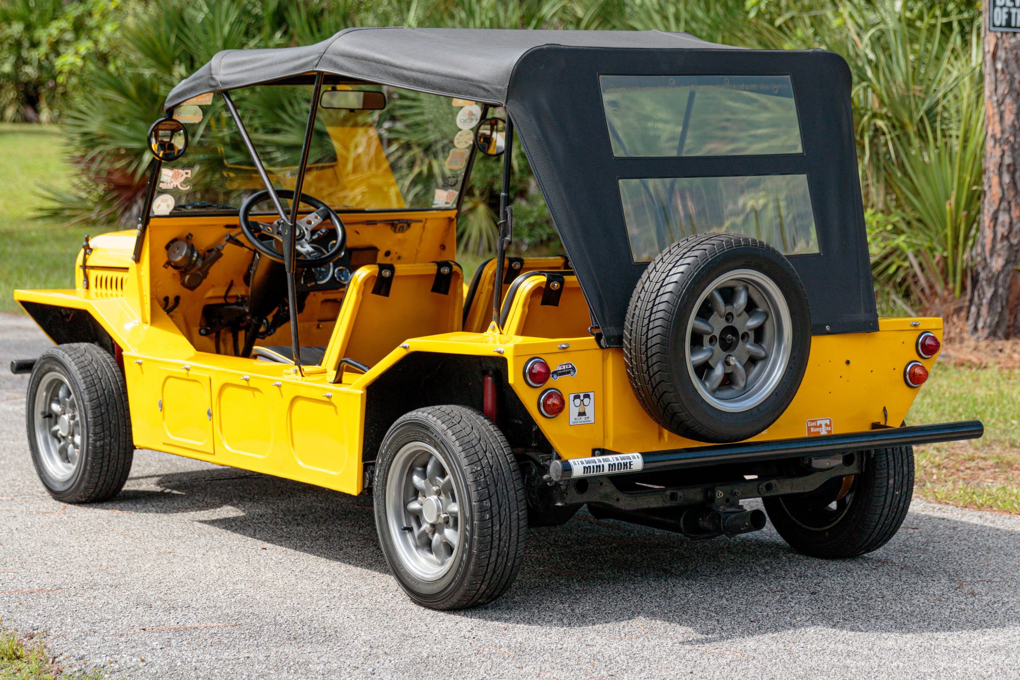 Minilite-style 12″ wheels are wrapped in 165/60 Falken Ziex ZE912 tires with a full-size spare mounted to the rear. Disc brakes are fitted up front with drum brakes out back.