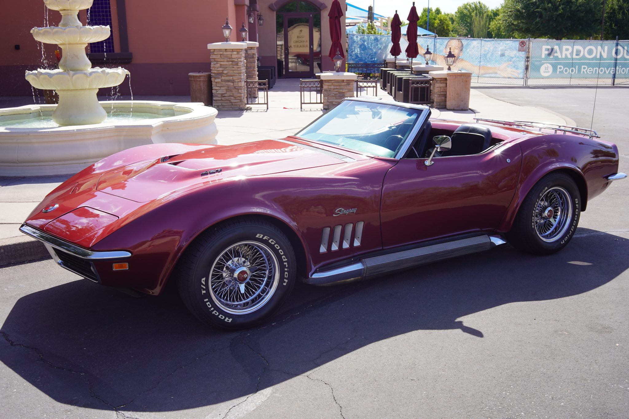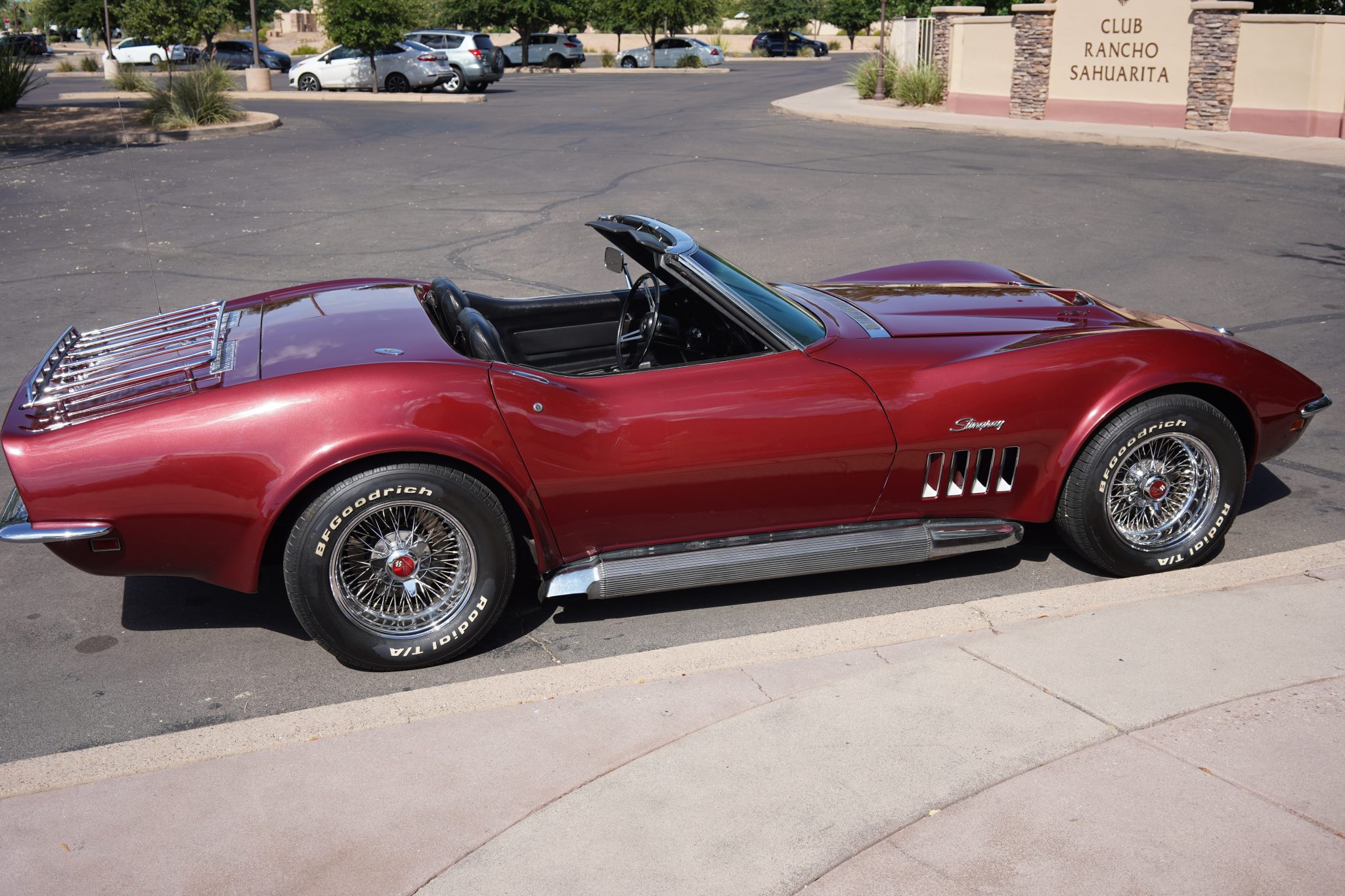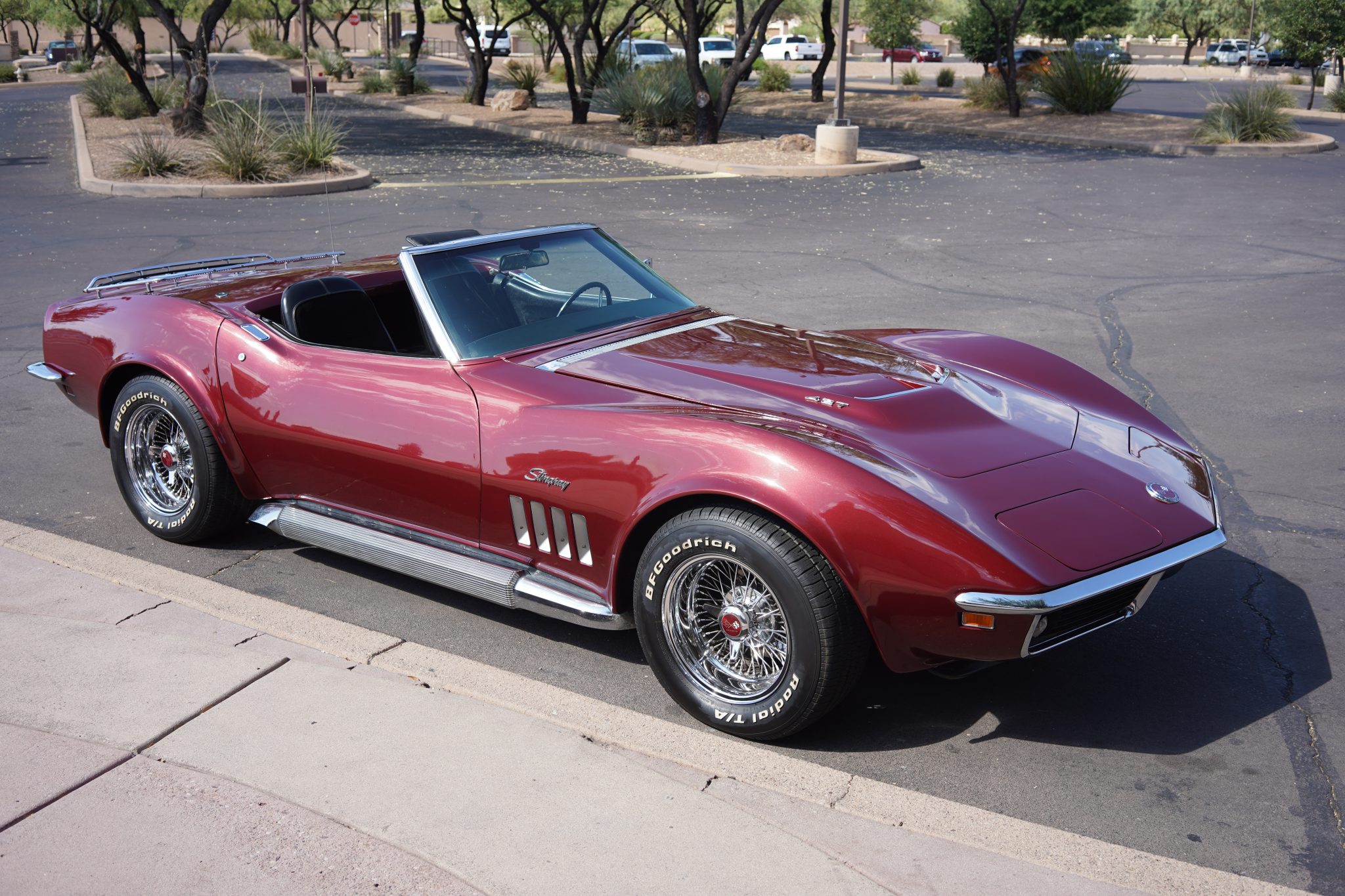 15″ wire-spoke wheels feature Corvette knock-off centers and are fitted with 235/60 BFGoodrich Radial T/A white letter tires at each corner. The car is equipped with four-wheel disc brakes.