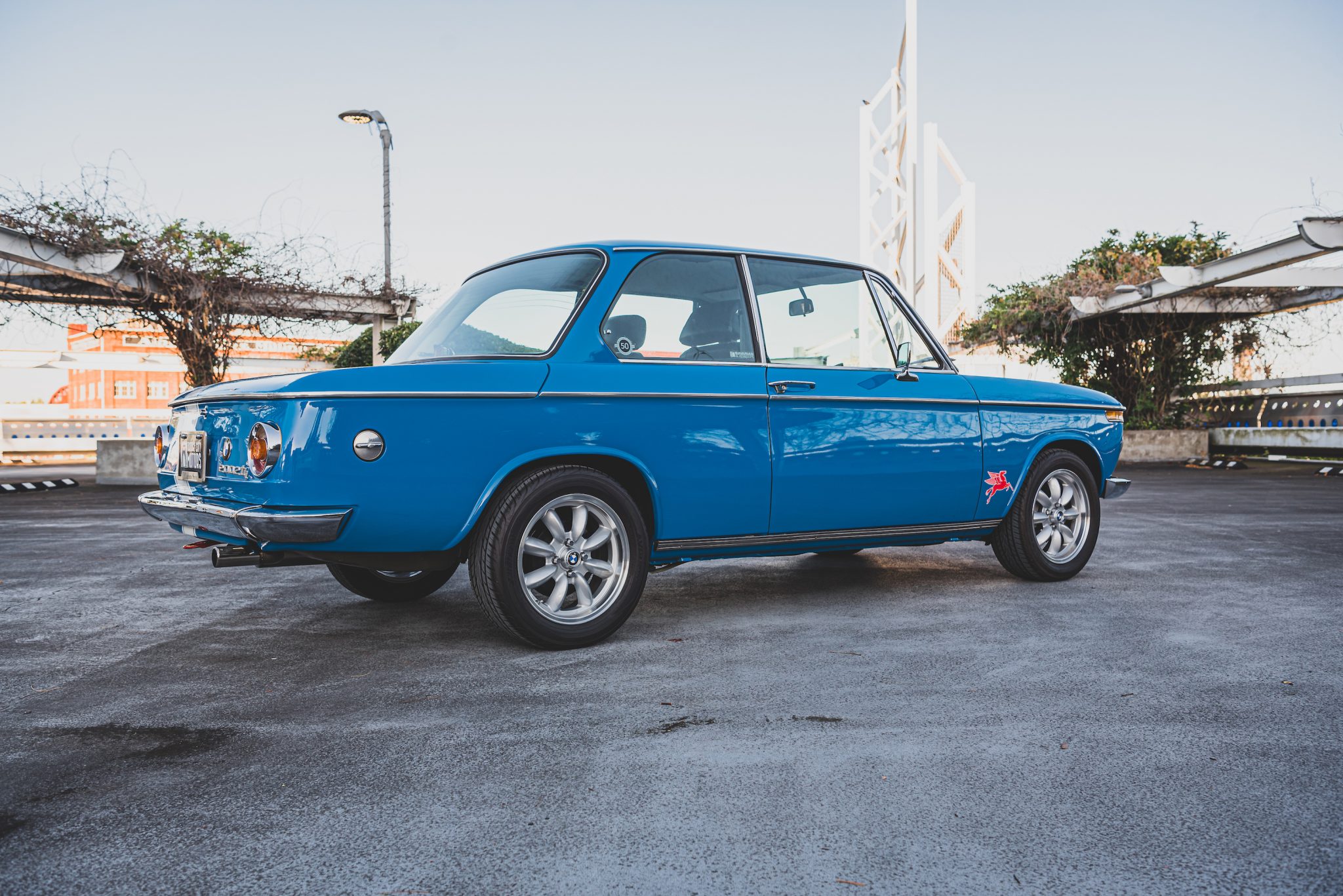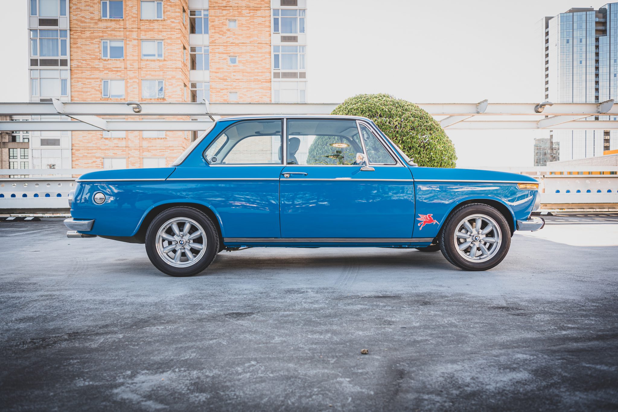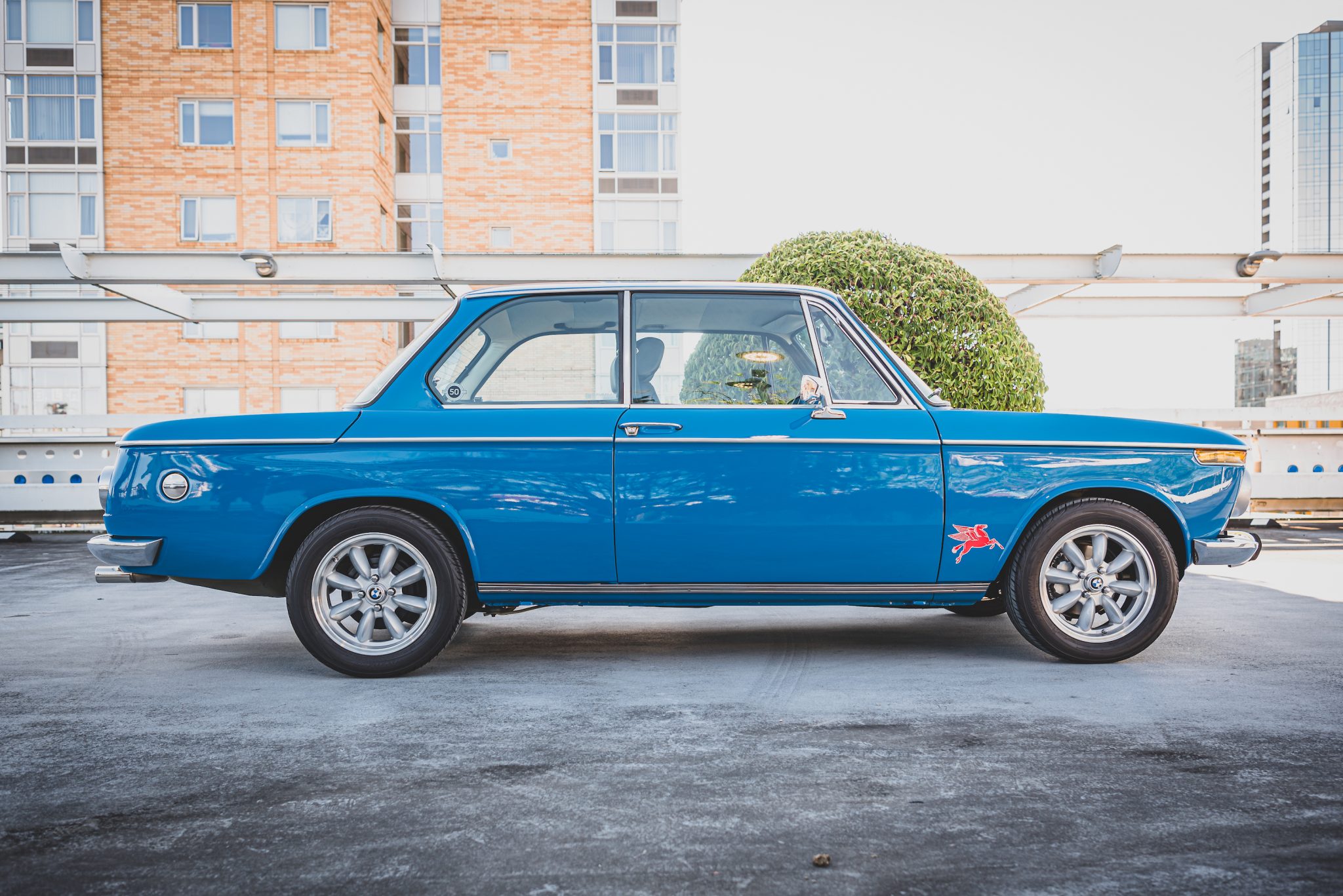 Rota RB 15″x6″ wheels wear BMW center caps and Yokohama Avid ENVigor 195/55 tires. Bilstein HD front strut inserts and rear shocks were added along with new suspension bushings and wheel bearings. New tii-spec front disc brakes and rear drums were installed in August 2015.