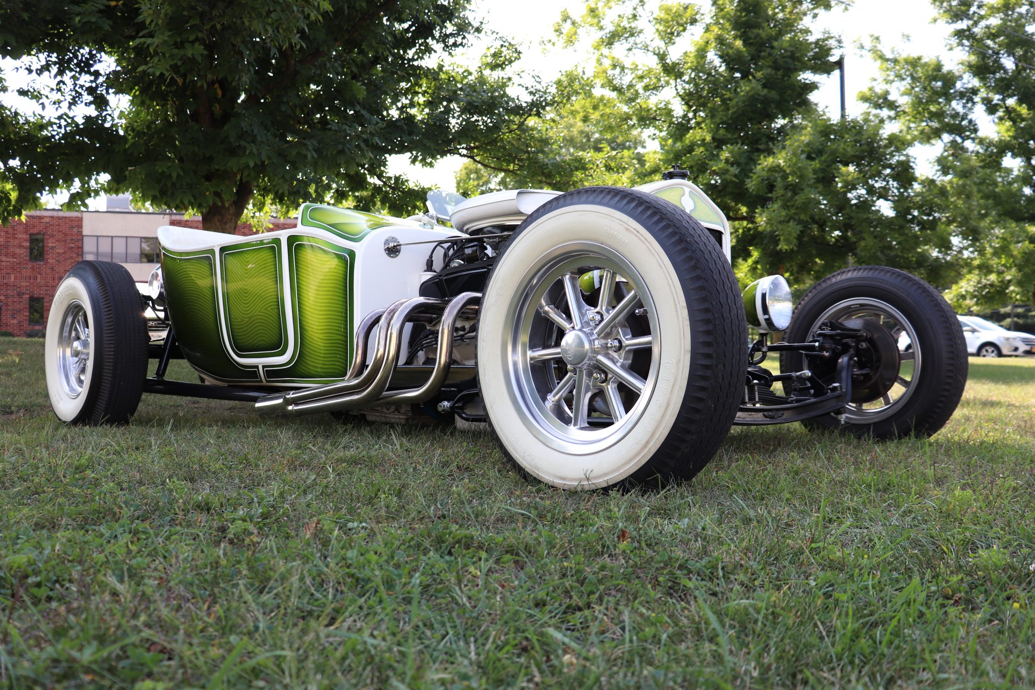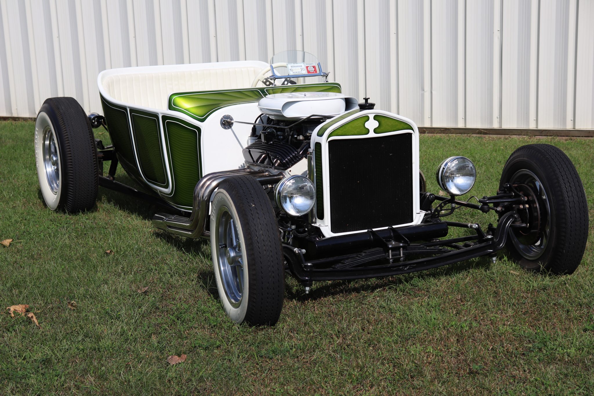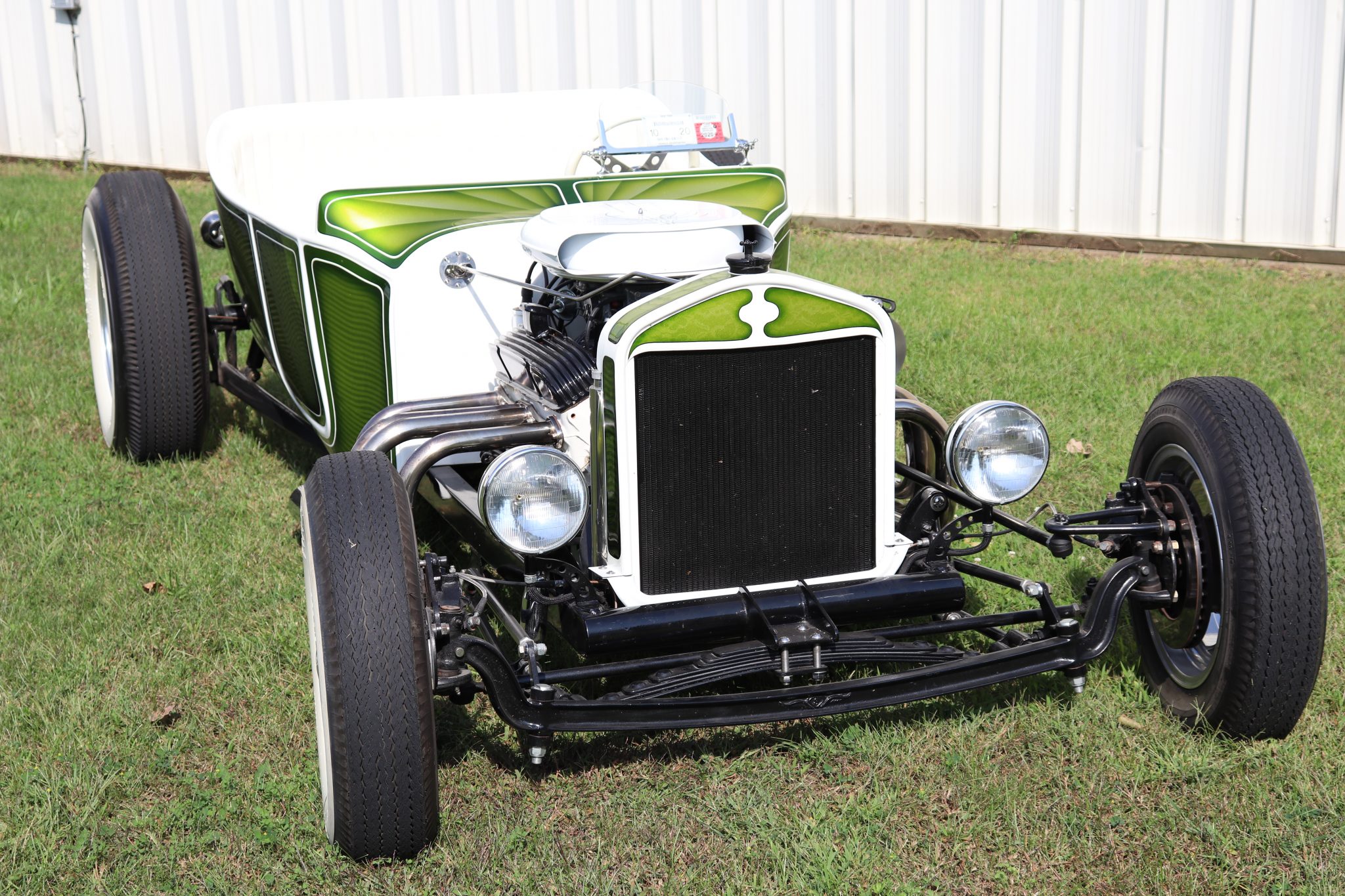 Rocket Racing 15″ Launcher ten-spoke wheels with 5.60-15 Firestone whitewall tires, and Rocket Racing 15″ Strike five-spoke wheels with 8.20-15 Firestone Deluxe Champion whitewall tires are mounted out back. Suspension modifications are said to include Model A hairpins, a dropped 1932 Ford front axle, POSIES springs, and Speedway Motors short-tube shocks up front, while out back a custom four-link suspension utilizes modified 1940 Ford wishbones and Model A leaf springs. A Speedway Motors Vega steering box with billet steering column is also installed, and braking is handled by front discs and rear drums.