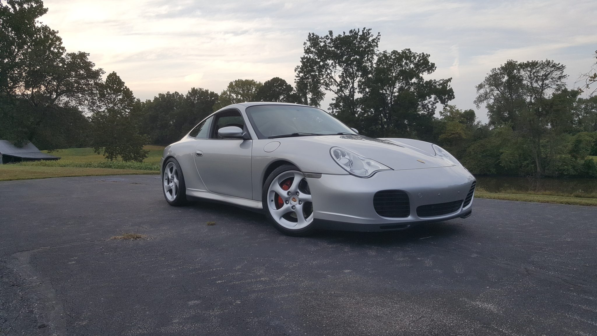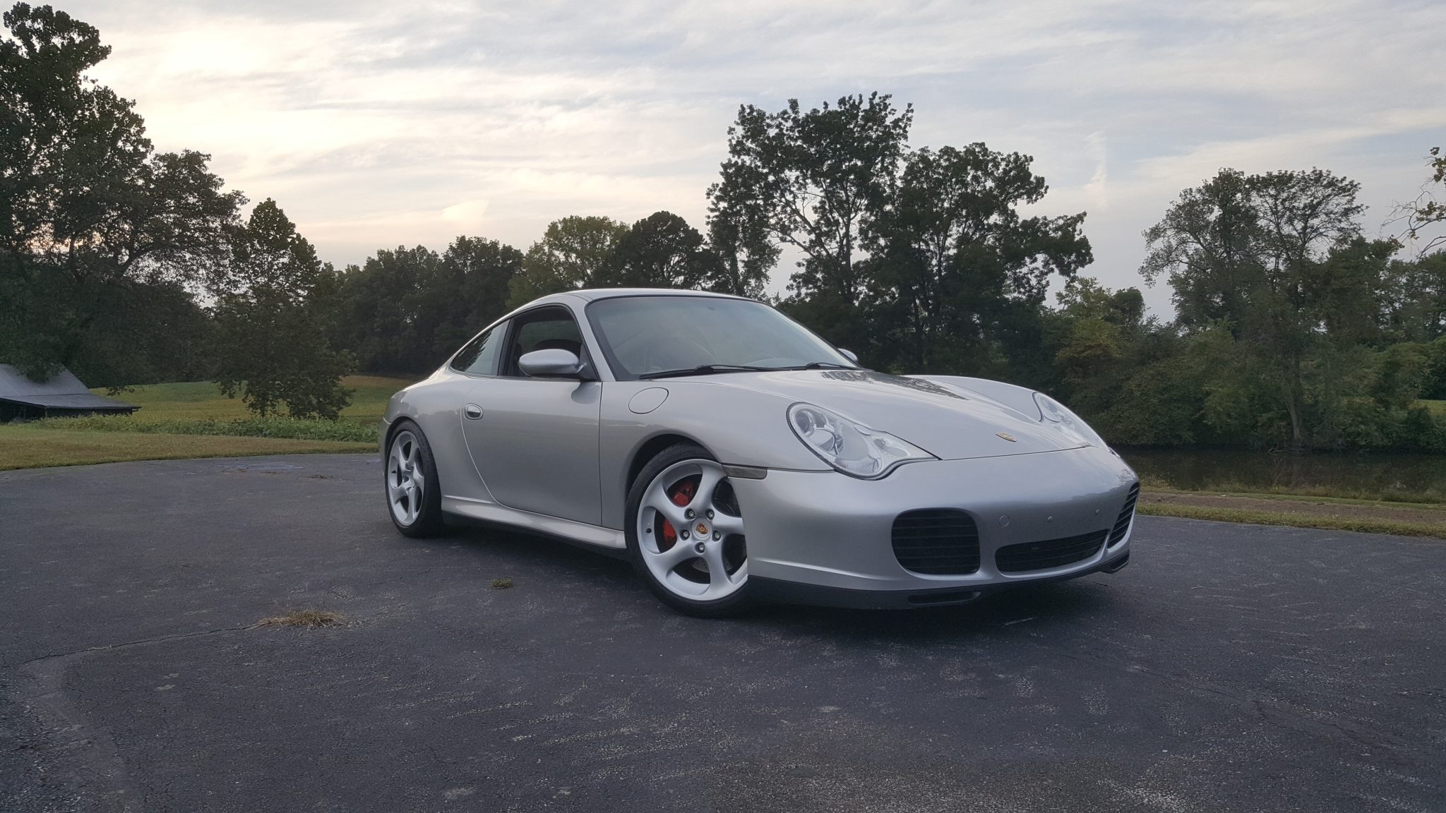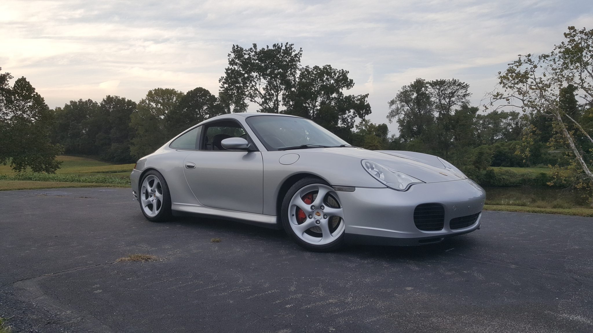 Silver 18″ Turbo Twist wheels wear colored Porsche crest center caps and Michelin Pilot Sport N3 tires. Wheel spacers have been fitted, and the suspension has been lowered using H&R springs.