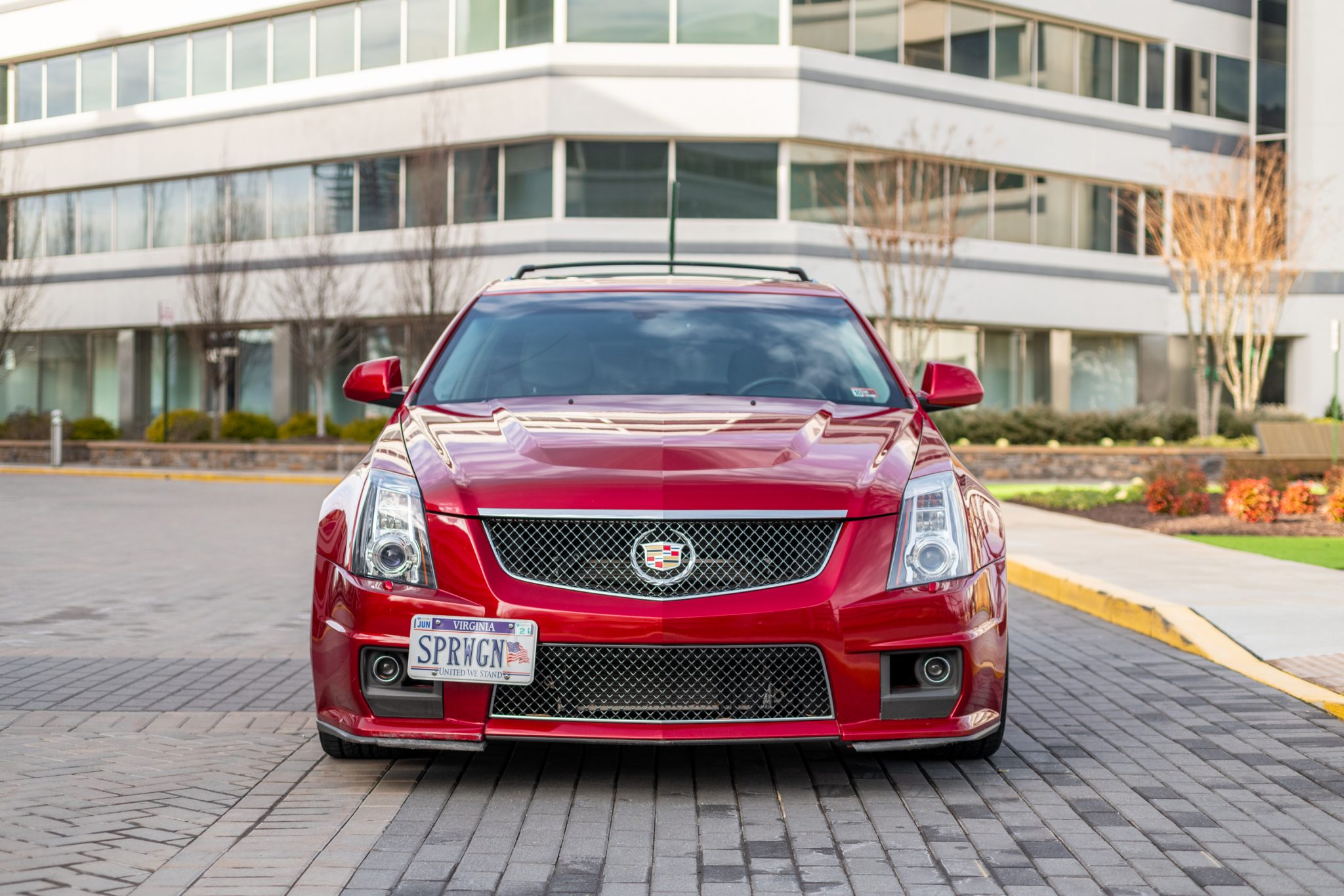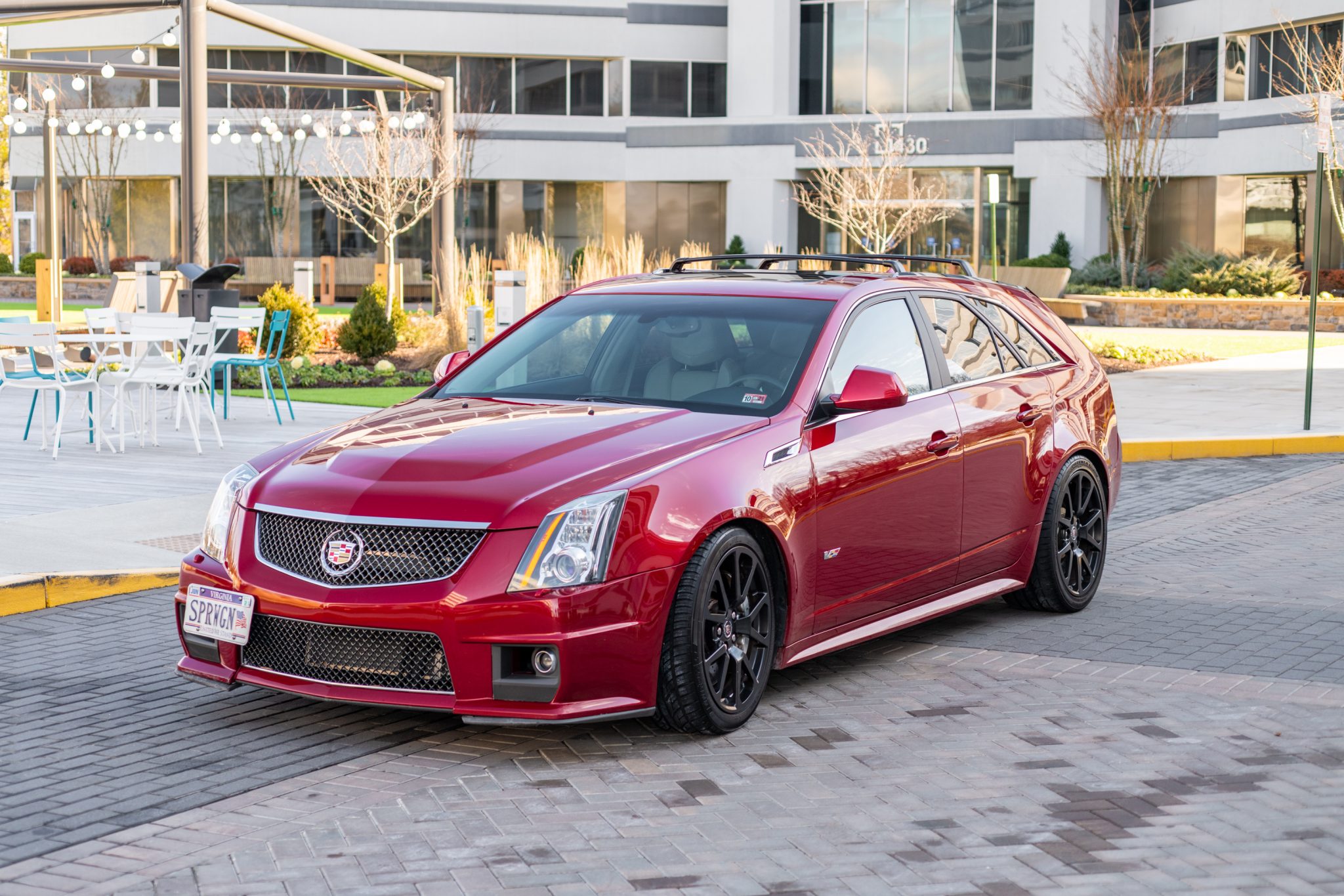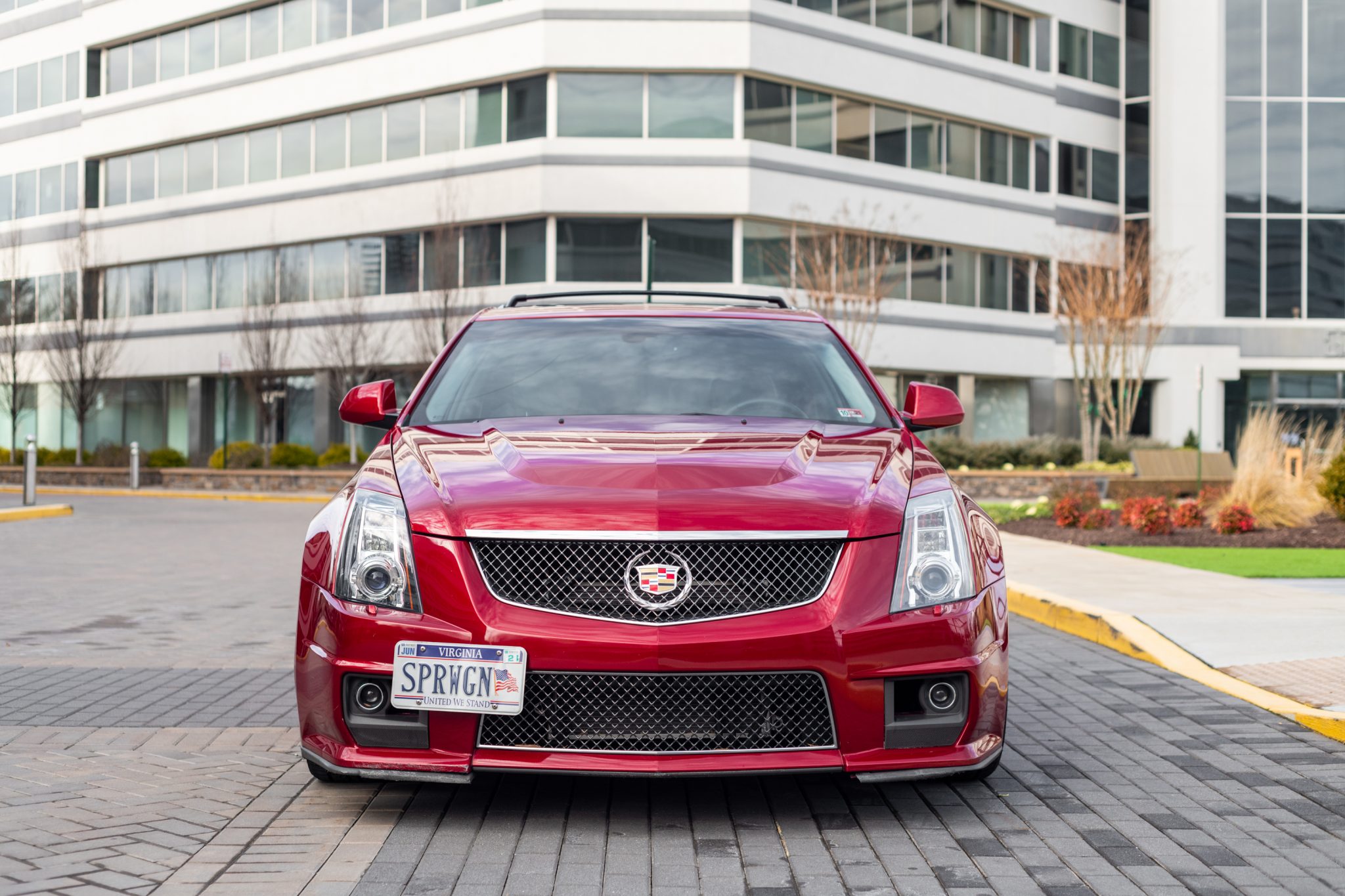 Black 19″ aluminum wheels are mounted with 255/40 Uniroyal Tiger Paw front and 285/35 Bridgestone Potenza S-04 Pole Position rear tires. The CTS-V utilizes an adaptive suspension system with magnetic dampers, and Eibach lowering springs have been installed. The rear shocks were replaced in 2017 followed by the front pair in 2020. The braking system features silver V-logo six- and four-piston brake calipers paired with cross-drilled and slotted rotors. Two additional sets of wheels are included in the sale.