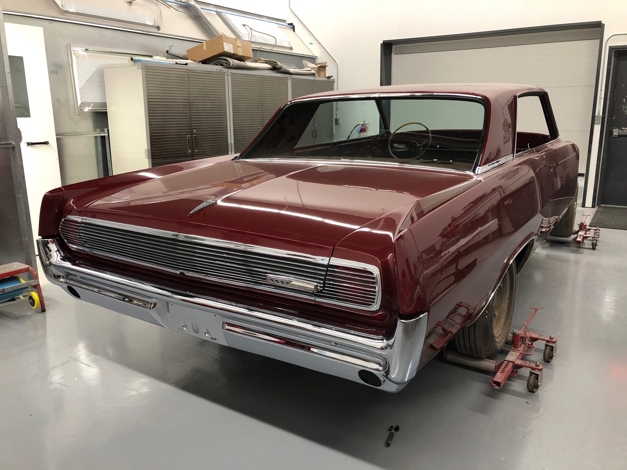 14″ eight-lug wheels wear chrome beauty rings and center caps as well as 235/75 Coker American Classic thin whitewall tires. Braking is handled by finned aluminum drums at all four corners that were reportedly refurbished by J&G Brake Drum Relining of McHenry, Illinois, and installed with replacement wheel cylinders, new wheel bearings, and stainless brake lines during the refurbishment completed in 2019. According to the seller, the frame was blasted and epoxy coated during the refurbishment, and the ball joints and shocks were replaced.