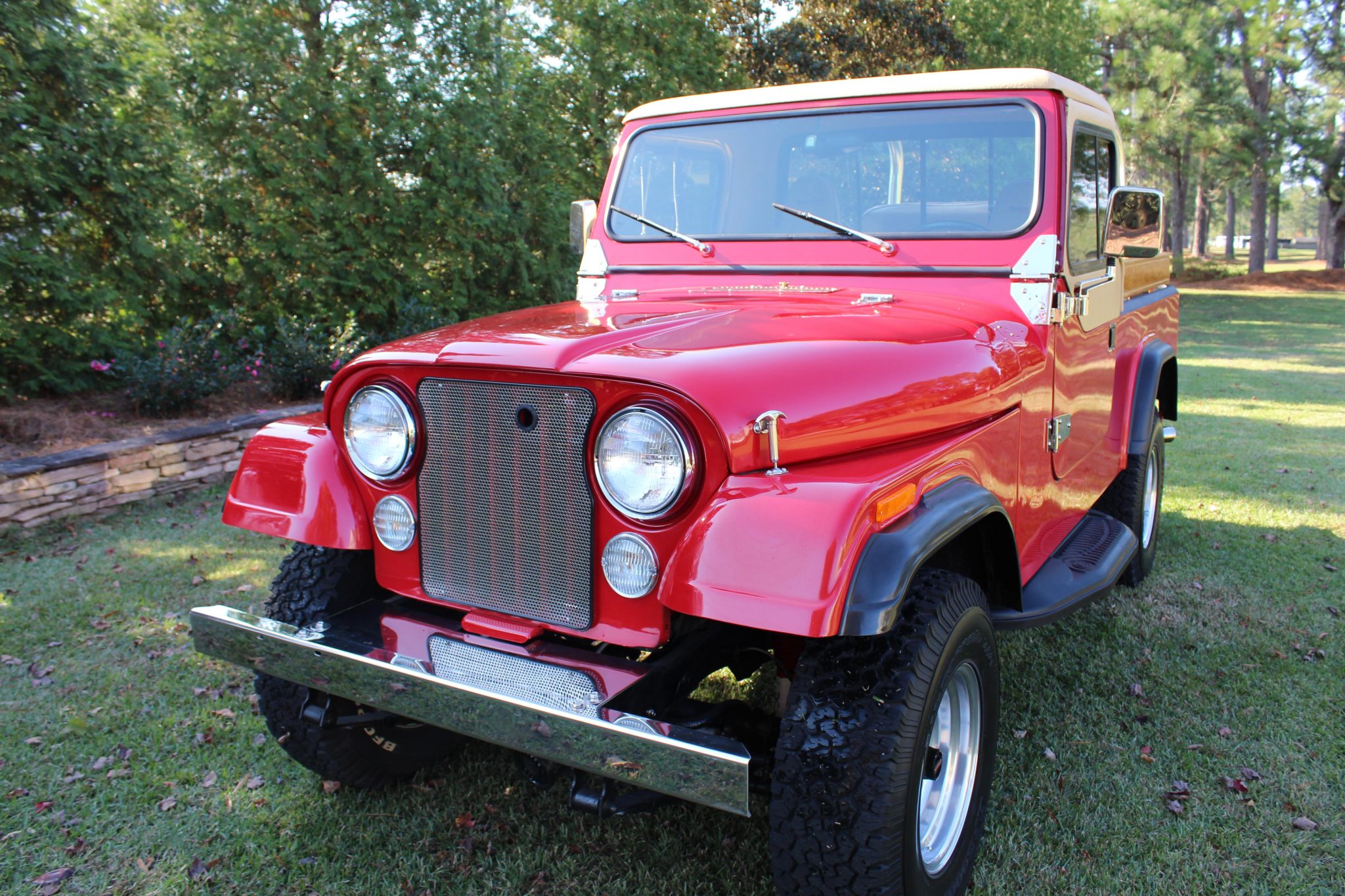 Polished 15″ Mickey Thompson alloy wheels are mounted with BFGoodrich All-Terrain T/A tires that measure 31×10.5″, and the front axle is equipped with manually-lockable hubs. The selling dealer reports that the brake booster and shocks were replaced in August 2020.