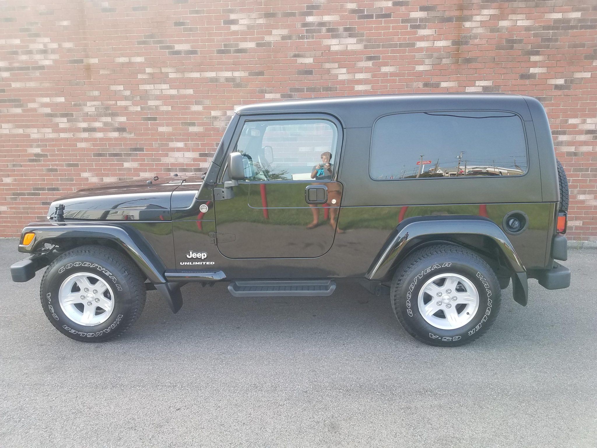 Factory 15″ aluminum wheels wear 30×9.5″ Goodyear Wrangler GS-A tires. A matching spare is mounted to the swing-out carrier at the rear.
