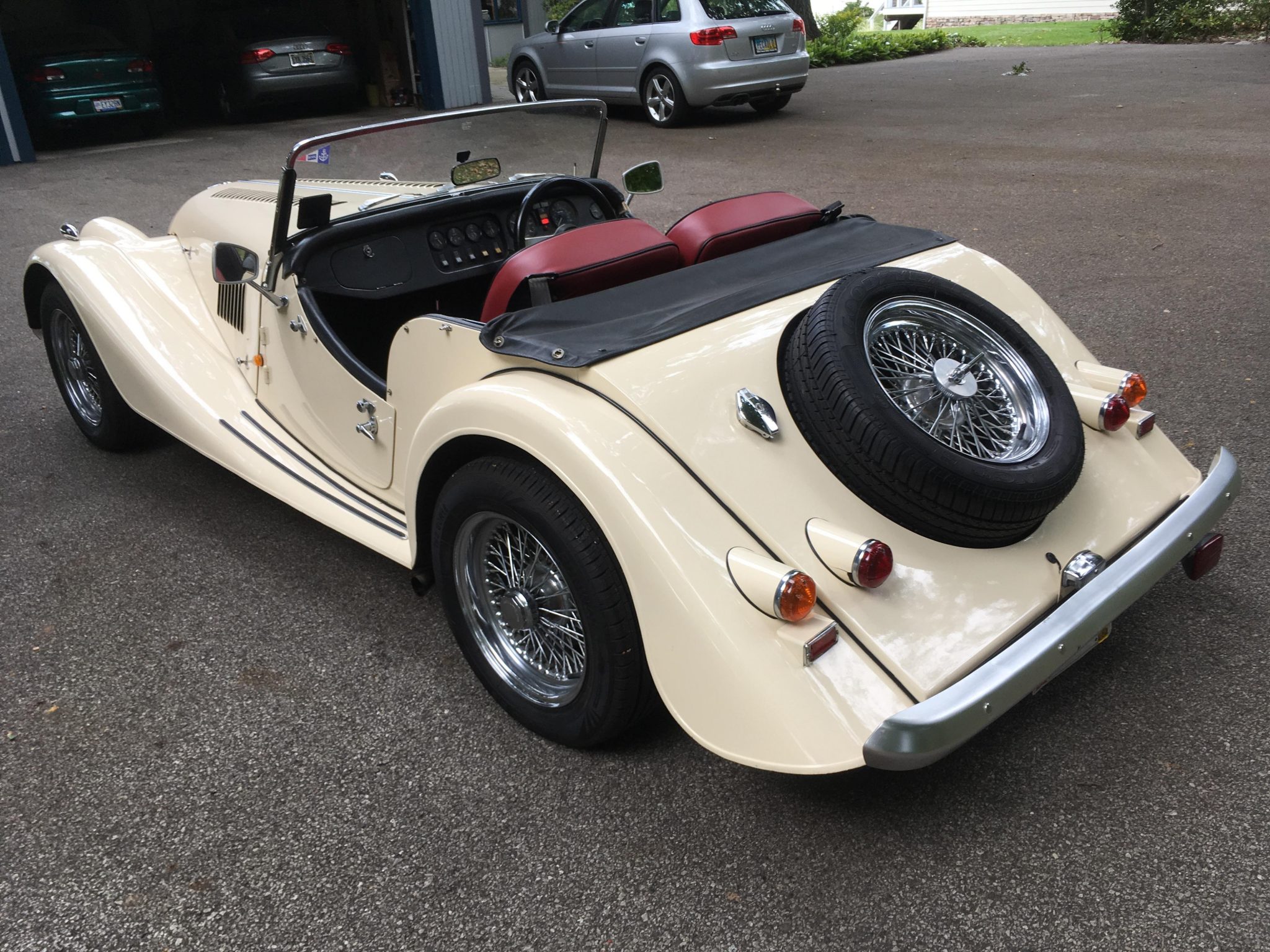 Chrome 15″ wire wheels wear Runway Enduro 816 tires in size 195/60, and a rear-mounted full-size spare is equipped with a Goodyear Eagle tire.