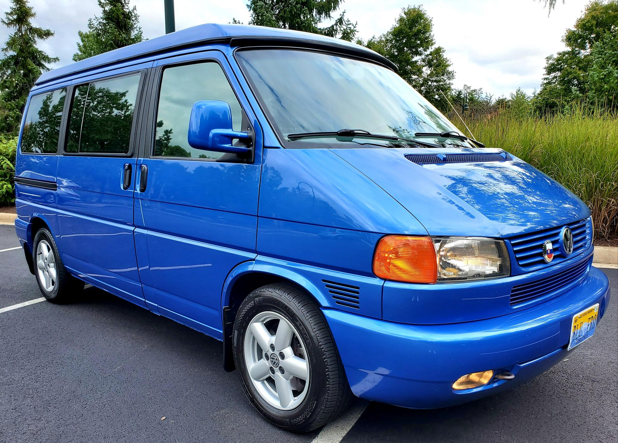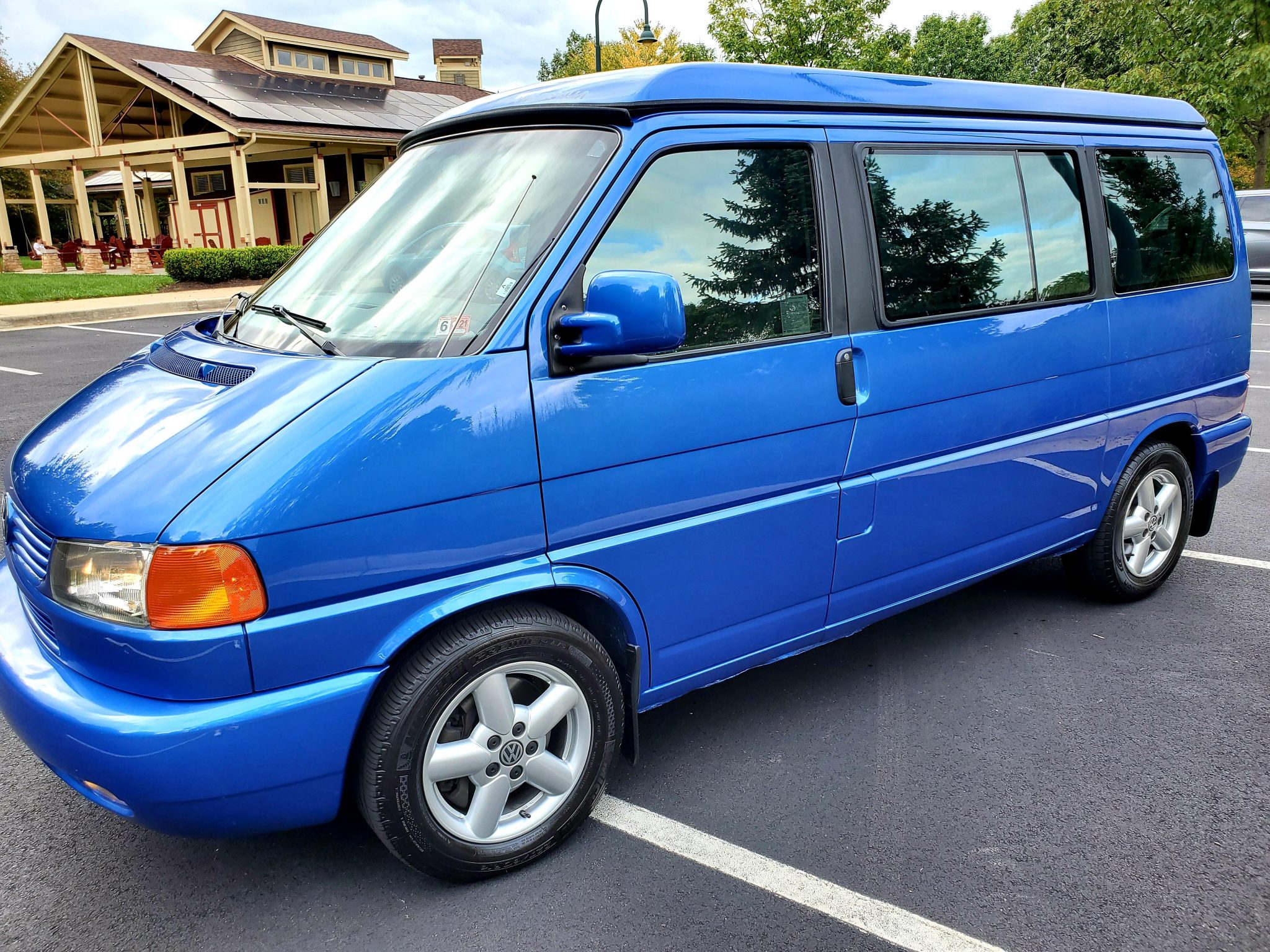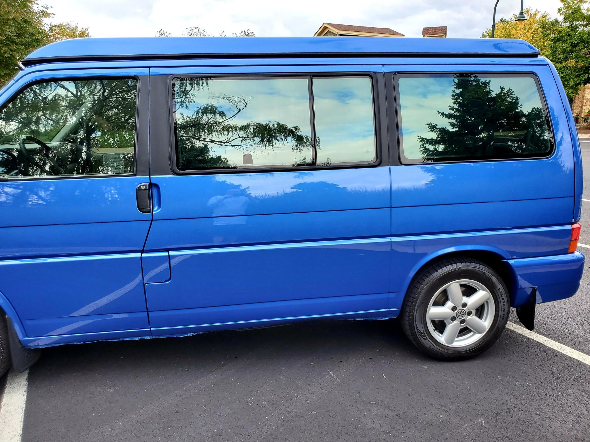 Factory 16″ five-spoke alloy wheels wear Michelin tires with 2015 date codes up front and Nokian rubber from 2008 in the rear. An additional factory wheel and spare tire are located beneath the vehicle. The seller states that new front mud flaps, blue VW wheel center caps, tire chains, and replacement Westfalia roof stickers will be included in the sale.