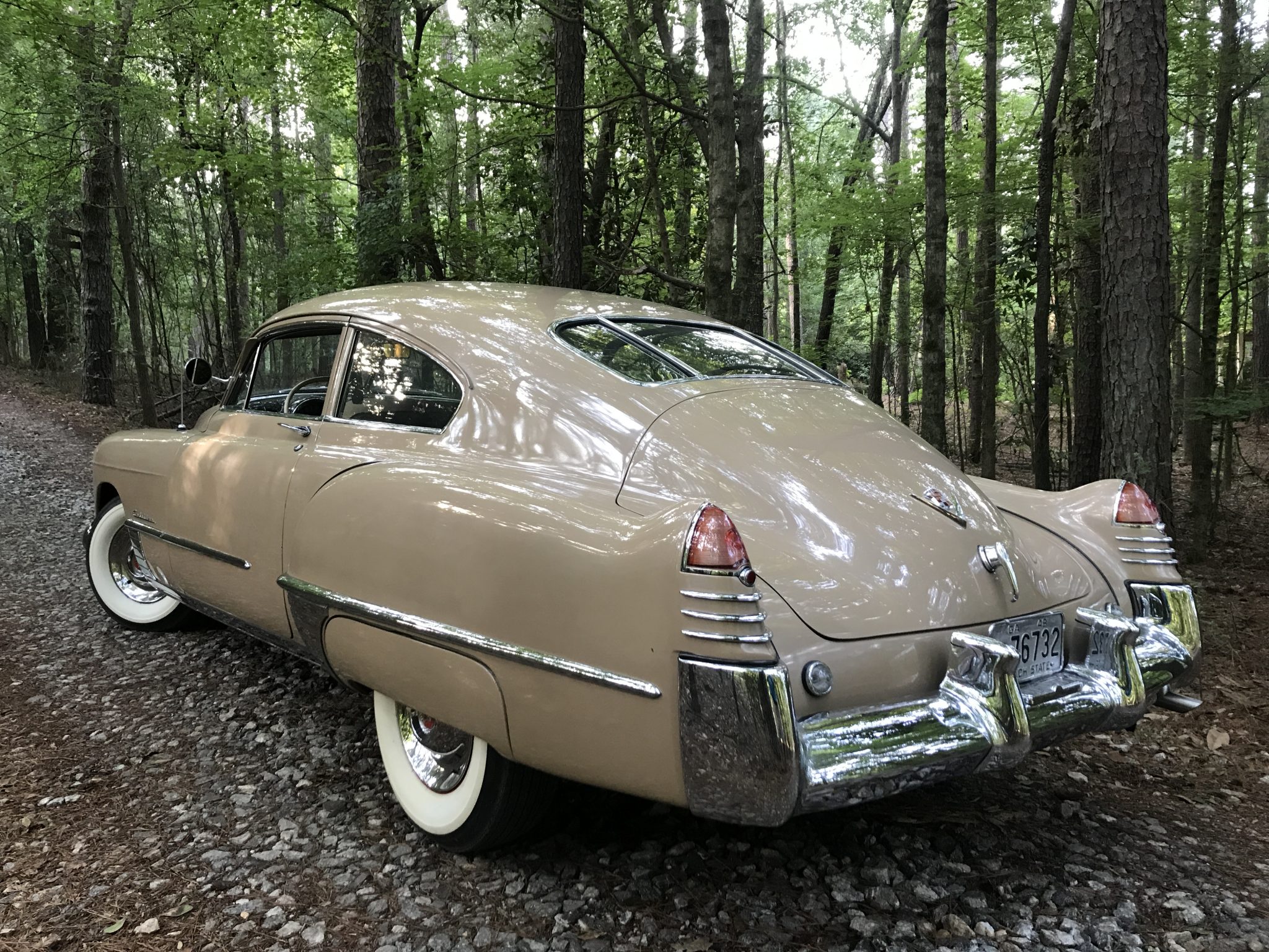 Noted blemishes shown in the gallery include dings behind the left-front wheel and on the roof. Stock 15” steel wheels are finished in red and wear chrome wheel covers. Wide whitewall tires are mounted at each corner and on the trunk-mounted spare. The brake master cylinder was reportedly replaced in 2019.