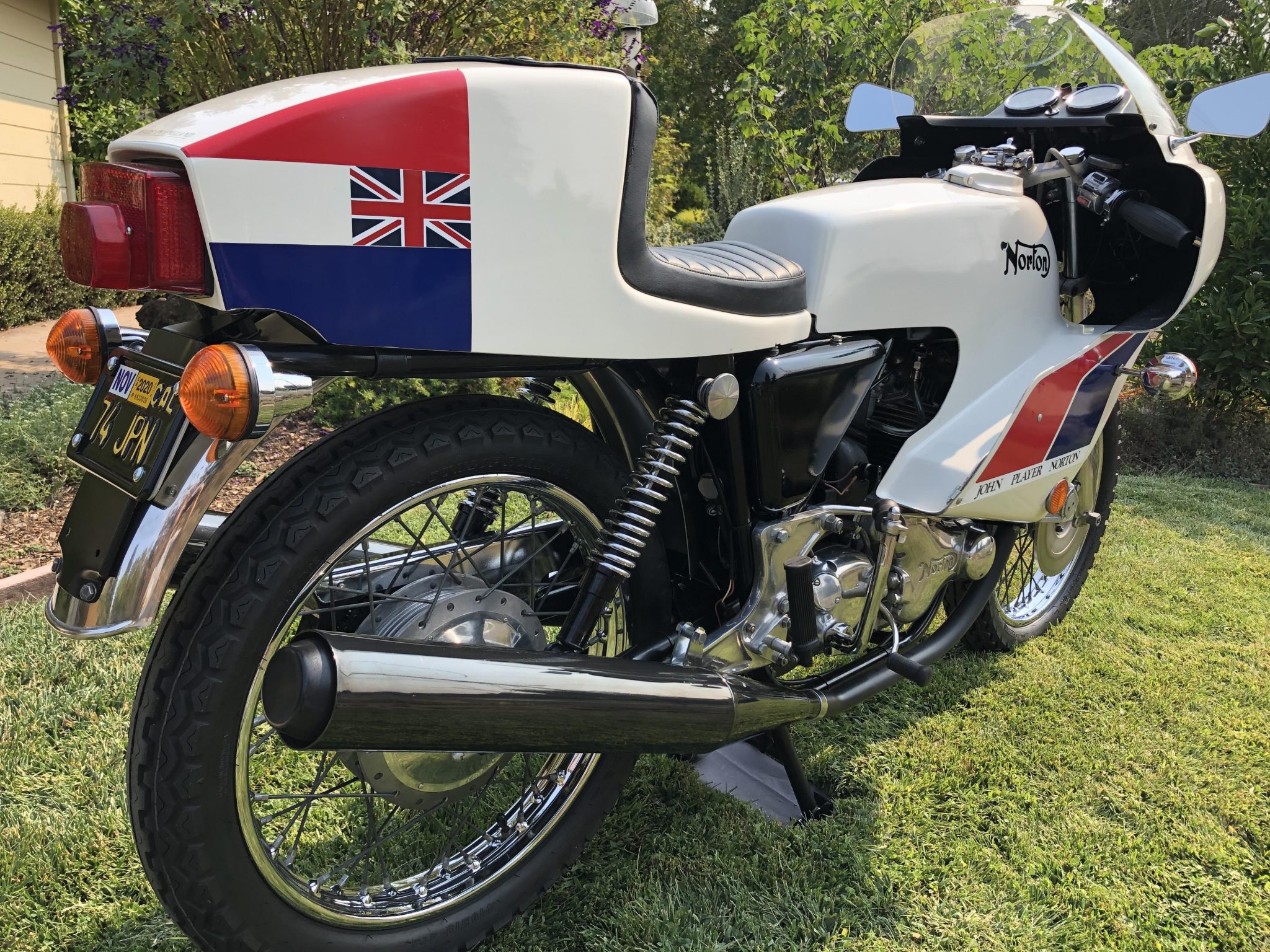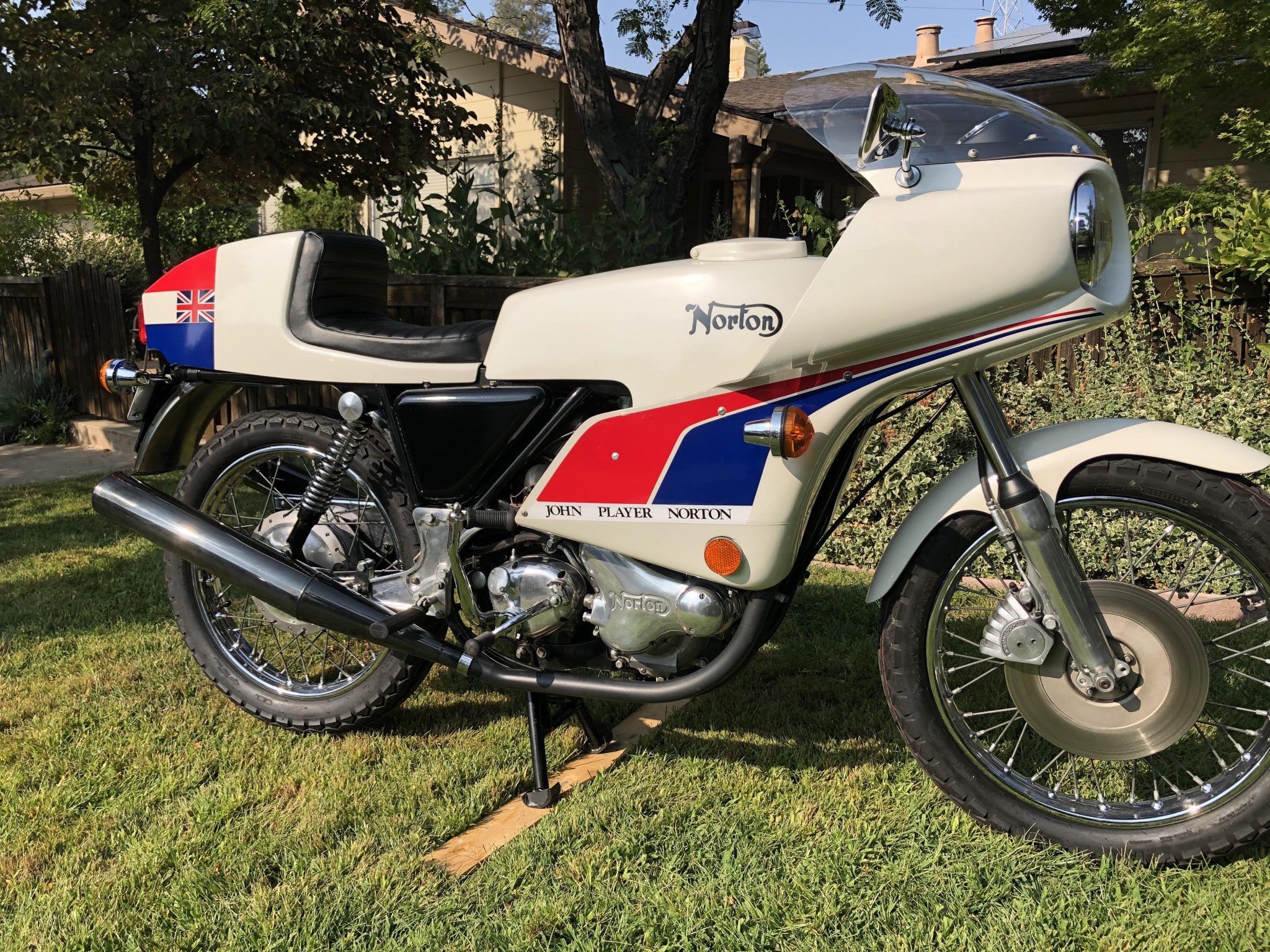 Chrome wire-spoke wheels were fitted with new 4.10-19 Dunlop K81 tires in February 2020. Suspension consists of a conventional fork that was rebuilt with new seals and tubes in 2019 as well as dual rear shocks that were fitted with chrome Hagon springs. The front brake caliper and master cylinder were rebuilt, and the hose, disc, and pads were replaced. A drum brake is fitted in the rear.