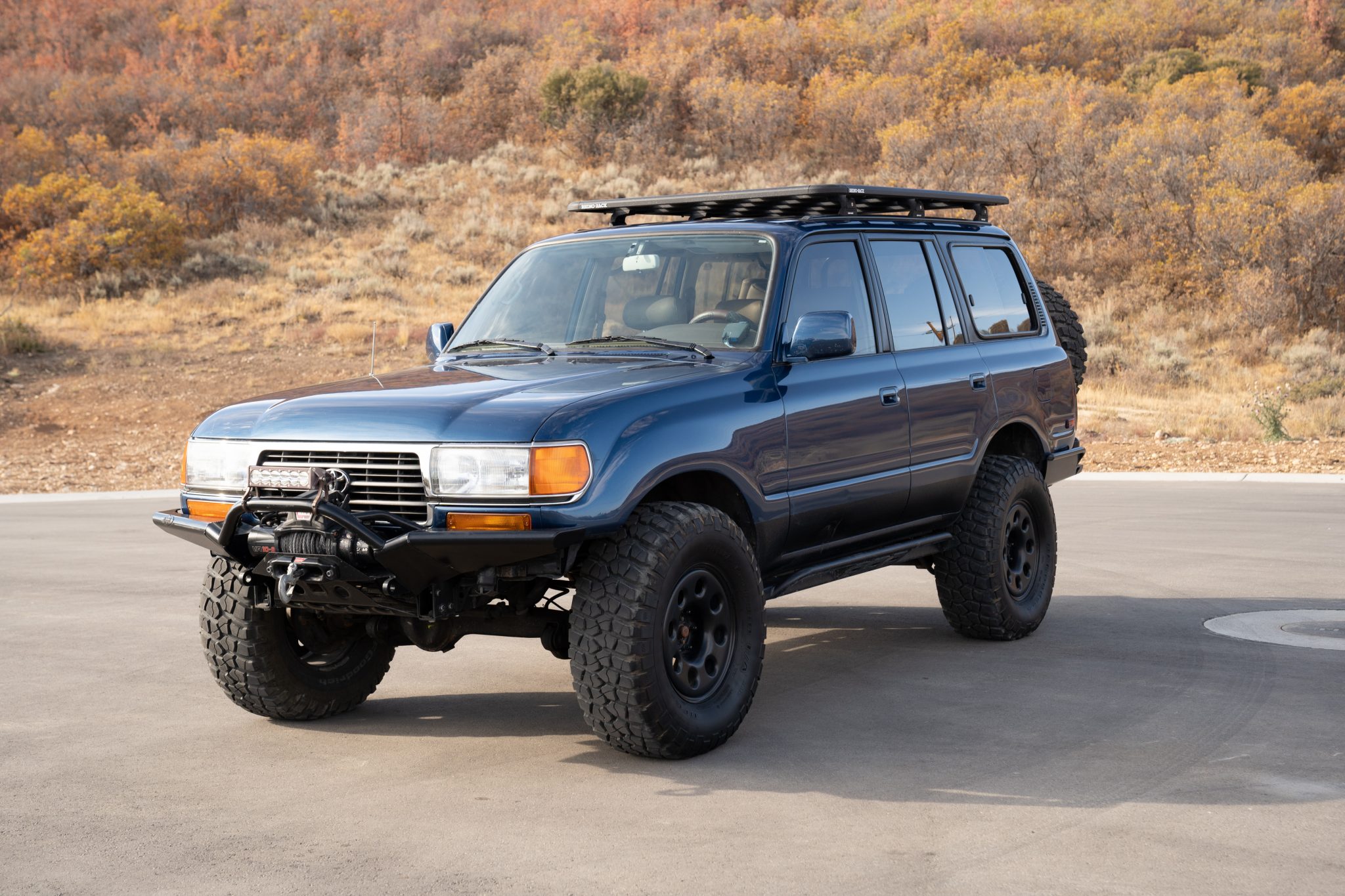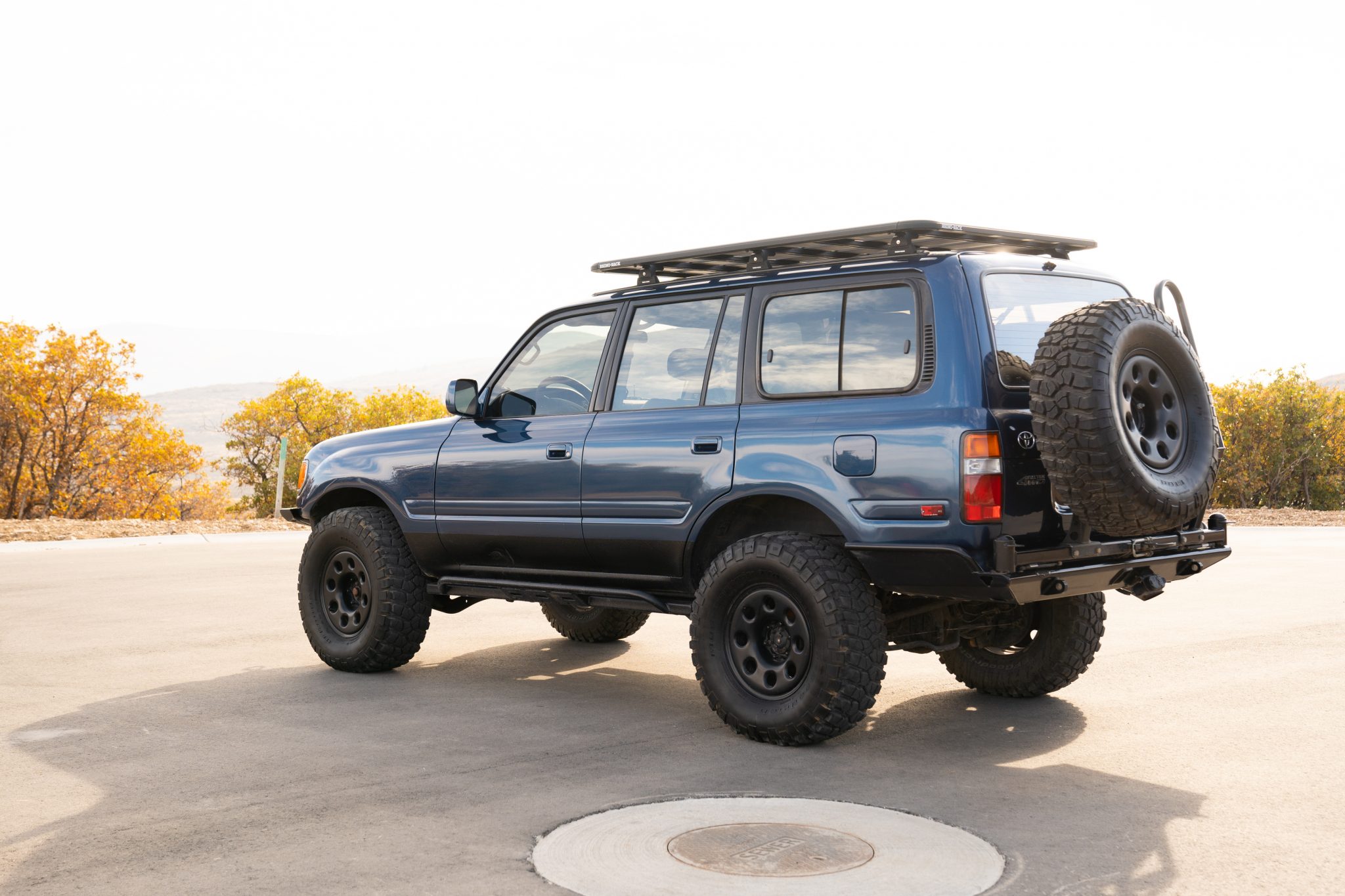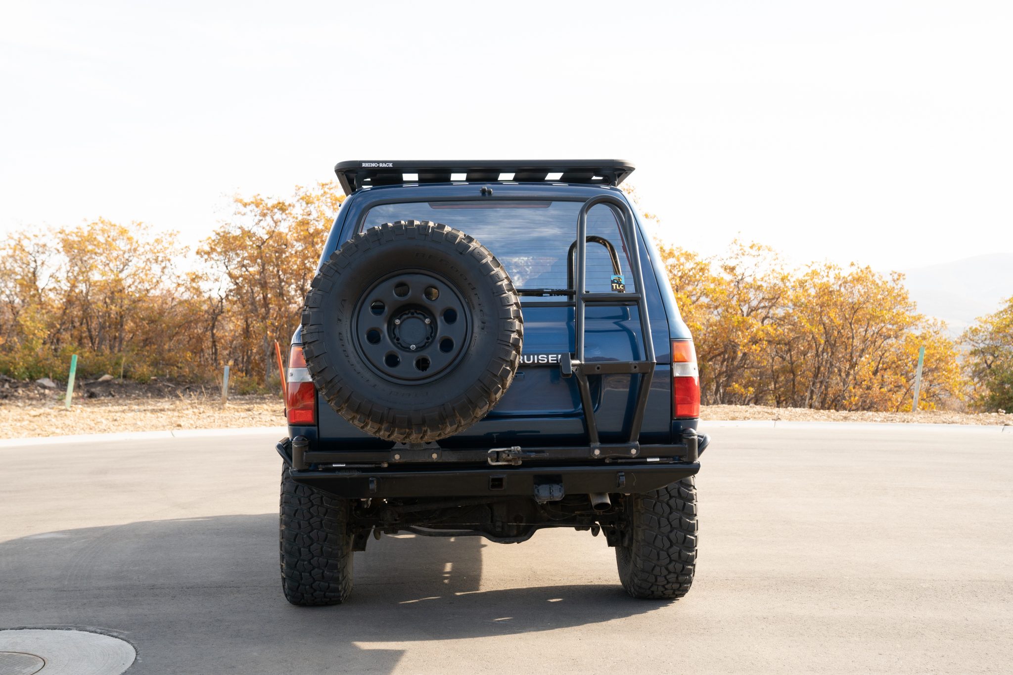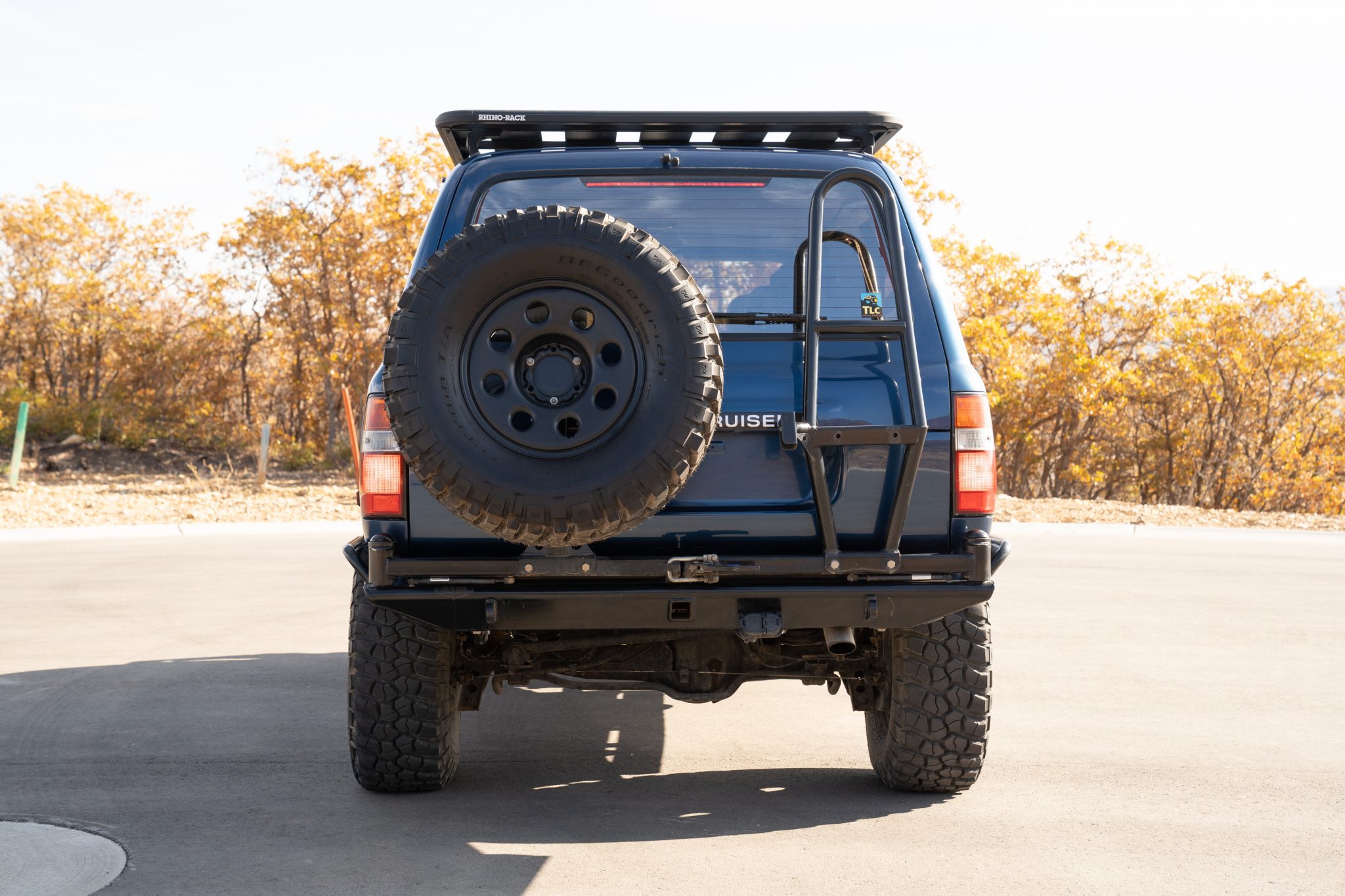 Black-finished 17″ eight-hole wheels wear 35″ BFGoodrich Mud Terrain tires, and a matching spare is mounted on a swing-out rear carrier. An Old Man Emu suspension was installed during the truck’s initial refurbishment, and the seller notes corrosion on the wheels.