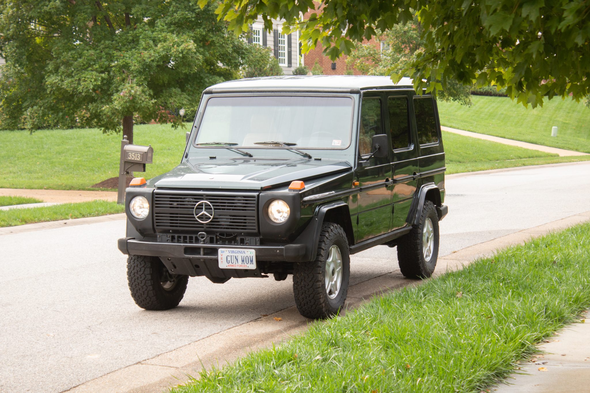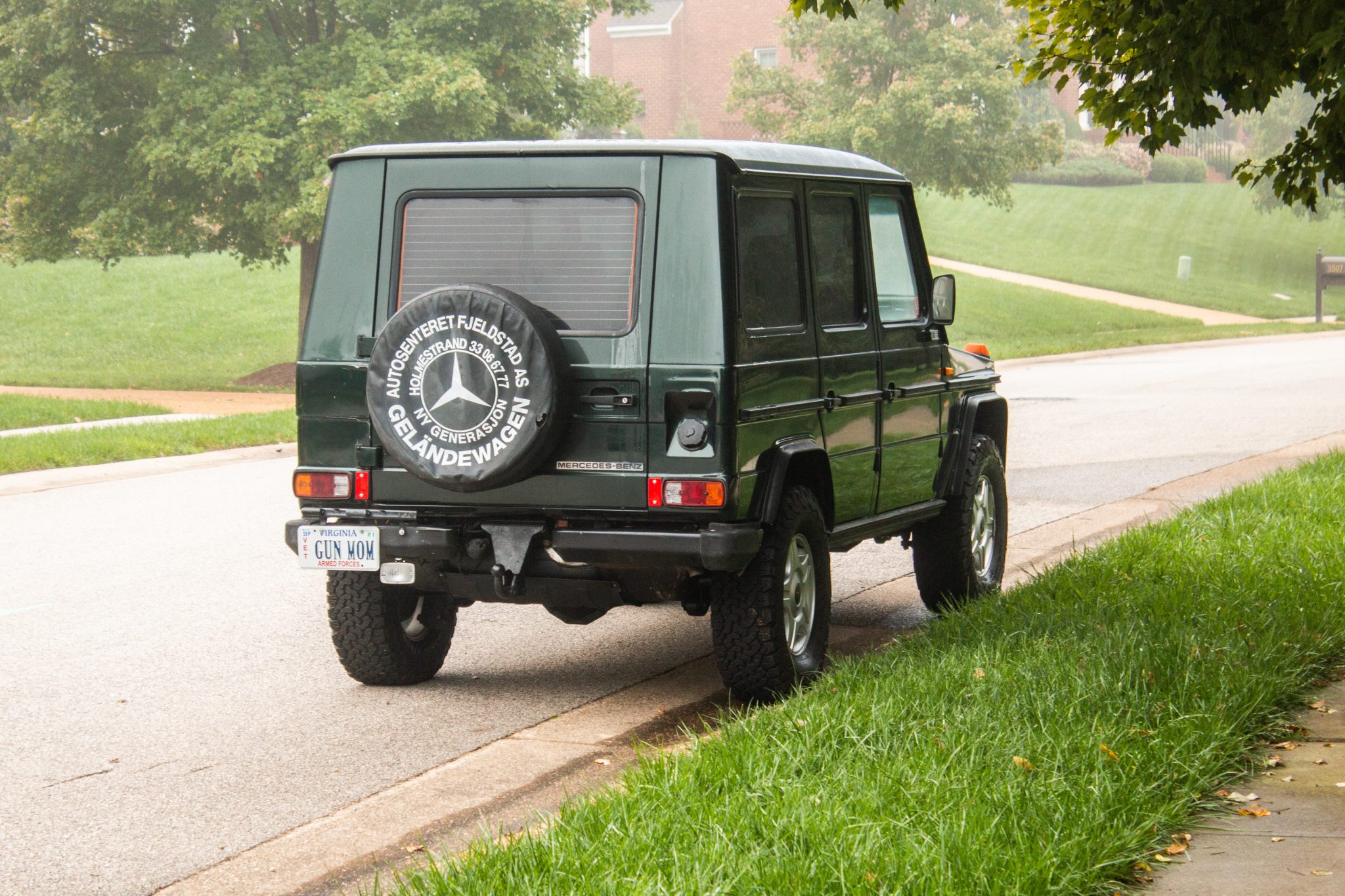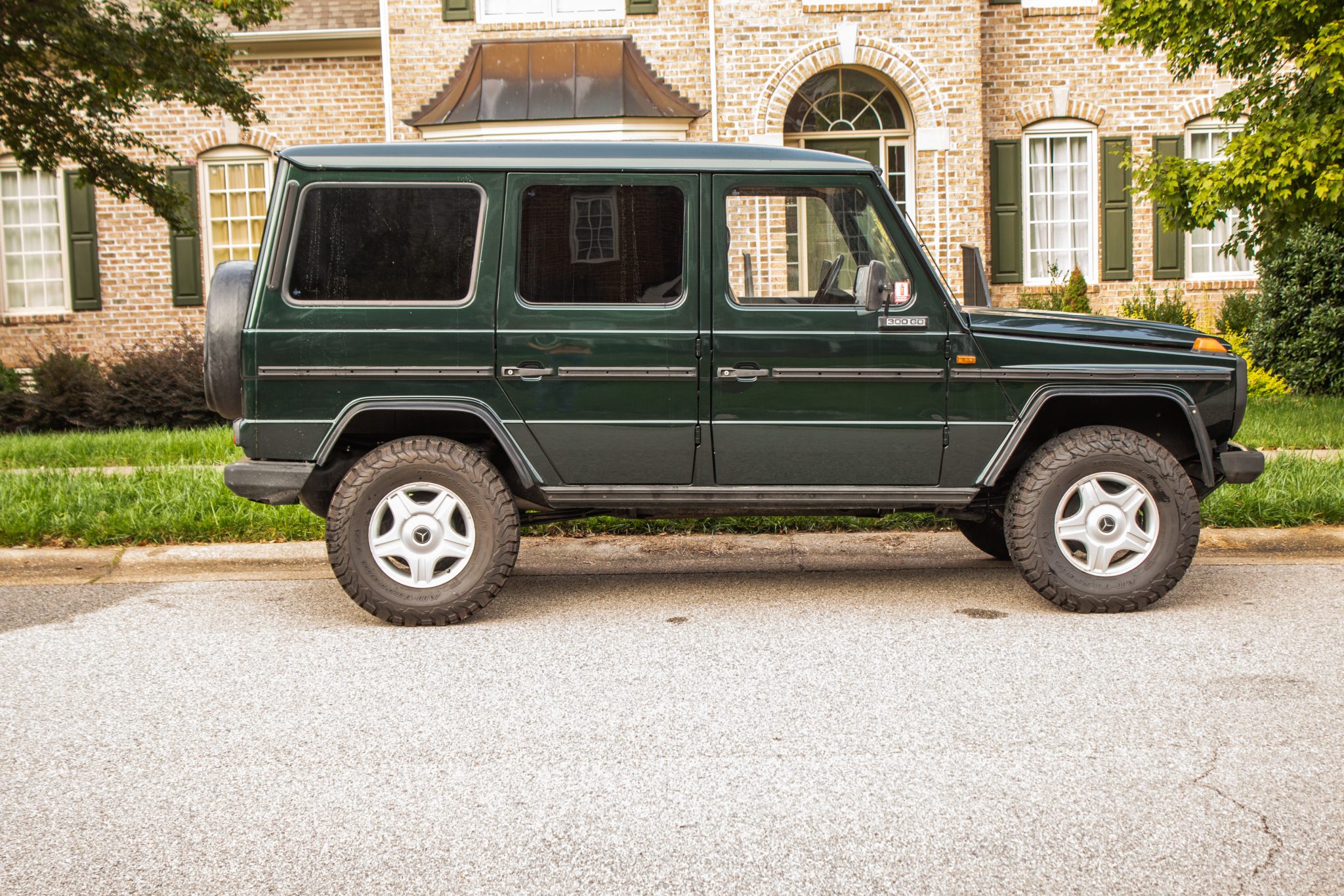 Five-spoke 16″ wheels wear Mercedes-Benz center caps and are wrapped in 265/75 BFGoodrich All-Terrain T/A KO2 tires. Braking is handled by front discs and rear drums, and the seller reports that bearings, bushings, and brake components were replaced in 2017. A spare wheel and tire with a vinyl protective cover are mounted at the rear.