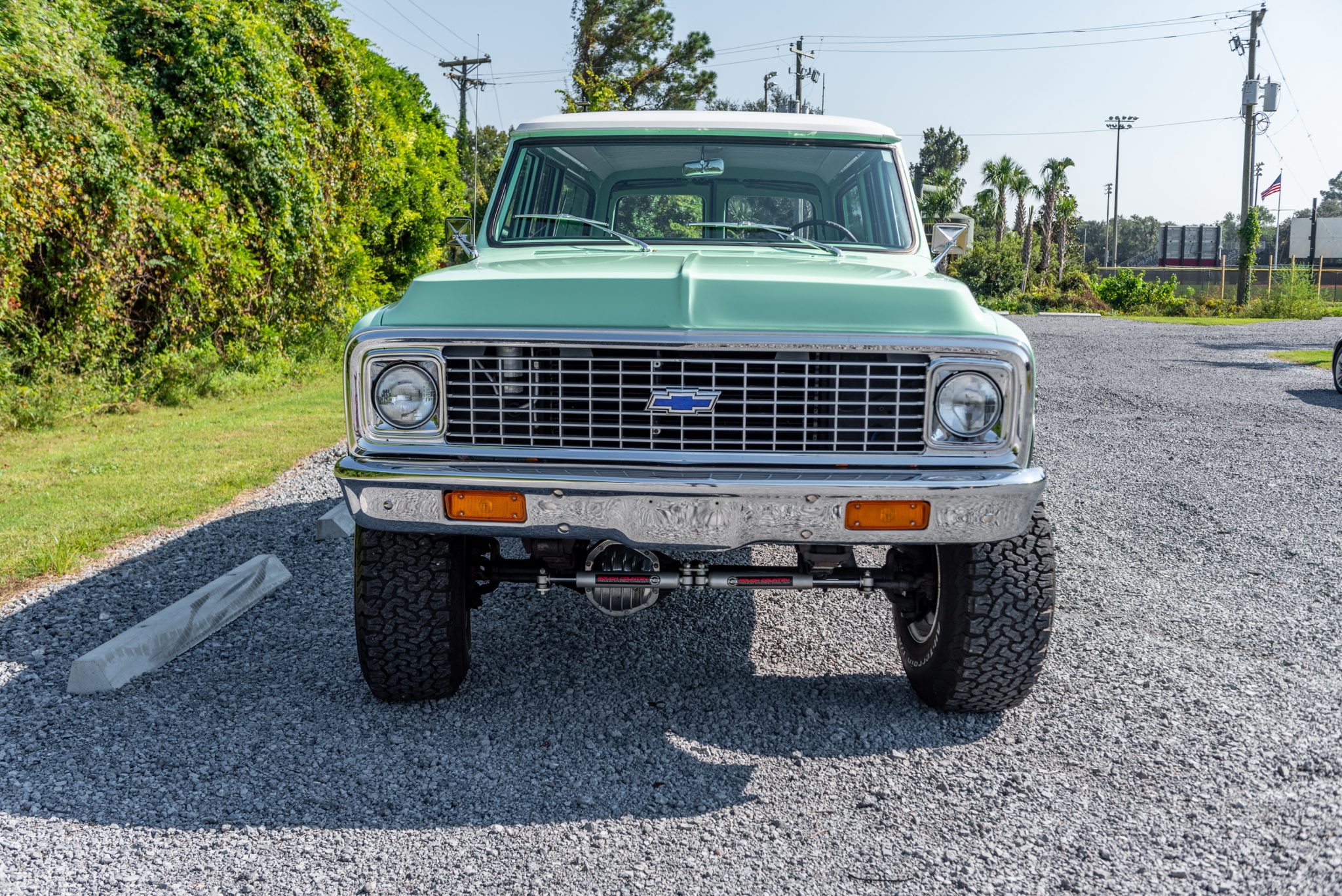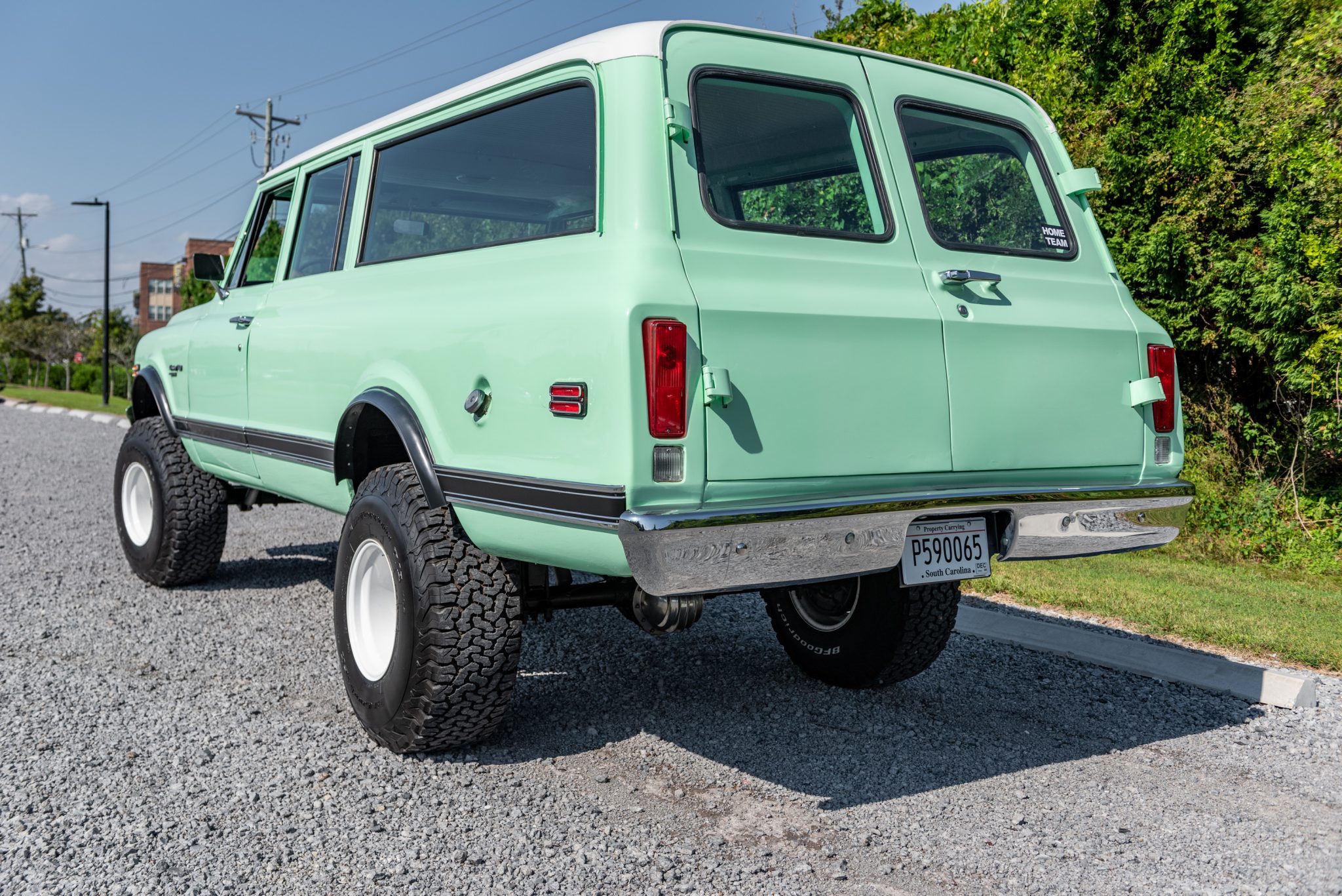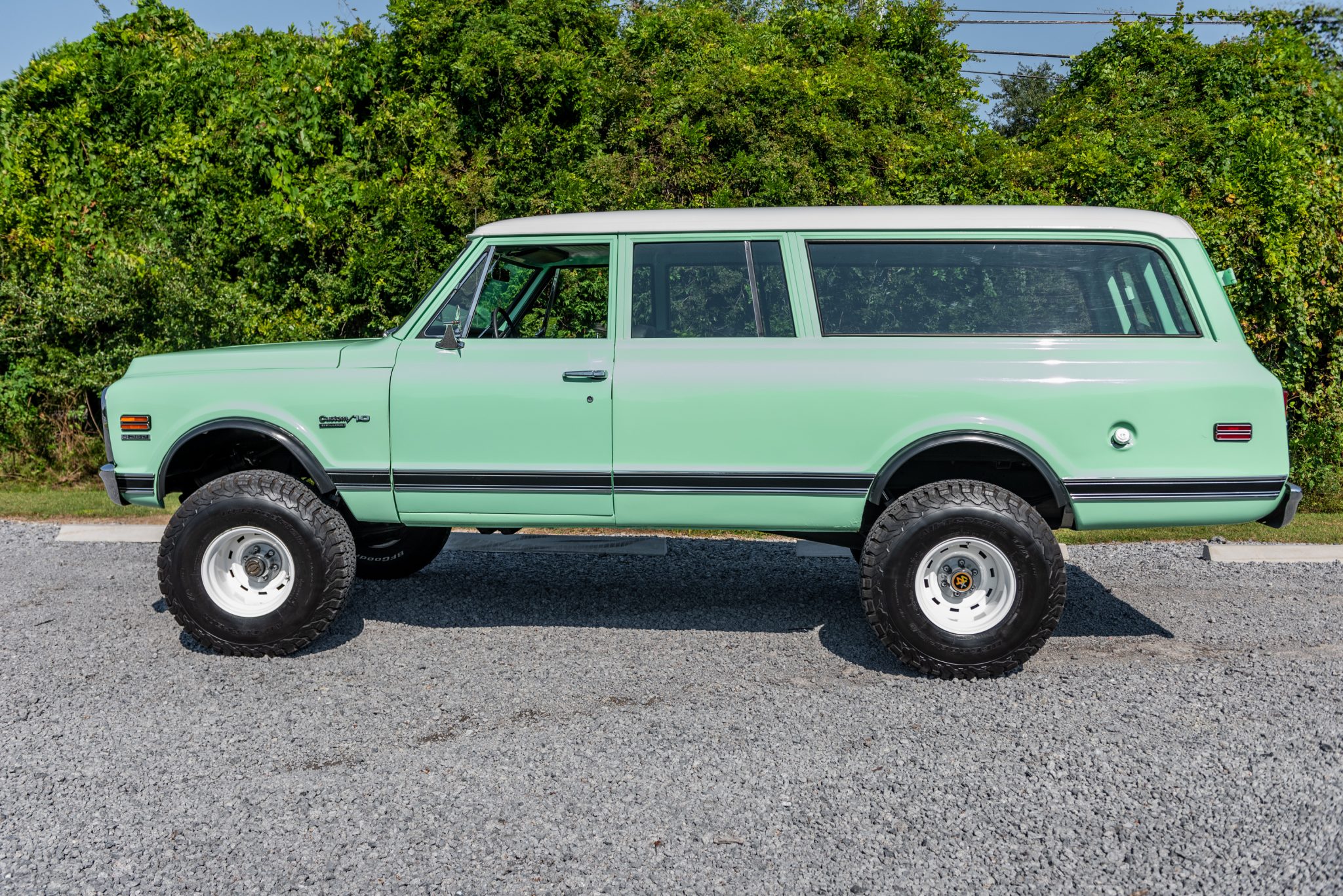 15″ steel wheels are finished in white and wrapped in 35×12.5″ BFGoodrich All-Terrain T/A tires. Braking is handled by power-assisted front discs and rear drums, and a Rough Country lift is installed along with dual steering stabilizers and Rough Country shocks.