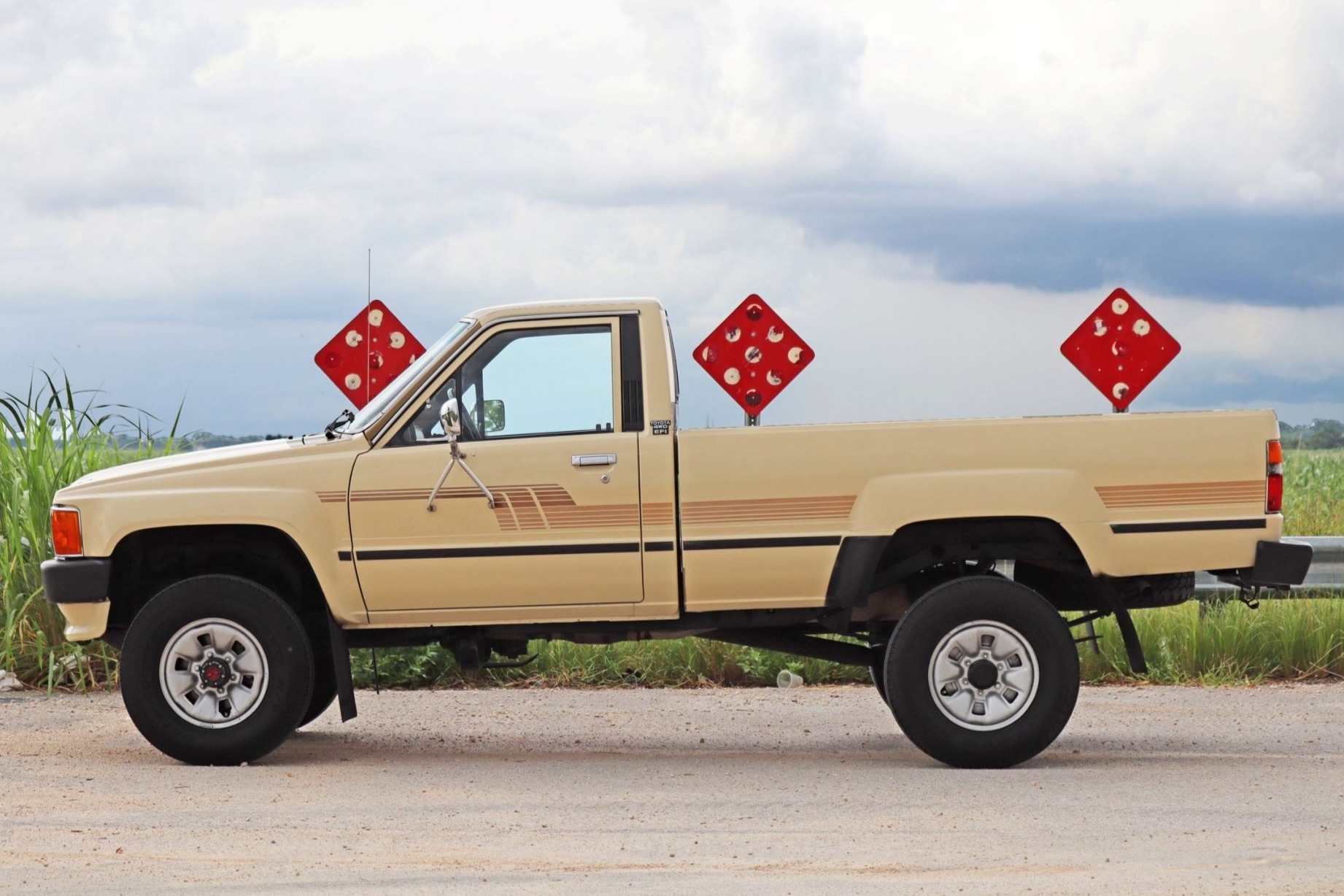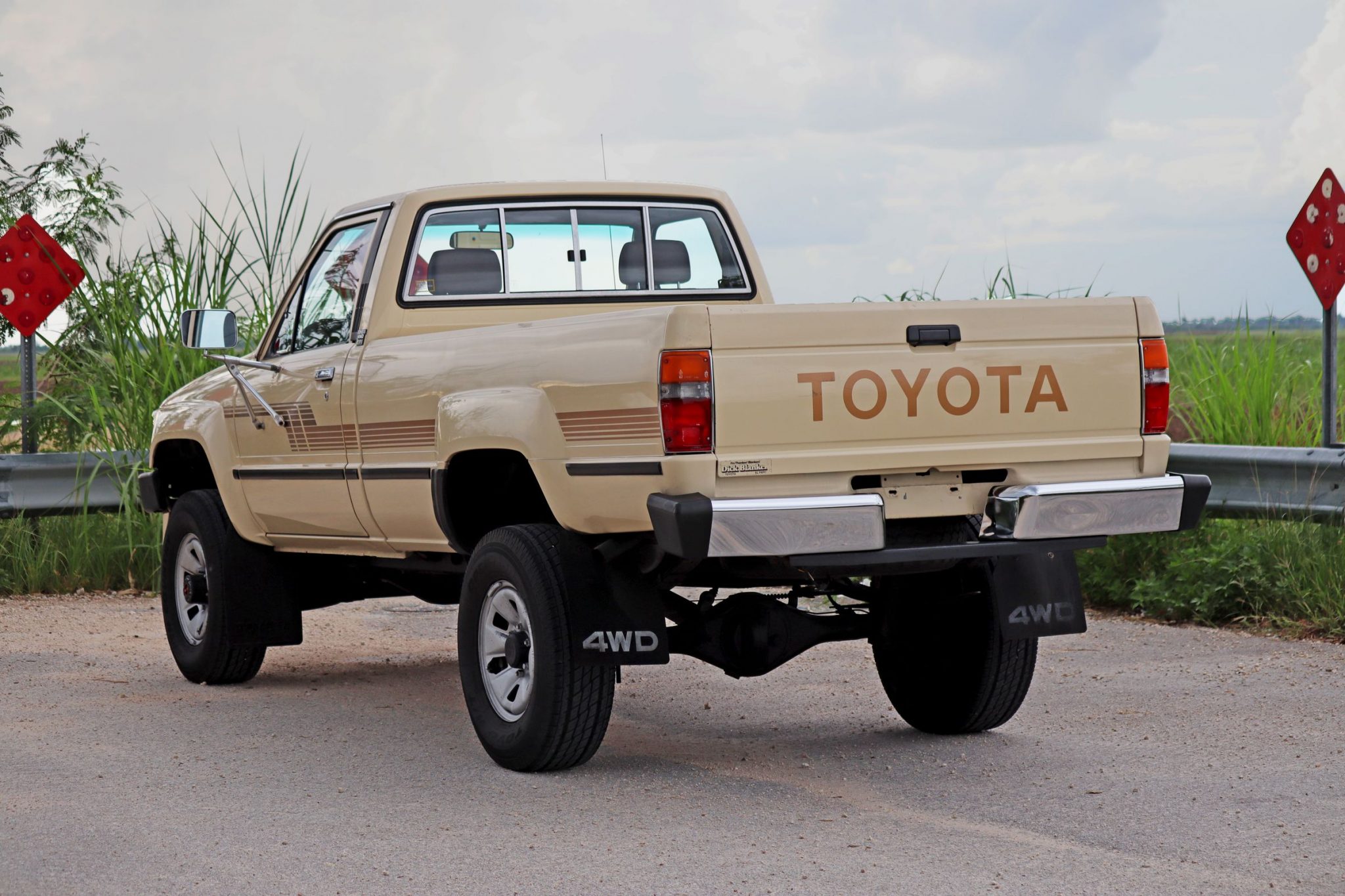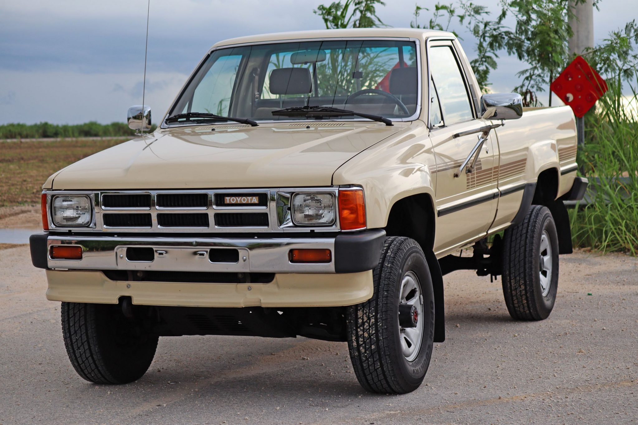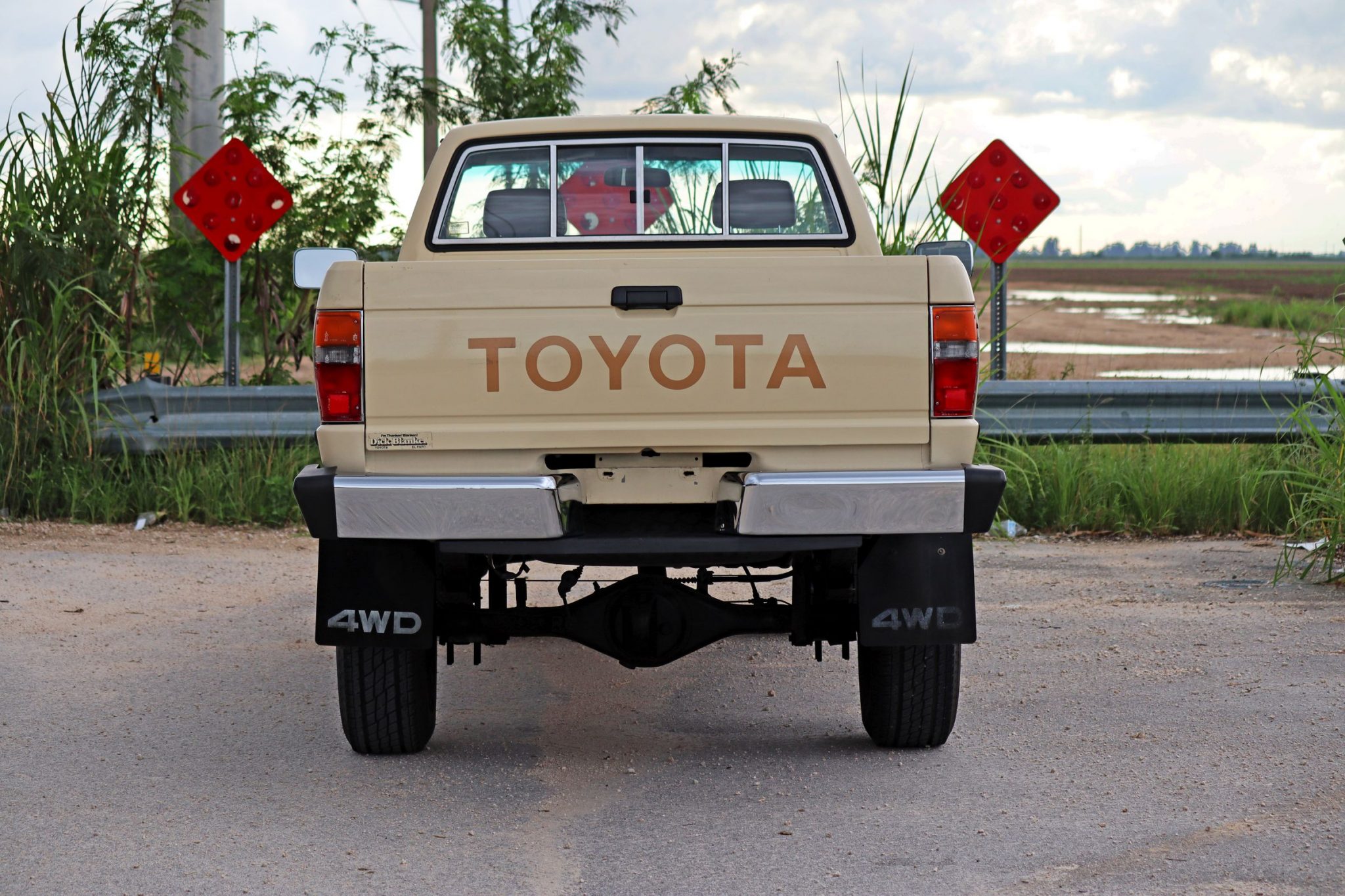 Factory 15″ wheels are wrapped in Toyo Open Country A/T tires sized 235/75. The truck is equipped with power-assisted front disc brakes and drums out back.