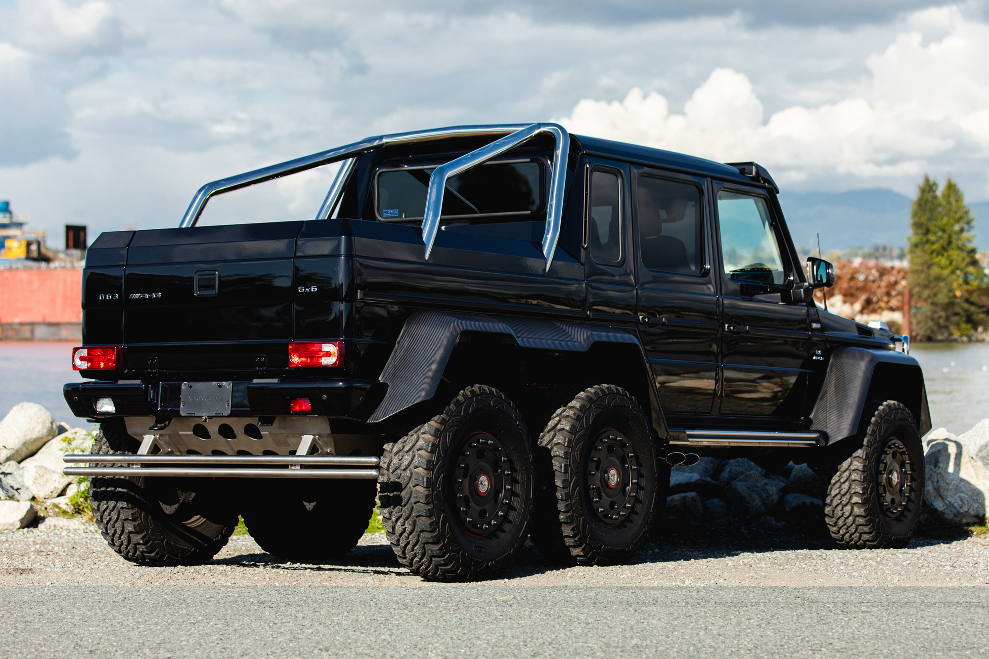 The 6×6 features a built-in air compressor with in-cabin controls that can inflate or deflate tires based on terrain. Öhlins gas bypass shocks were standard equipment, along with stiffer springs and heavy-duty bump stops compared to the dual-axle G63.