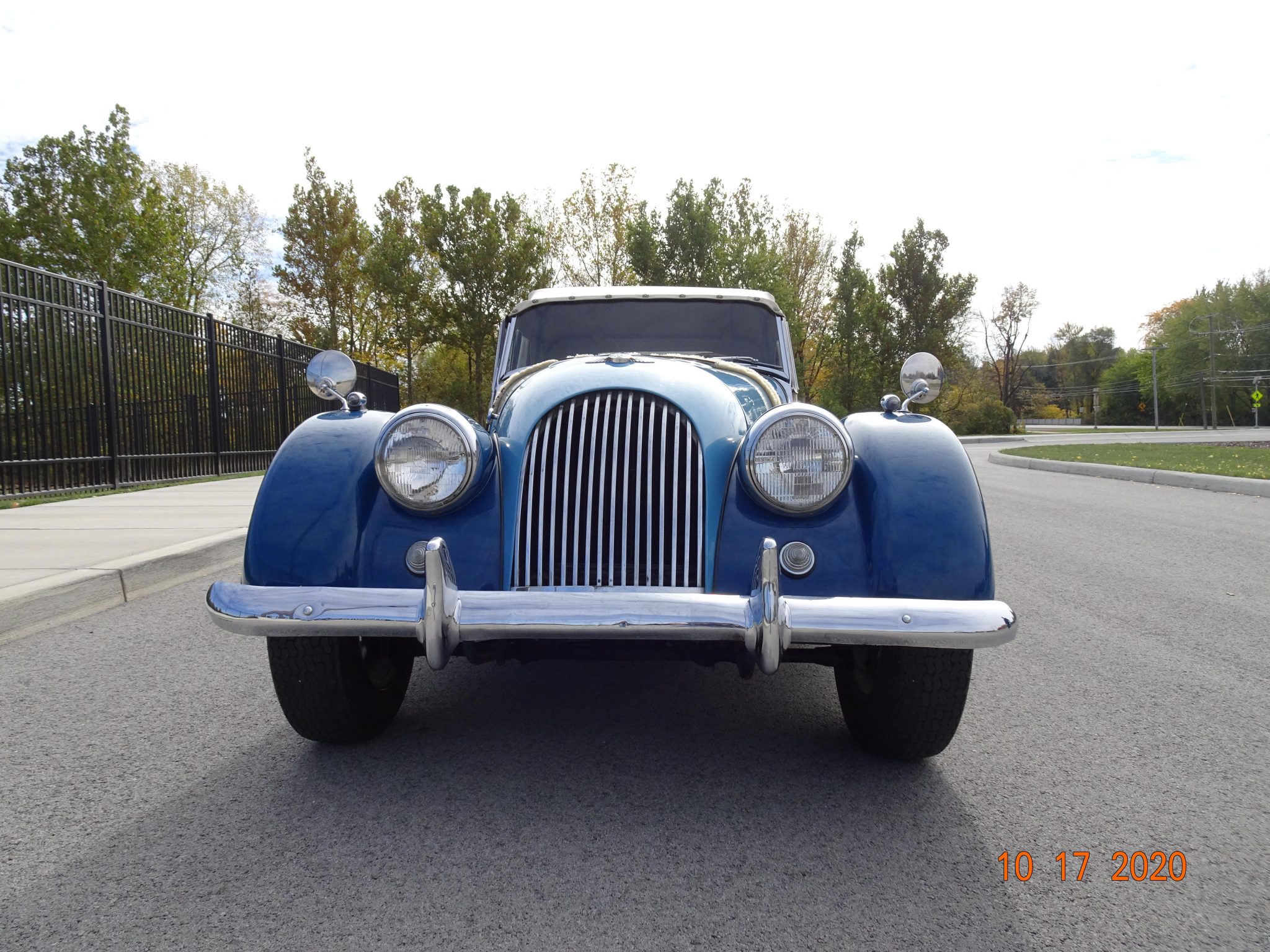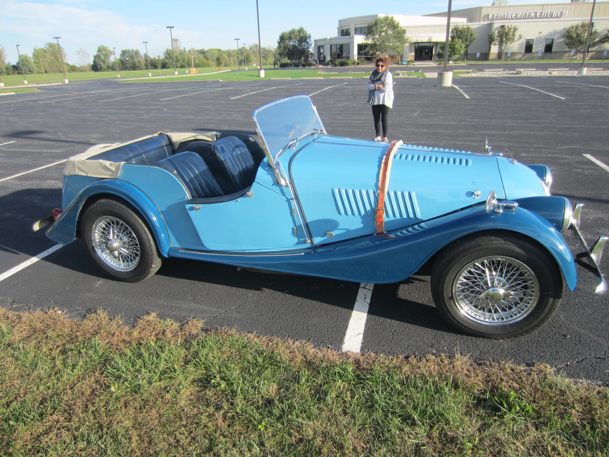 Chrome knock-off wire wheels are mounted with rear Michelin XZX 165/SR15 tires that were installed in 2020 and front Dunlop SP 165HR15 tires. A matching spare wheel is mounted out back. Additional 2020 service reportedly included new wheel cylinders, rear brake shoes, new braided metal lines at all four corners, and a bleeding of the brake system.
