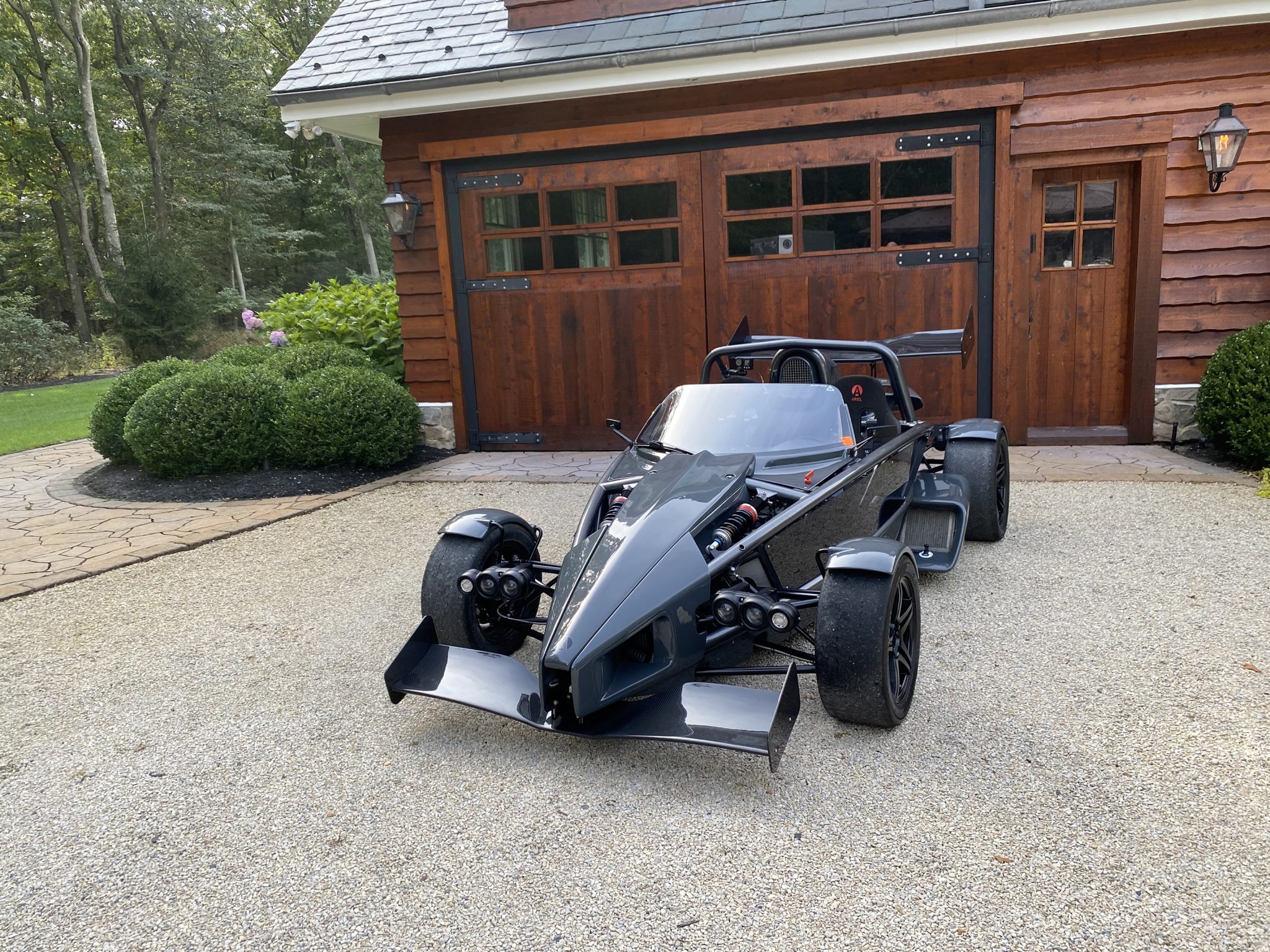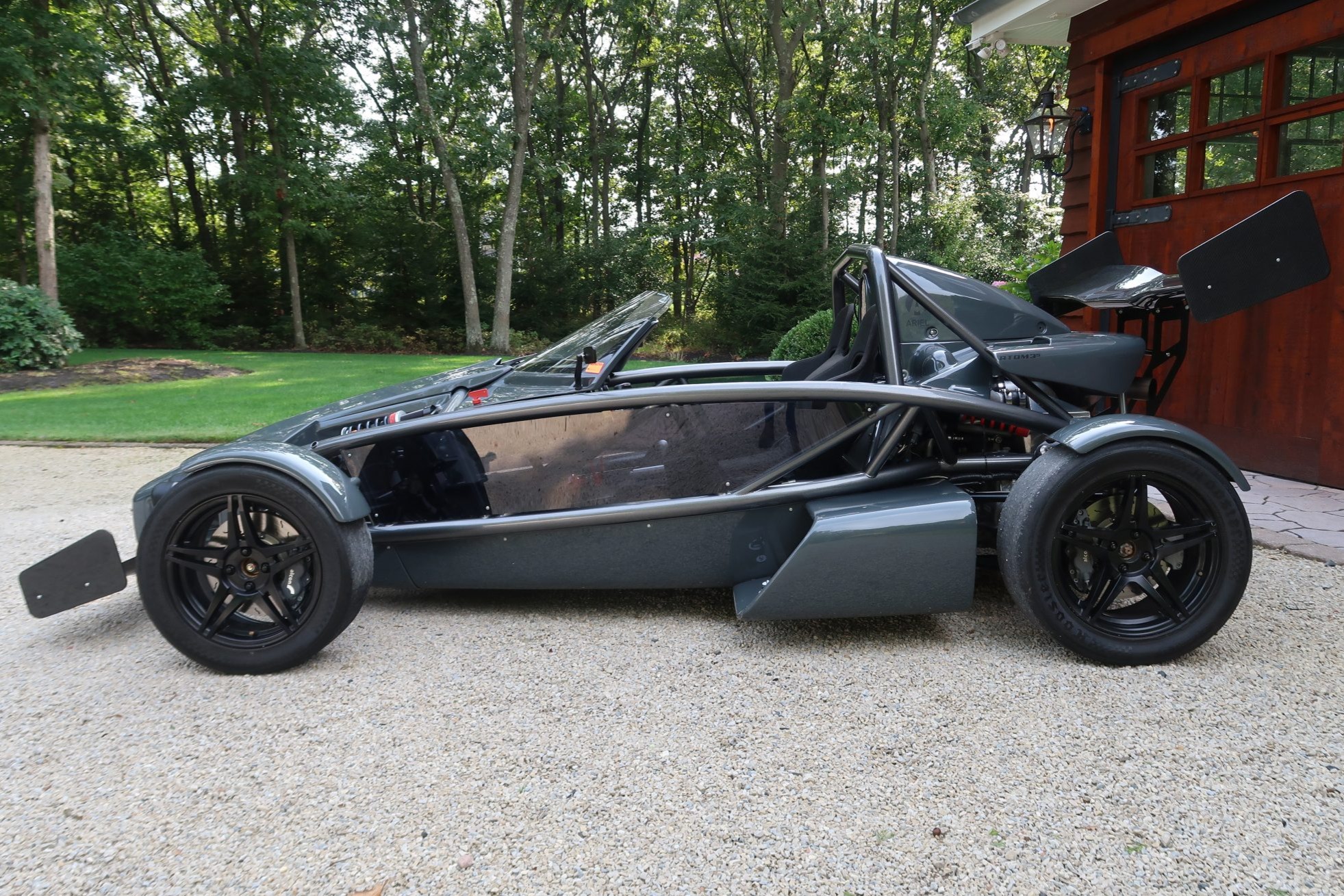 Black-painted wheels wear Hoosier slicks measuring 245/45/16 out back and 205/50/15 up front. Braking is handled by four-piston Alcon calipers over slotted rotors at each corner, and a Tilton bias adjuster is located in the cockpit. A June 2020 service performed by Bodymotion in Ocean Township, New Jersey included a track inspection, wheel and tire balancing, and replacement of the valve stems.