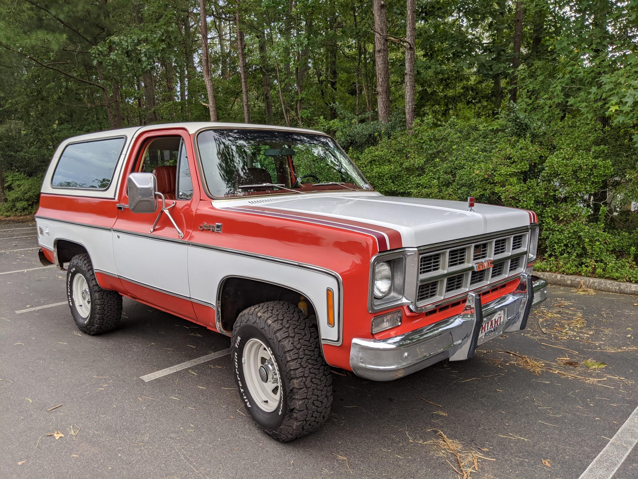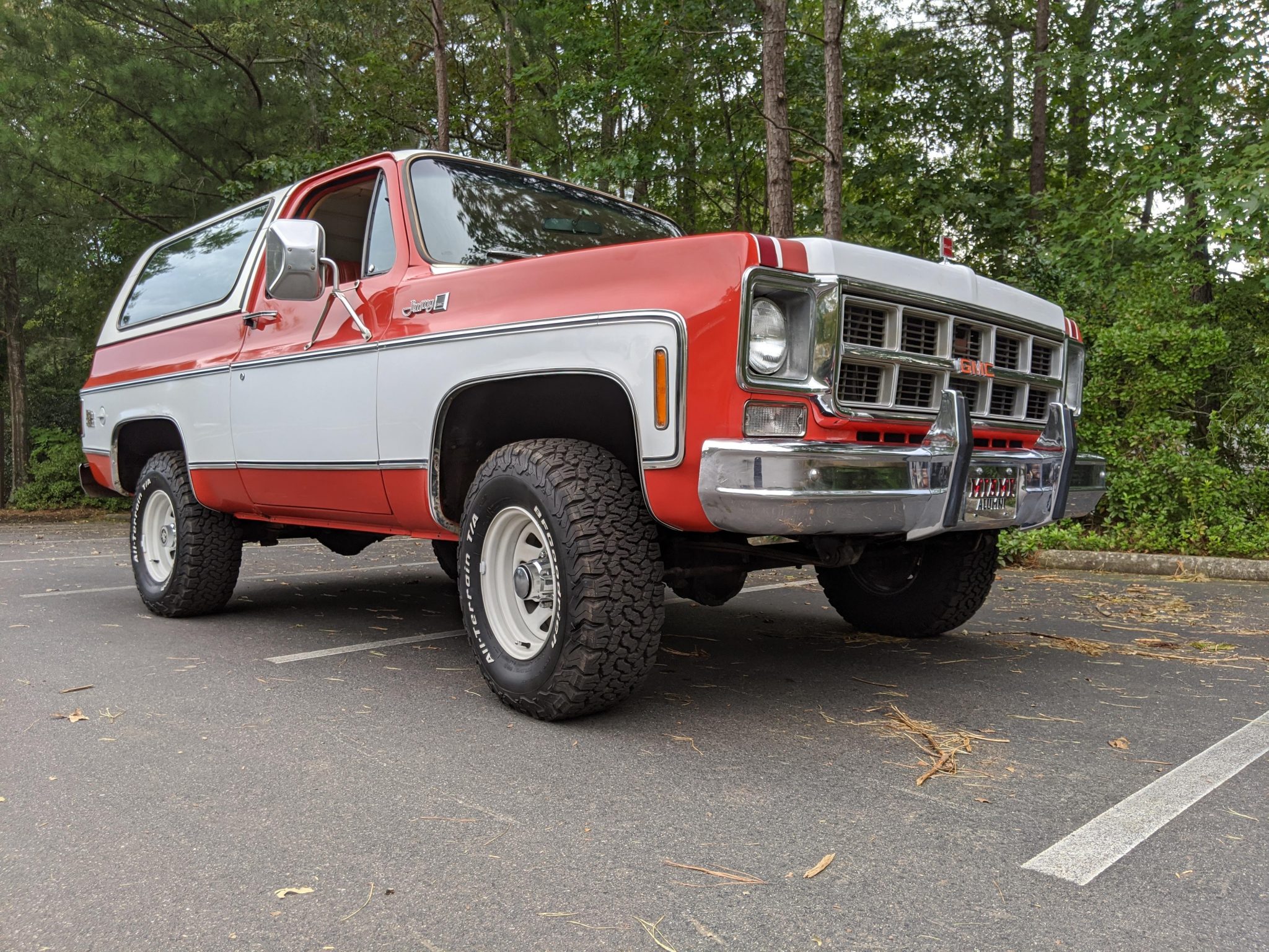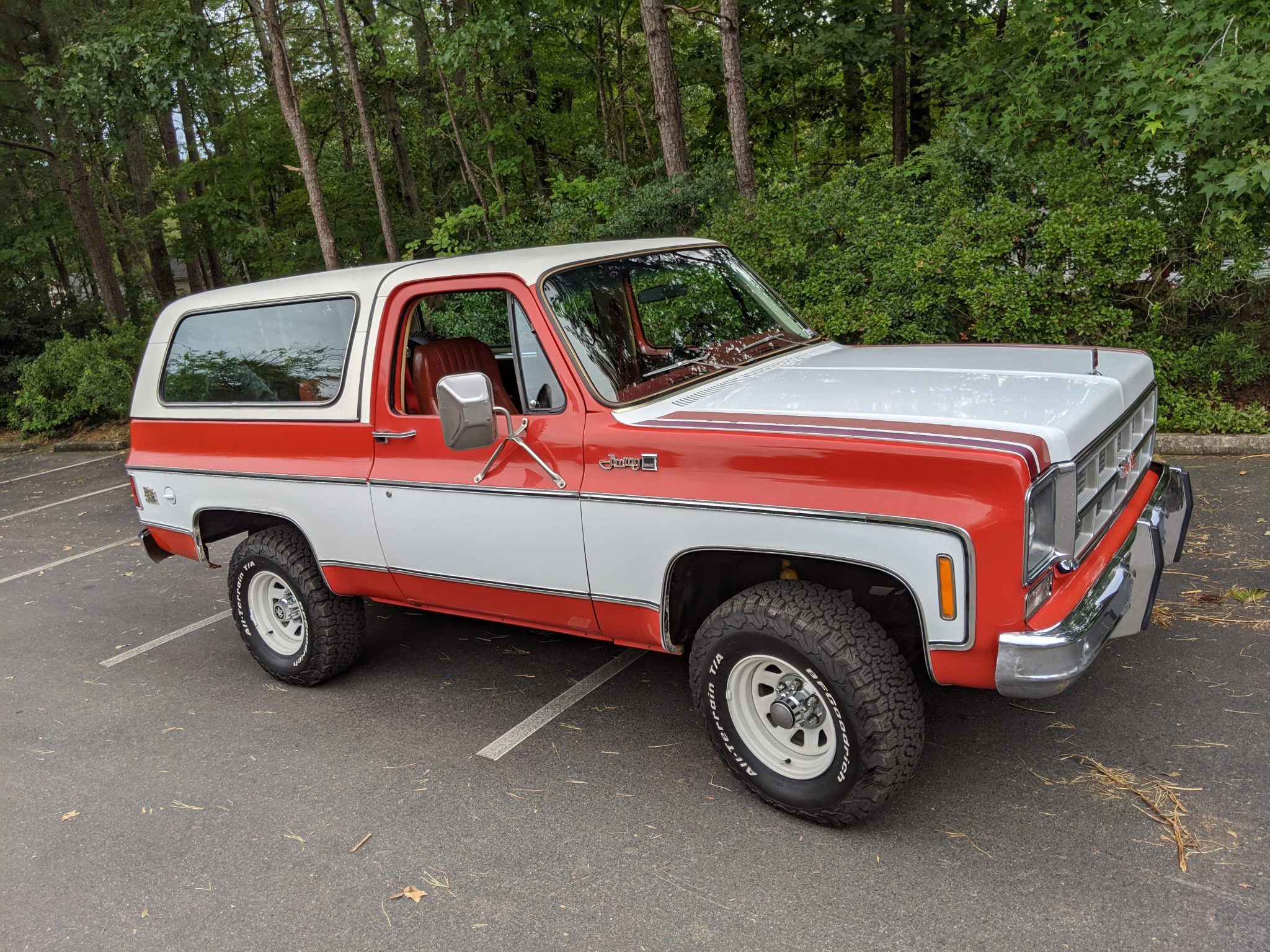 White-painted 15″ General Motors PA6 Sport steel wagon wheels wear BFGoodrich All-Terrain T/A KO2 tires that measure 31″x10.5″ and are said to have been installed in January 2019. A stock spare wheel is mounted in the cargo area, and the sale includes four stock steel wheels wearing older BFGoodrich tires, as well as a set of dog dish hubcaps and full wheel covers. The power steering pump was replaced and the steering box adjusted in January 2019.