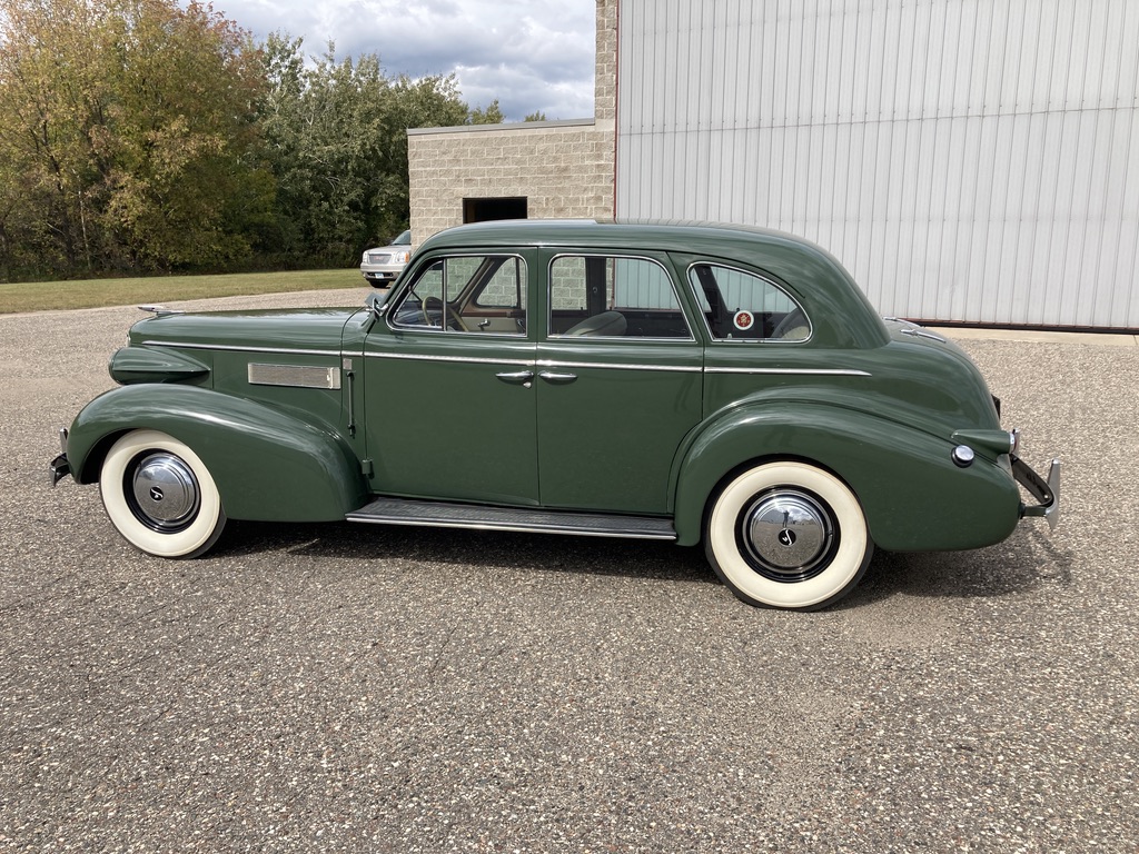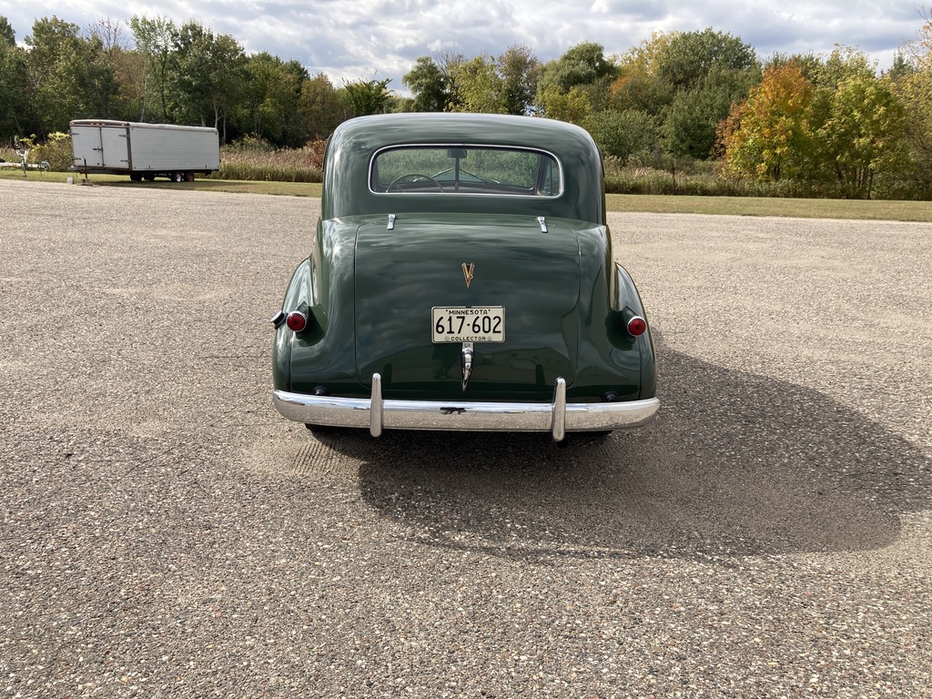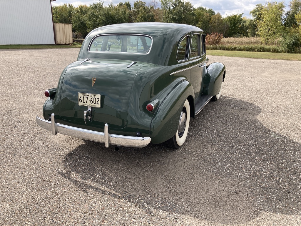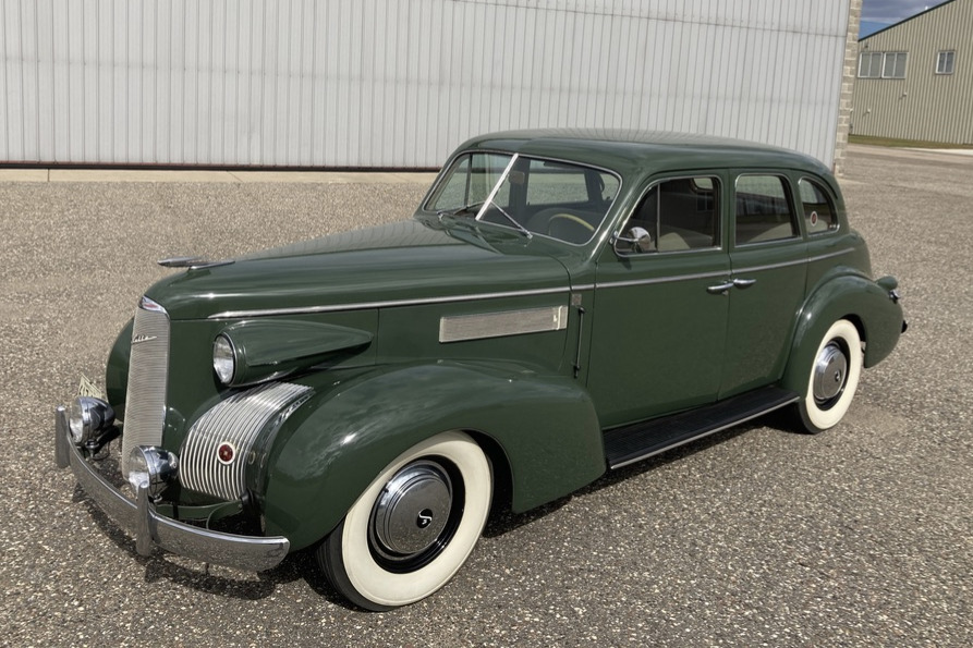 Black steel wheels are dressed with chrome LaSalle covers and mounted with wide-whitewall bias-ply tires. A spare is housed under a platform in the trunk. Suspension and steering work performed by Autocraft Specialties of Spring Lake Park, Minnesota in 2007 included rebuilds of the front and rear hydraulic shocks, replacement of tie rod ends and bushings, a steering gearbox overhaul, and more.