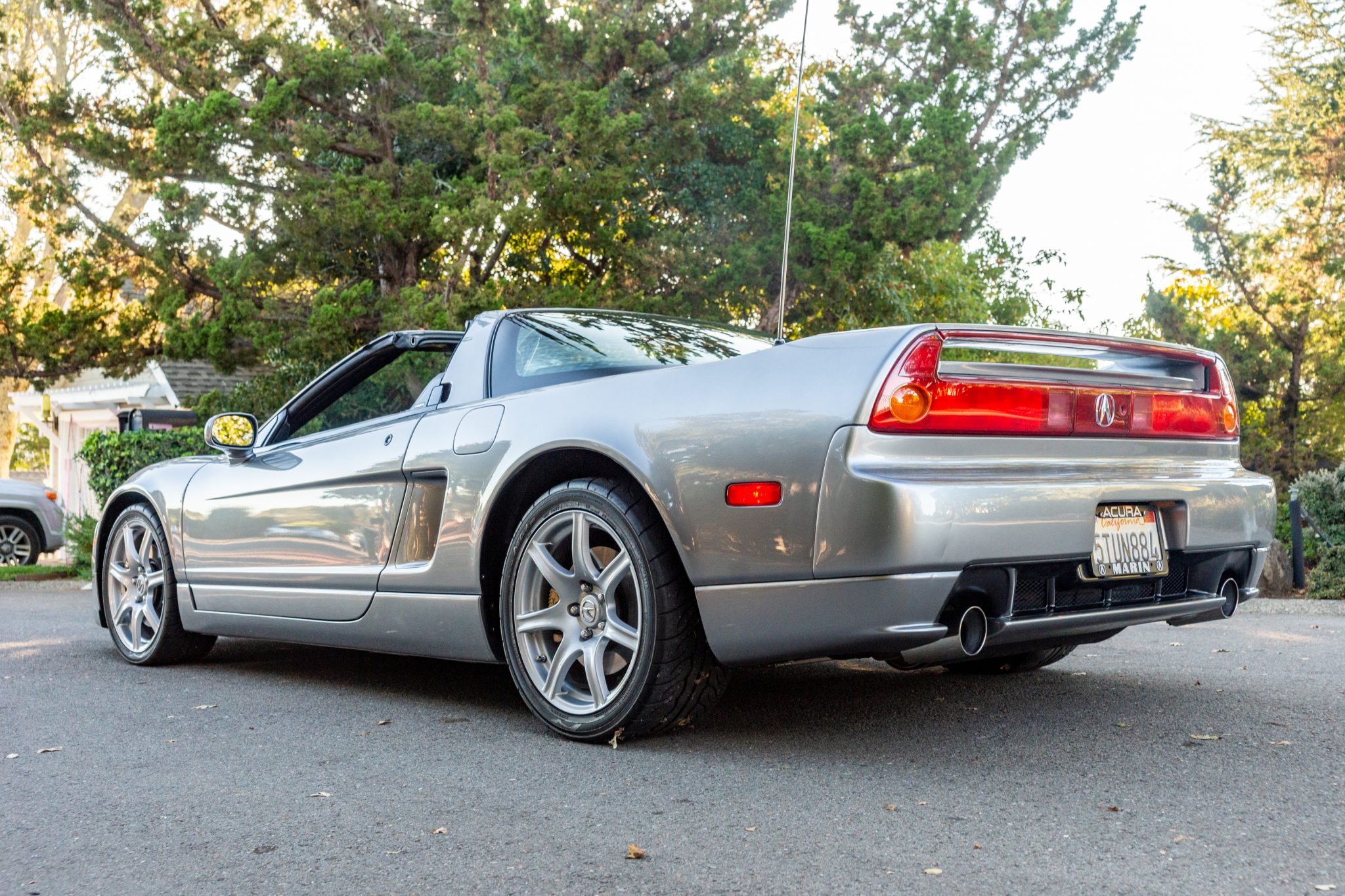 Factory 17” wheels feature Acura-caliper center caps and wear 215/40 front and 255/40 rear Yokohama Advan Neova tires. The four-wheel disc brakes feature NSX-branded calipers all around. Curb rash is present on three of the wheels.