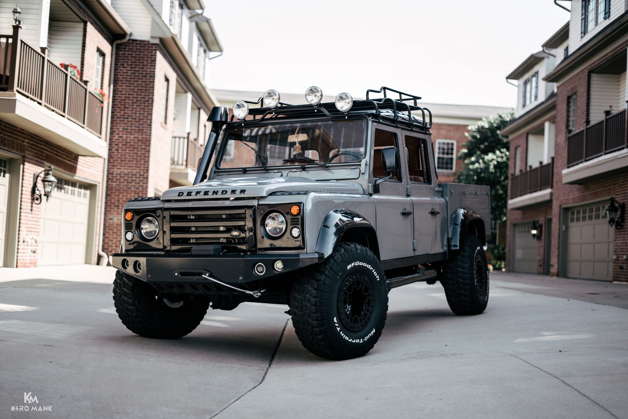 Black aftermarket wheels wear 33″ BFGoodrich Mud-Terrain T/A tires, including the spare mounted in the bed.