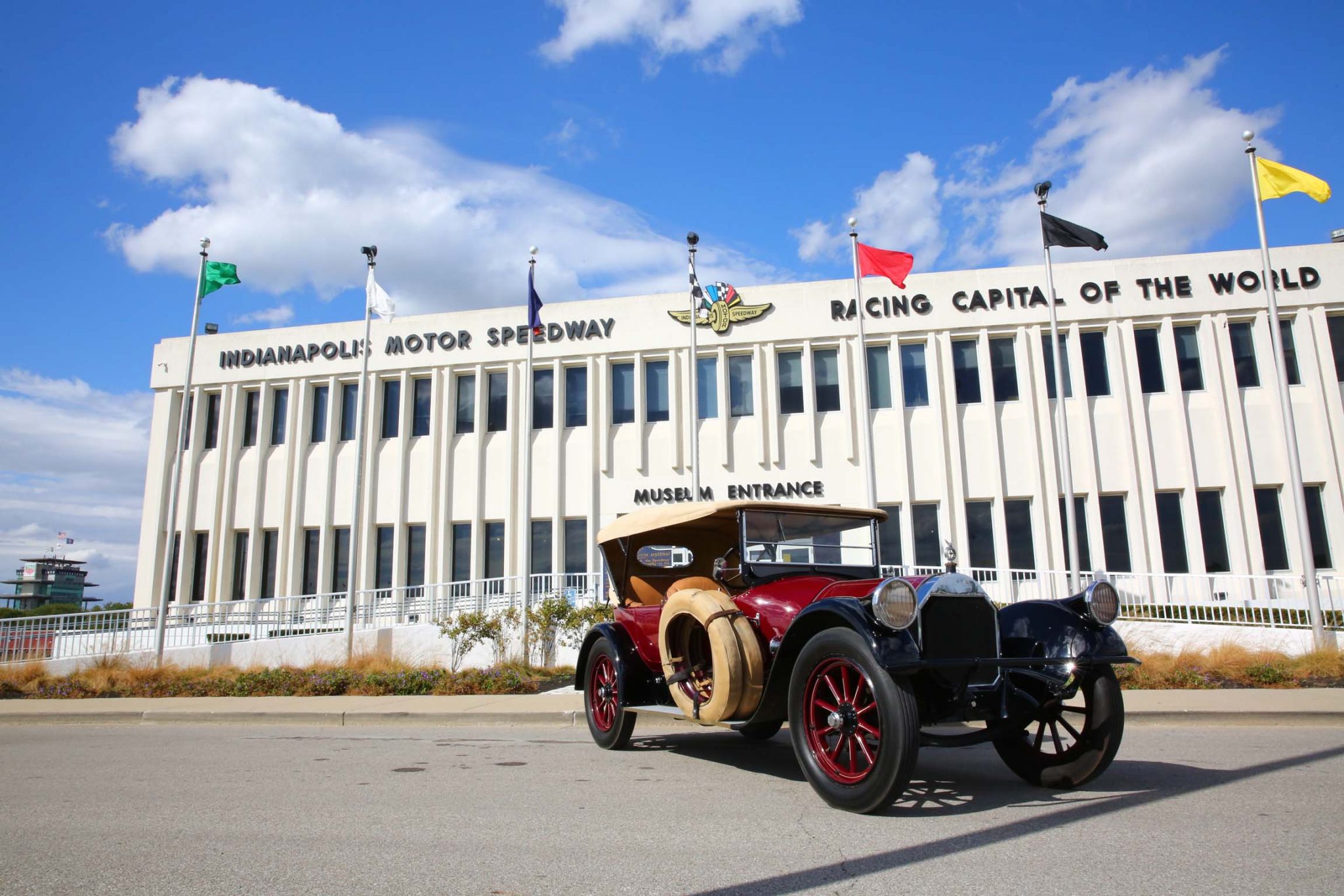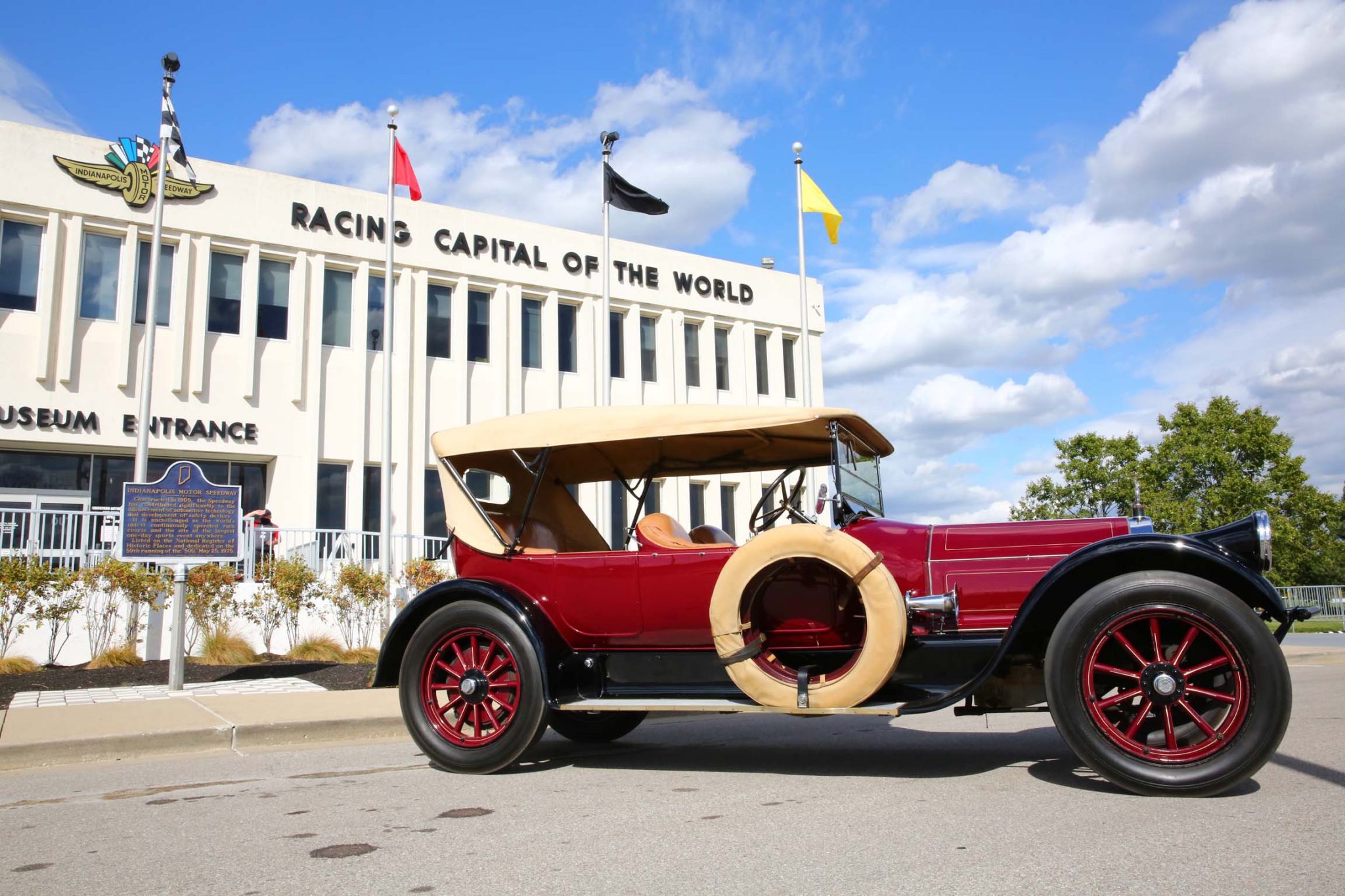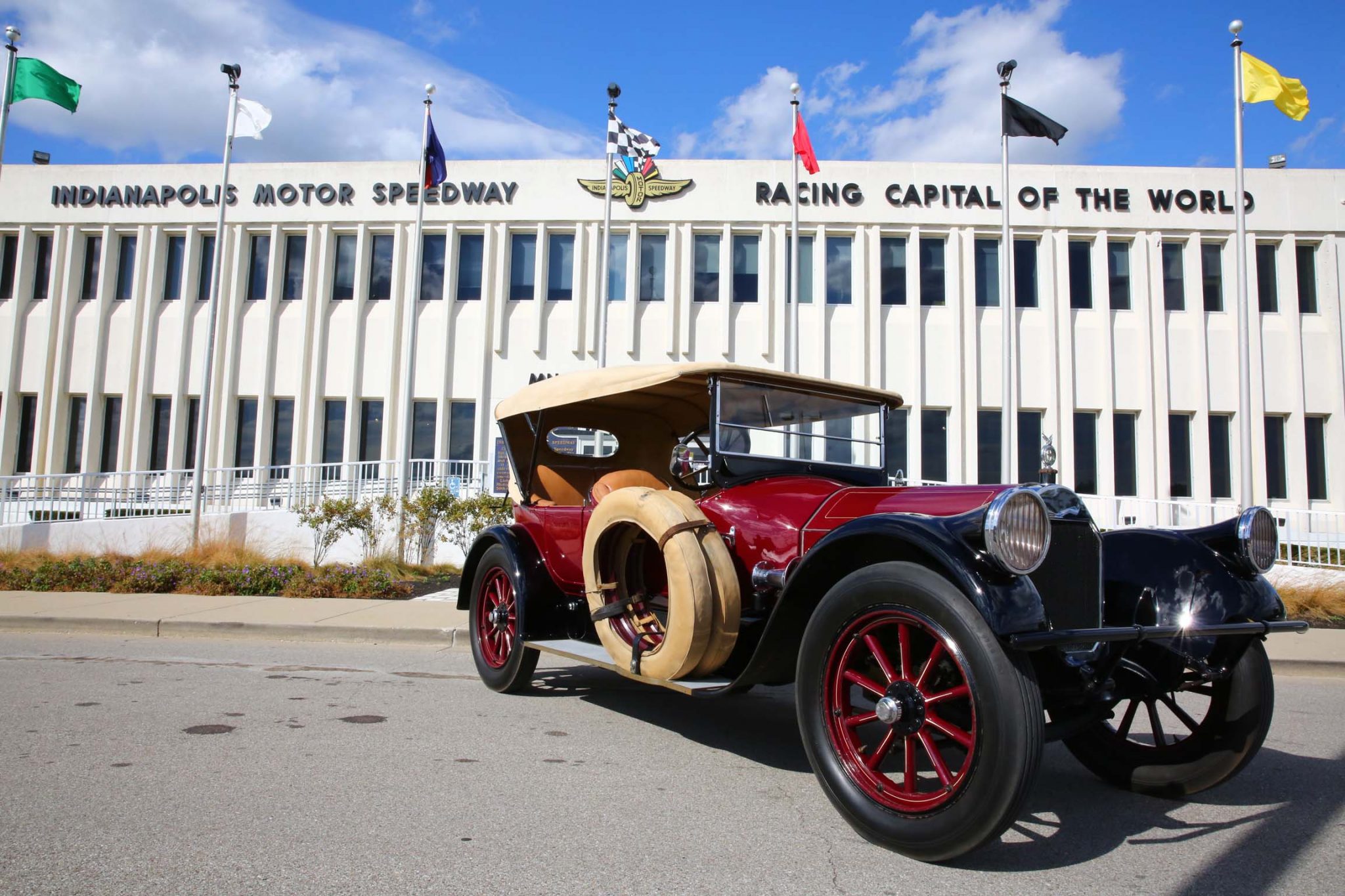 The car features a 132″ wheelbase and rides on body-colored wood-spoke wheels wearing 35×5 bias-ply rubber from Gehrig Tire Company. Two matching spare rims with covered tires are mounted on the passenger-side running board. Braking is handled by mechanically-operated rear drums. The chrome has rubbed off on the right side of the radiator shell and staining is noted on the tan soft top.