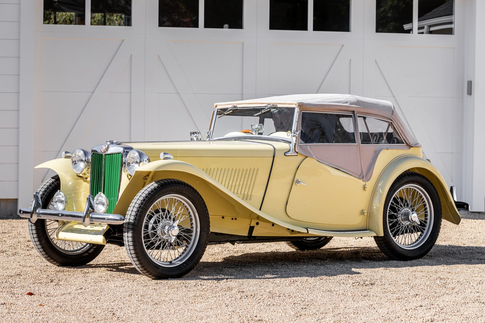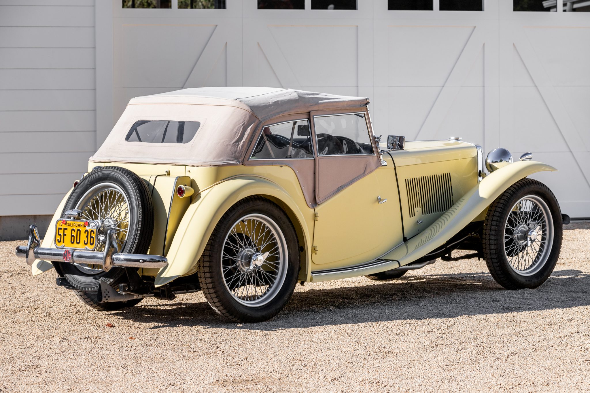 Painted 19″ wire wheels are equipped with two-eared knock-off spinners and are mounted with Ensign Triple tires that were reportedly installed in September 2020. Braking is handled by drum brakes at all four corners, and the car is equipped with a live-axle suspension with semi-elliptical leaf springs. The brakes were inspected and the rear brakes adjusted in October 2020 per the seller.