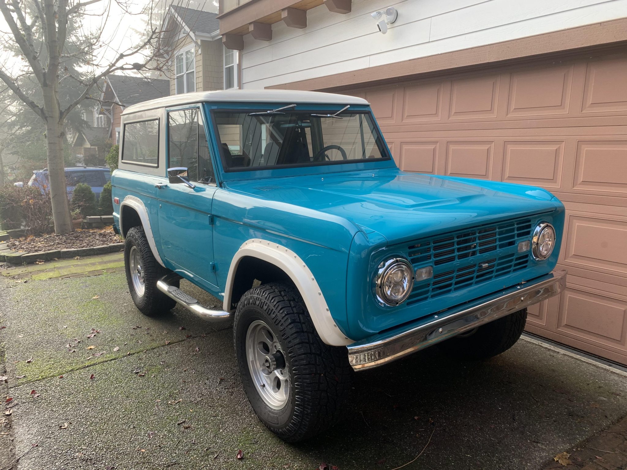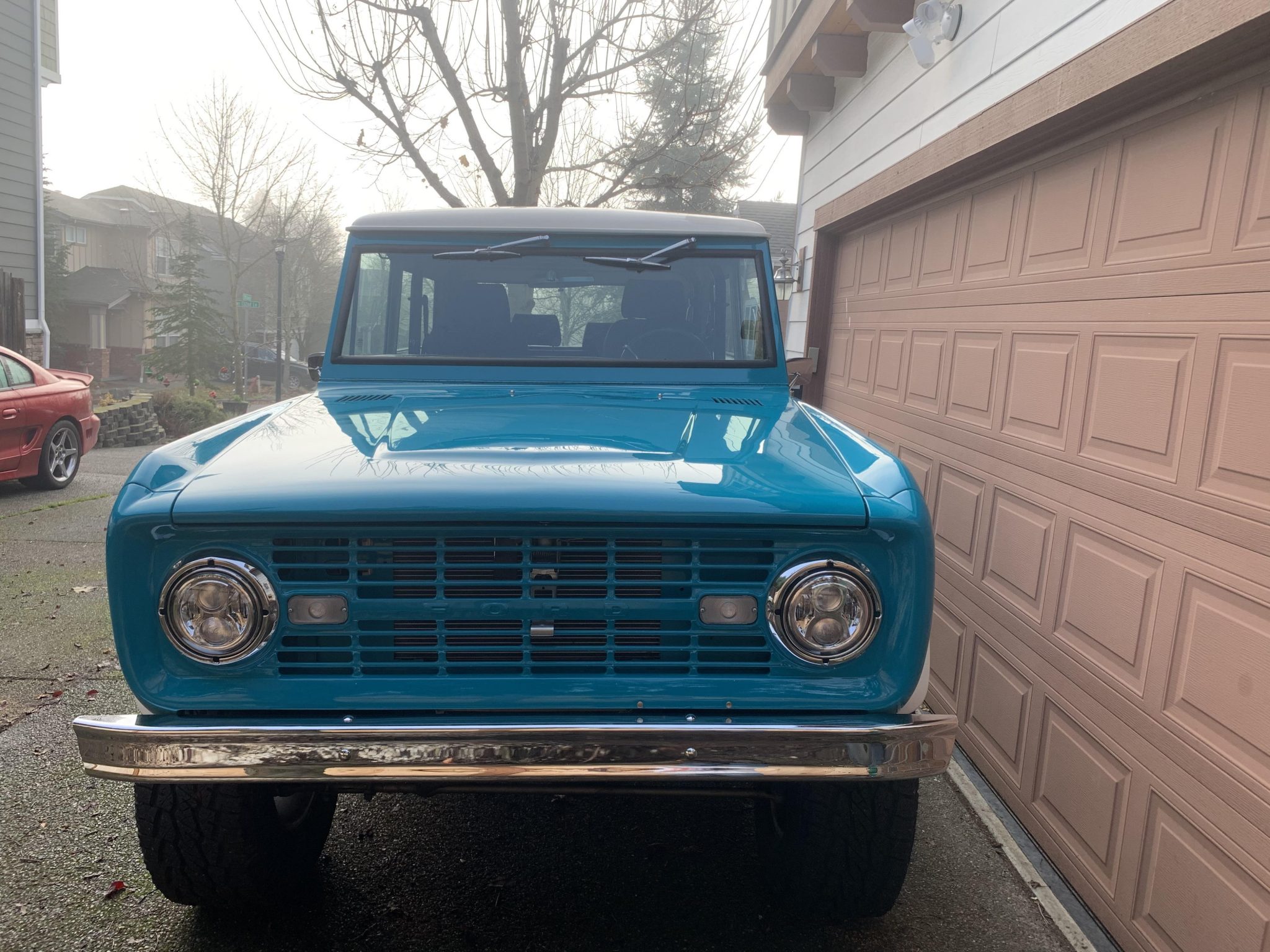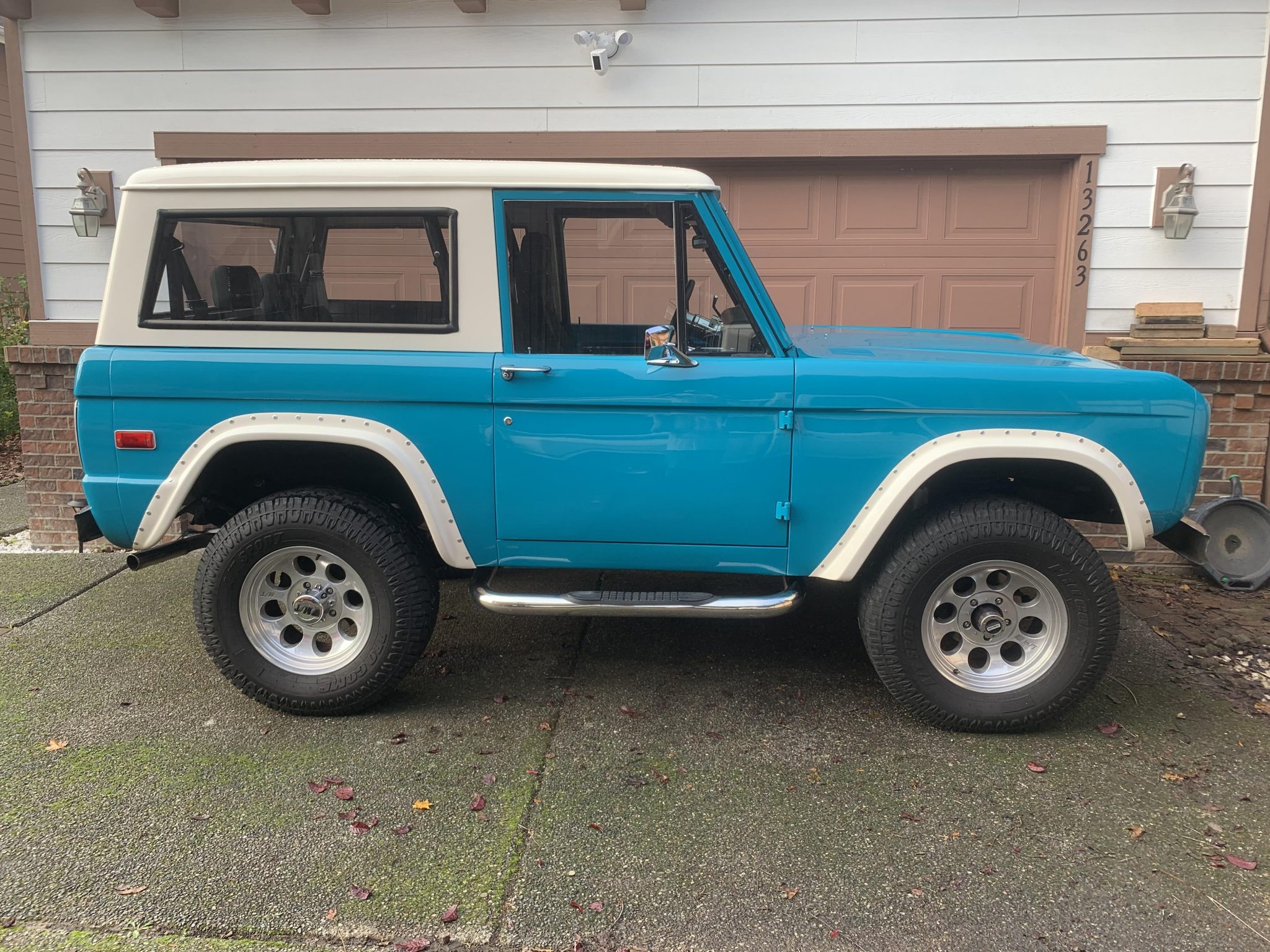 Polished 17″ Mickey Thompson wheels are wrapped in 285/70 Pro Comp A/T Sport tires. The front axle is equipped with Warn manually locking hubs, and the suspension is said to include replacement shocks, bushings, ball joints, and wheel bearings. Four-wheel disc brakes are installed including replacement braided stainless steel lines, and the steering system has been upgraded with power assist and a modern-style steering damper.