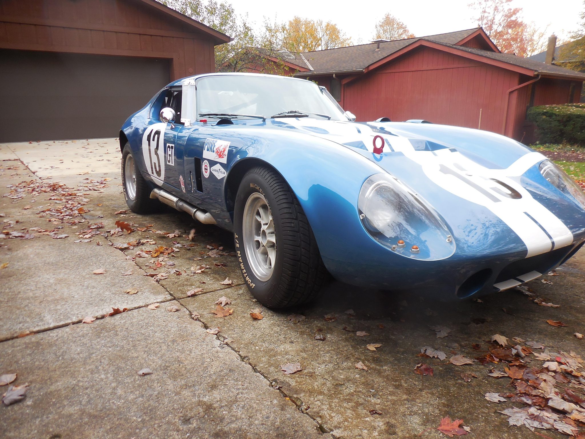 Staggered-width PS Engineering 15″ GT40 wheels wear Mickey Thompson Sportsman S/T raised white letter tires, and the seller states a spare set of wheels mounted with American Racer slicks are included in the sale. The suspension includes Eibach coilover springs with Koni adjustable dampers at all four corners and adjustable sway bars, while braking power is supplied by Wilwood four-wheel discs with Hawk brake pads and a cockpit-mounted proportioning valve. The seller states that the brake pads were recently replaced.
