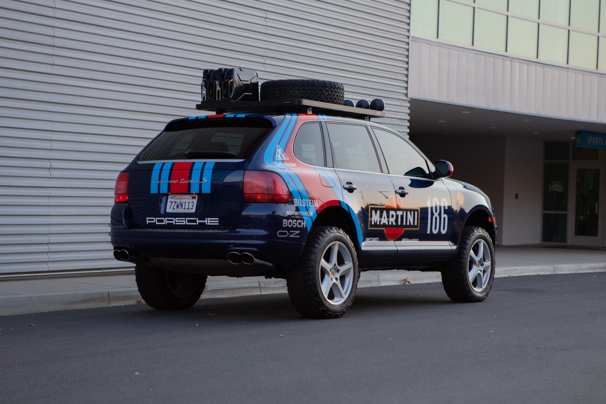 20″ SportTechno wheels feature Porsche center caps and wear BFGoodrich All-Terrain T/A K02 tires showing 2019 date codes. A matching spare wheel and tire are mounted to the roof rack, and the seller states that the ride-height sensors have been modified to lift the factory air suspension by three inches. The brake fluid was flushed in November 2019.