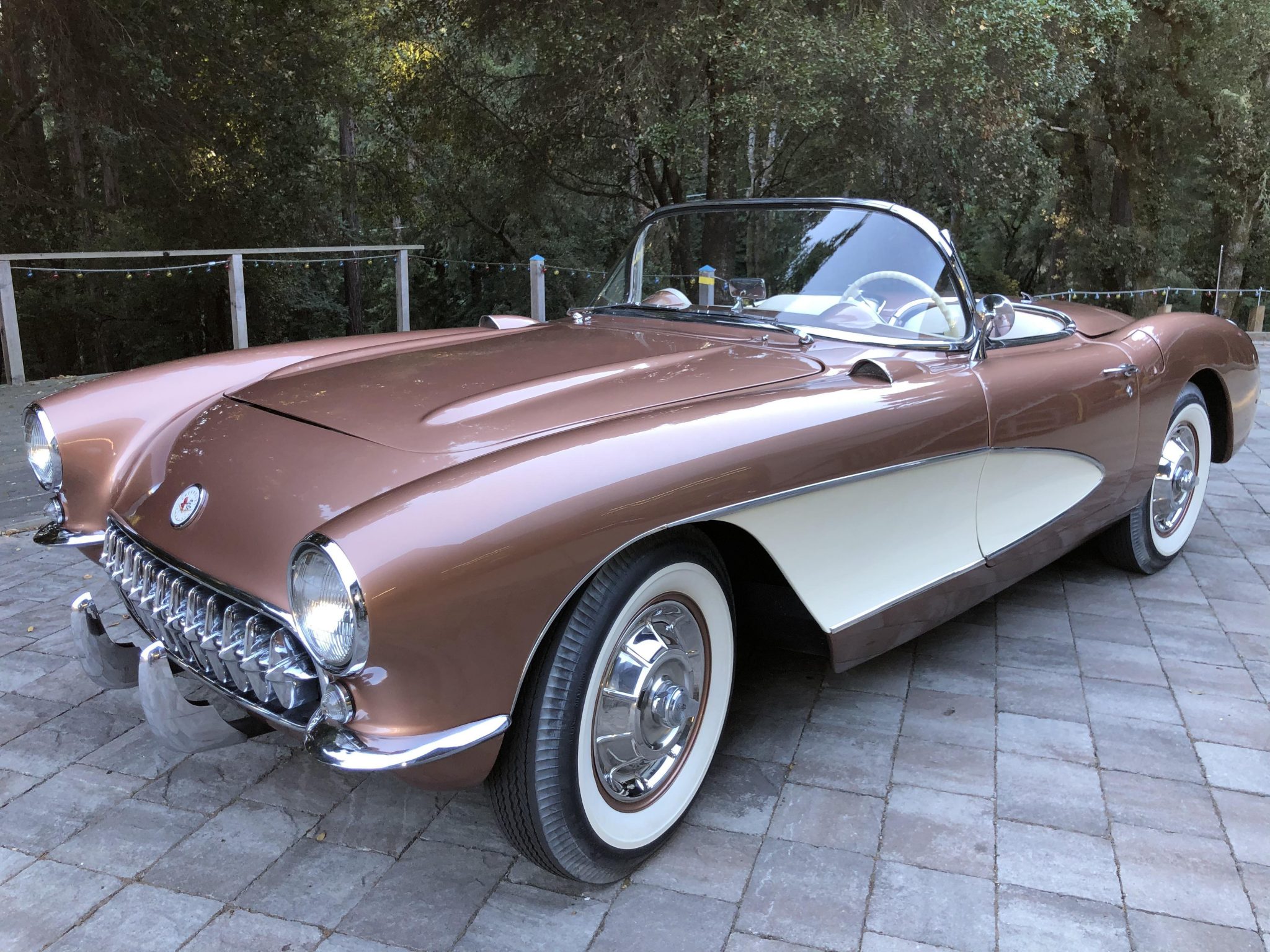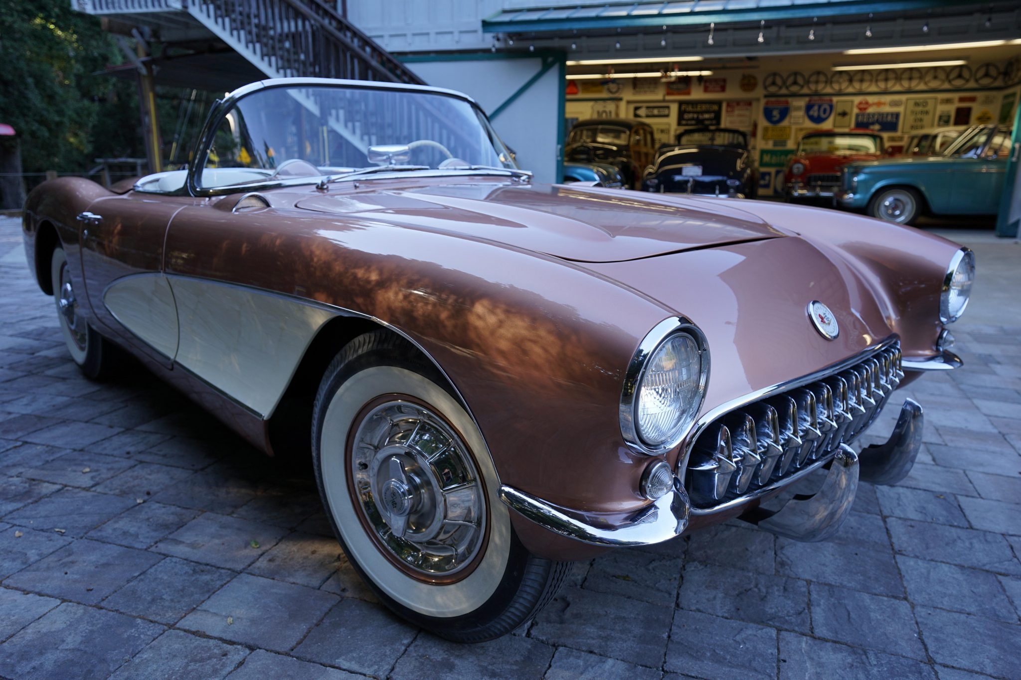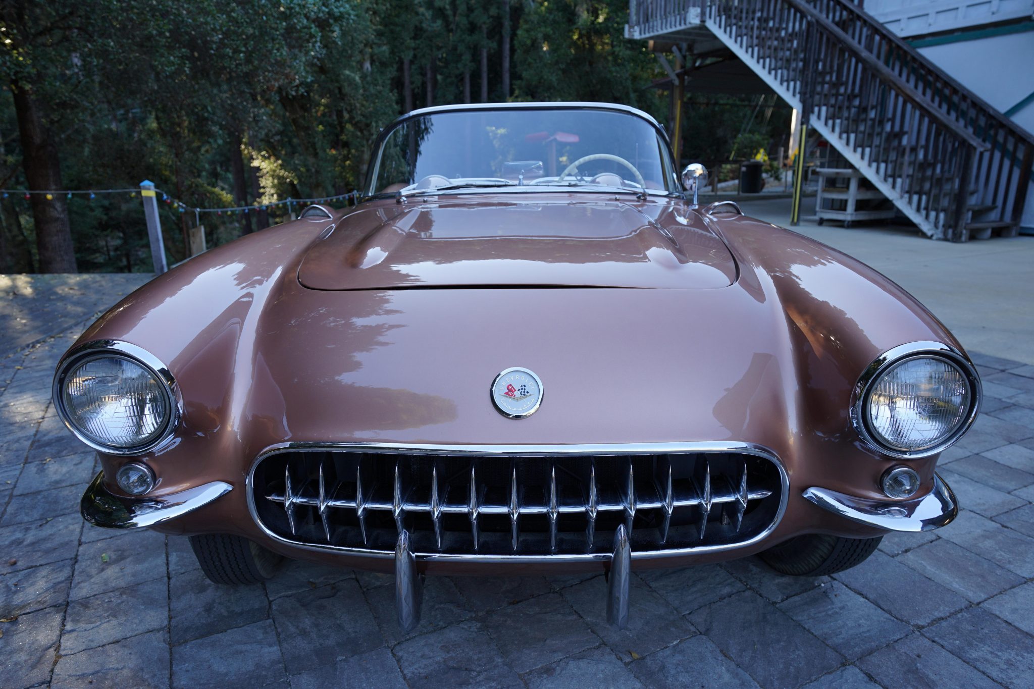Body-color 15″ steel wheels are mounted with spinner hubcaps and wear Firestone whitewall tires.