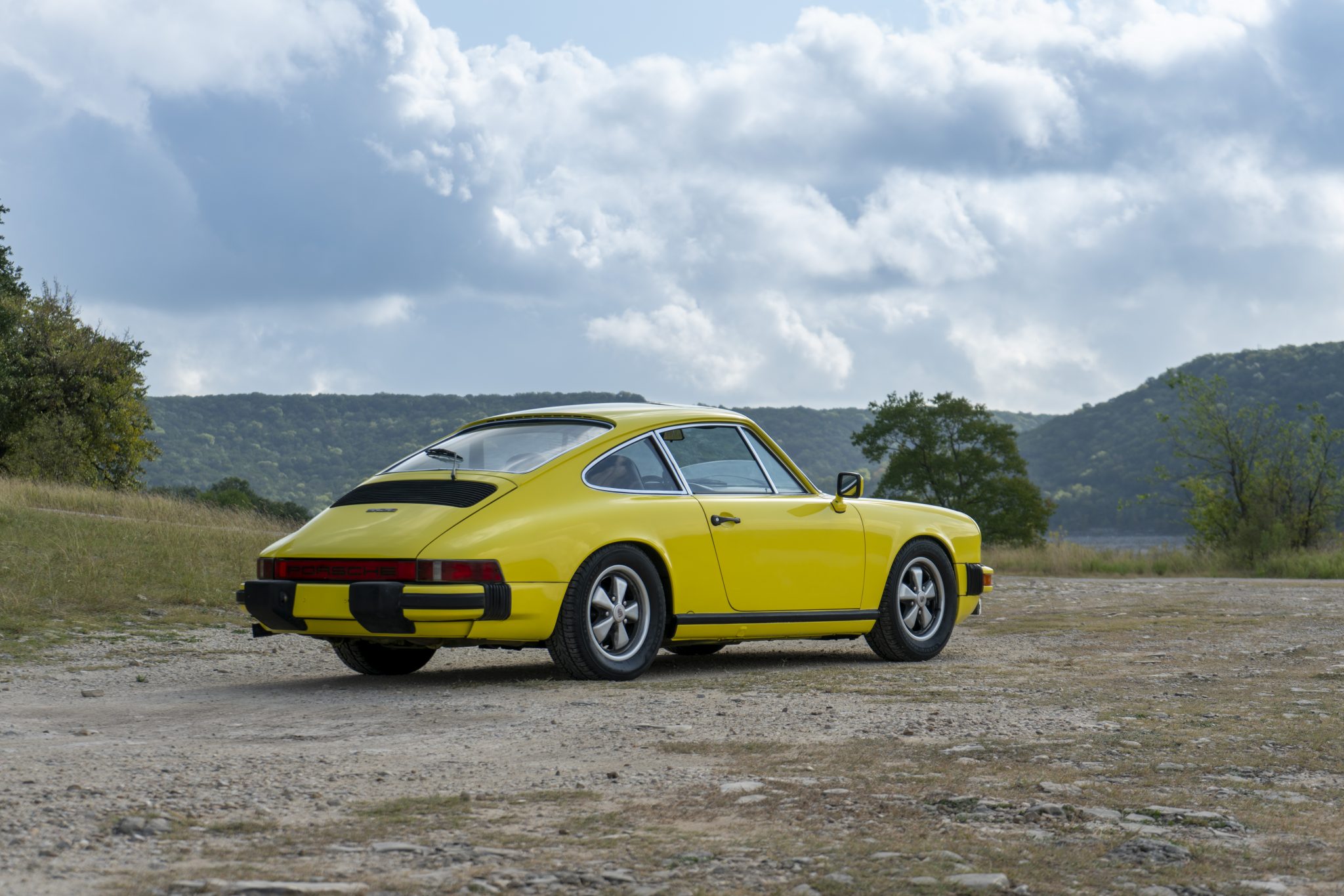 Fuchs 15″ wheels have black-painted pockets that show fading and wear 215/60 Firestone Champion HR tires. Braking power is supplied by discs at all four corners.