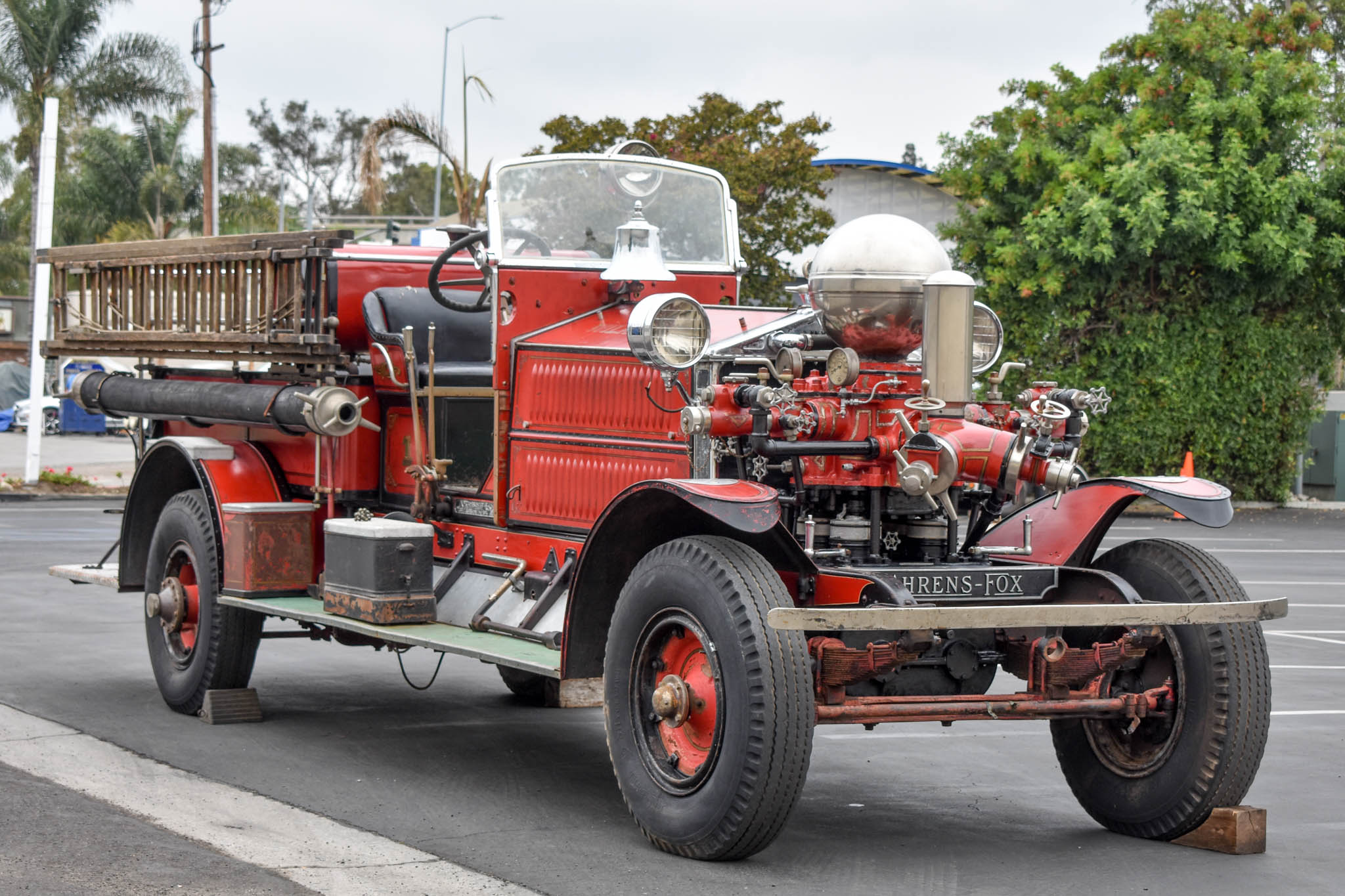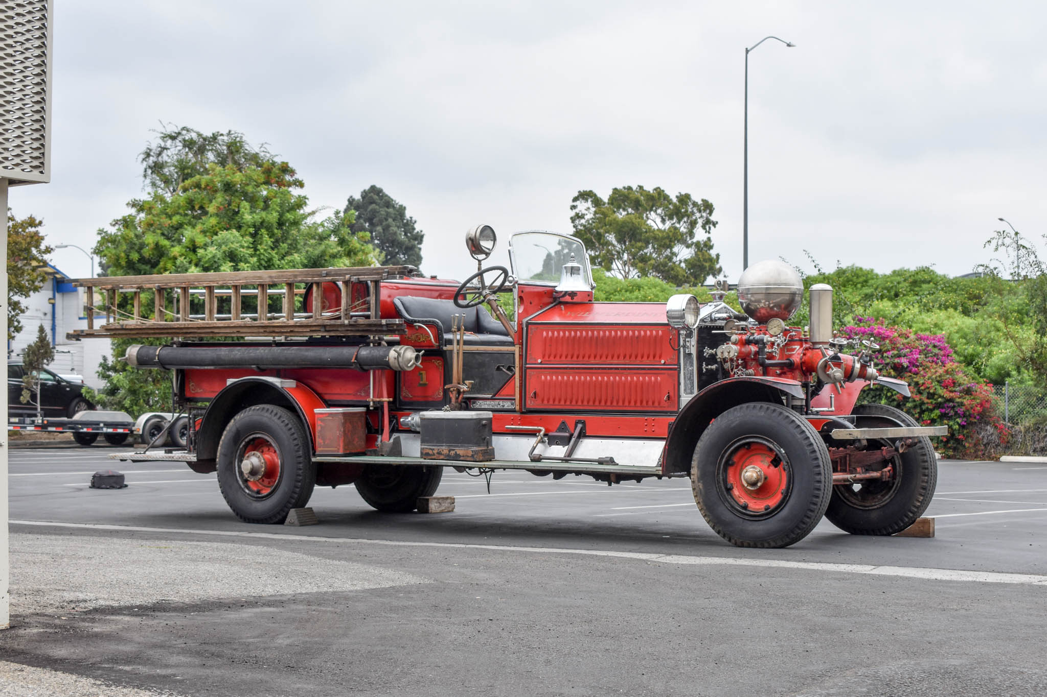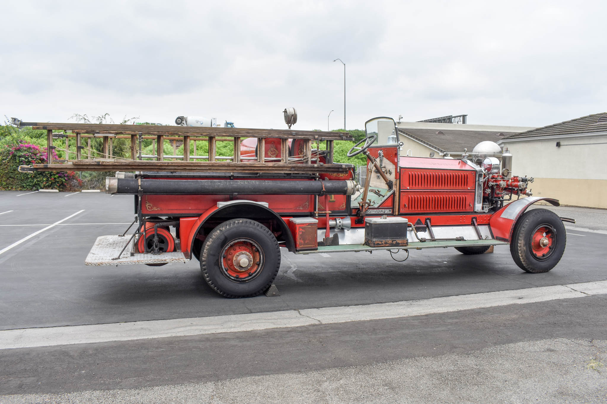 A pump motor with a polished pressure vessel is mounted forward of the radiator and was rated at 1,000 gallons per minute in period. Two-piece steel wheels are said to have replaced earlier wood versions 50 chassis earlier, and wear 9.00-20 BFGoodrich Silvertown bias-ply tires with cracked piecrust sidewalls here. The truck is also equipped with rear drum brakes in addition to a transmission emergency brake.