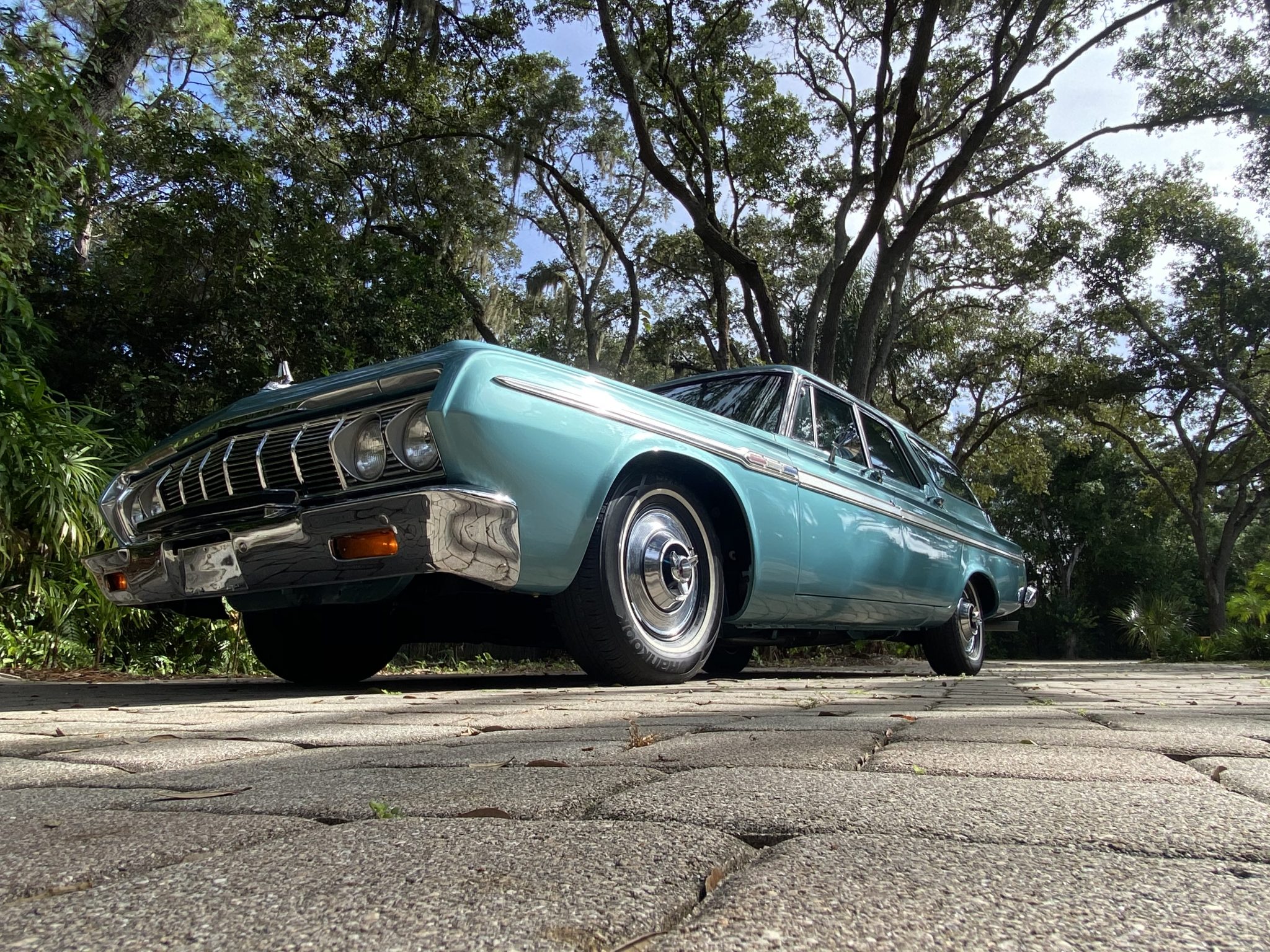 Black-painted 14″ steel wheels wear full covers and 215/75 Hankook Optimo H724 white-stripe tires. The car is equipped with a torsion bar front suspension and non-power-assisted drum brakes at all four corners.