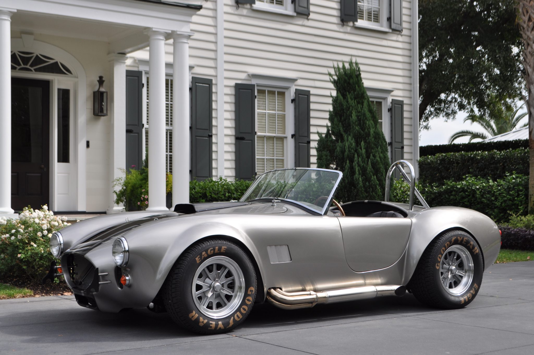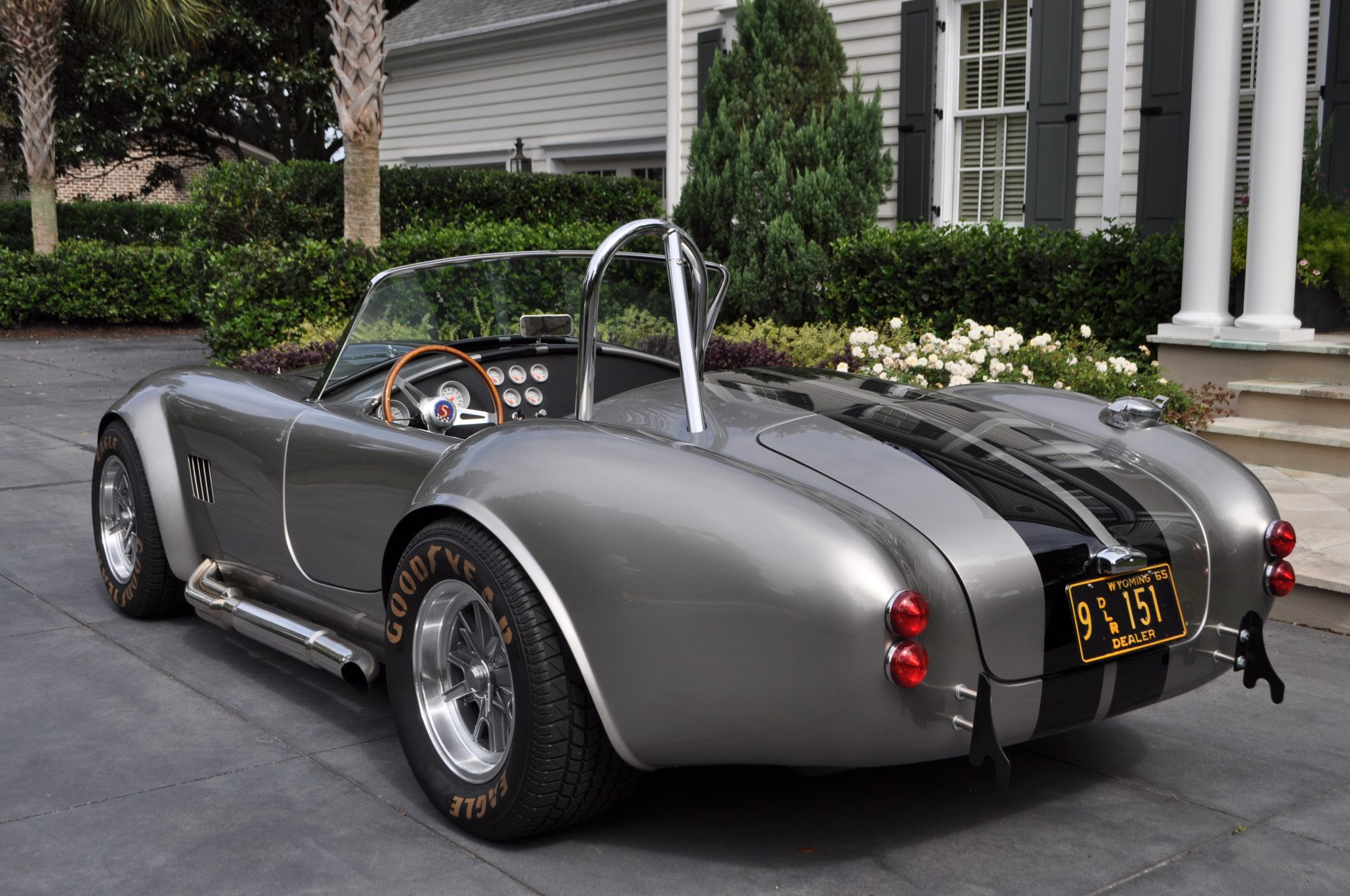 The 17″ Halibrand-style wheels wear tires with painted Goodyear Eagle stencils and are said to have been fitted within the last 200 miles. Braking is handled by power-assisted four-wheel discs, and the car is said to ride on an independent front suspension and a four-link rear suspended by Koni shocks and coilovers.
